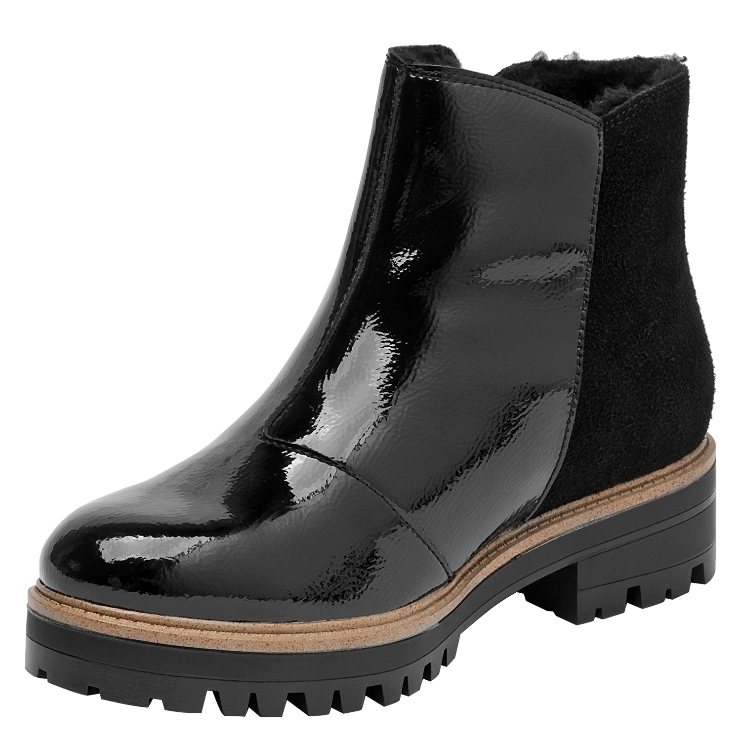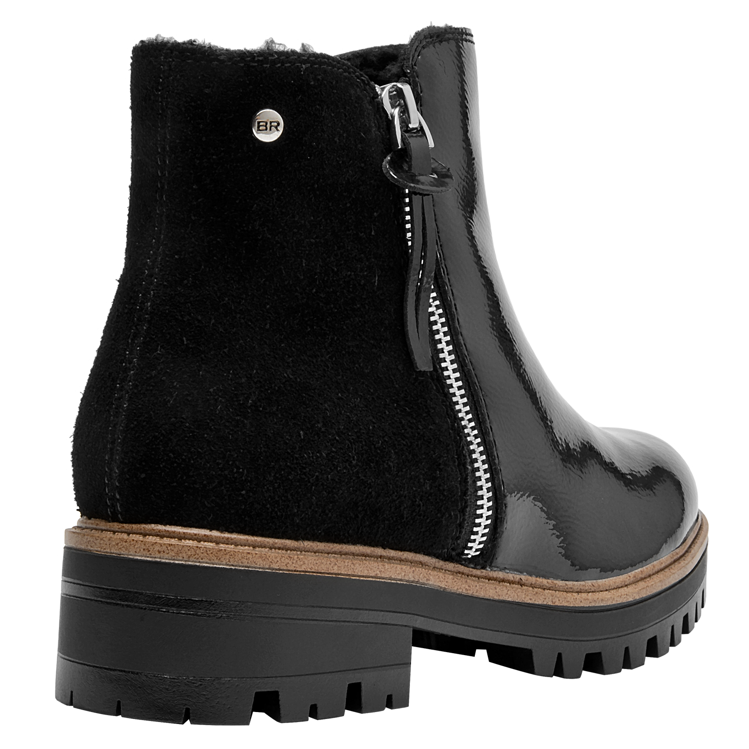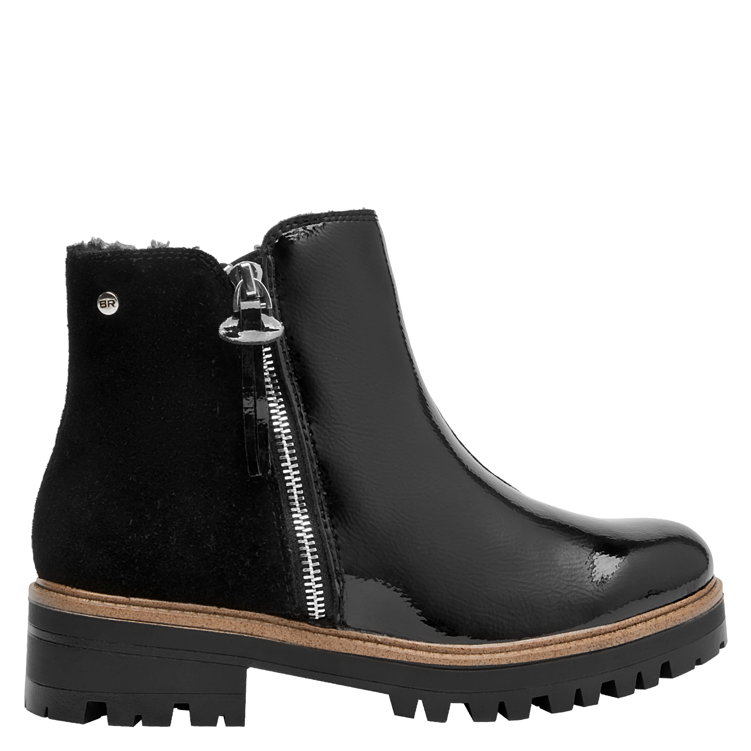Botín urbano para mujer en color negro, confeccionado en material sintético con forro mixto sintético/textil. Presenta punta redonda y taco bloque de 4 cm que aporta estabilidad y una silueta cómoda para el día a día. De líneas limpias y costuras discretas, su acabado versátil combina fácilmente, mientras su suela resistente acompaña tus pasos con firmeza.