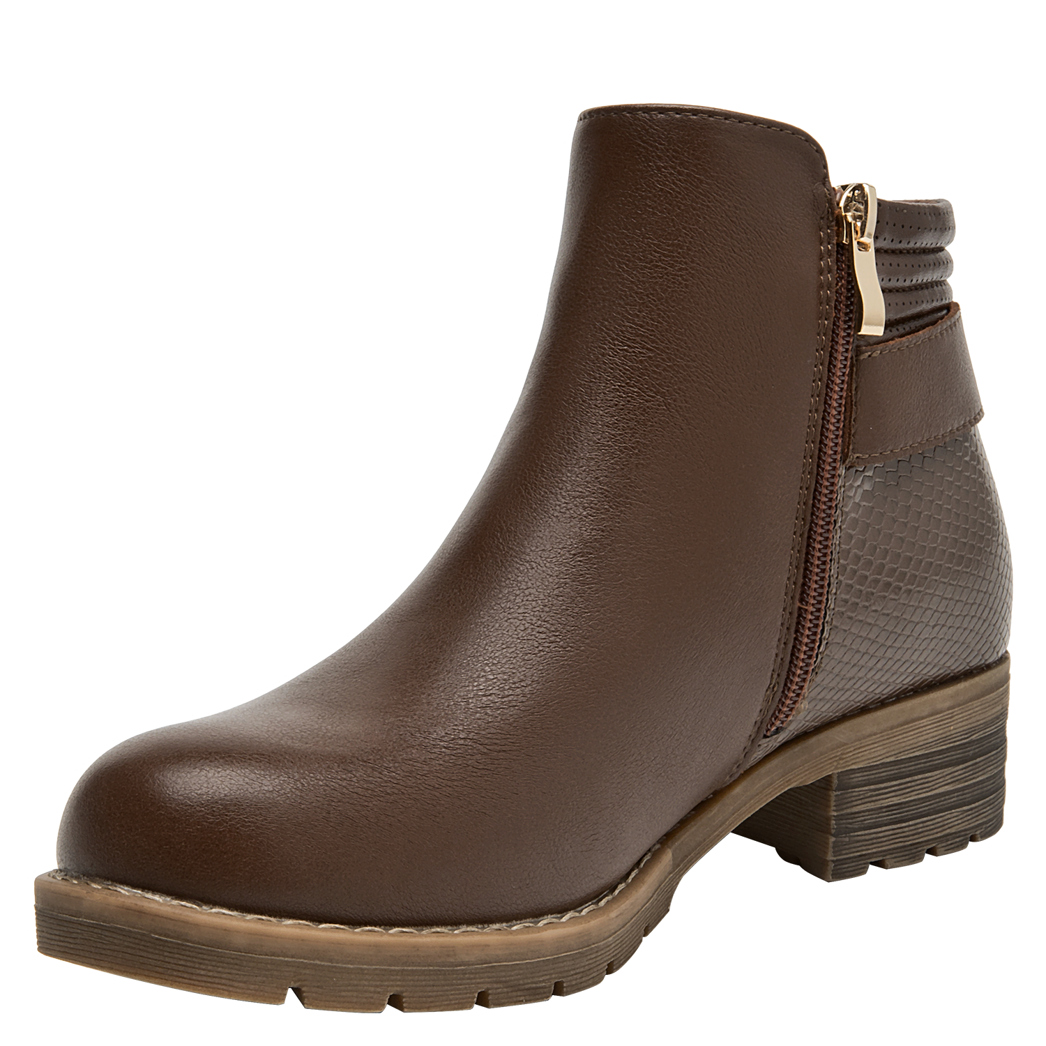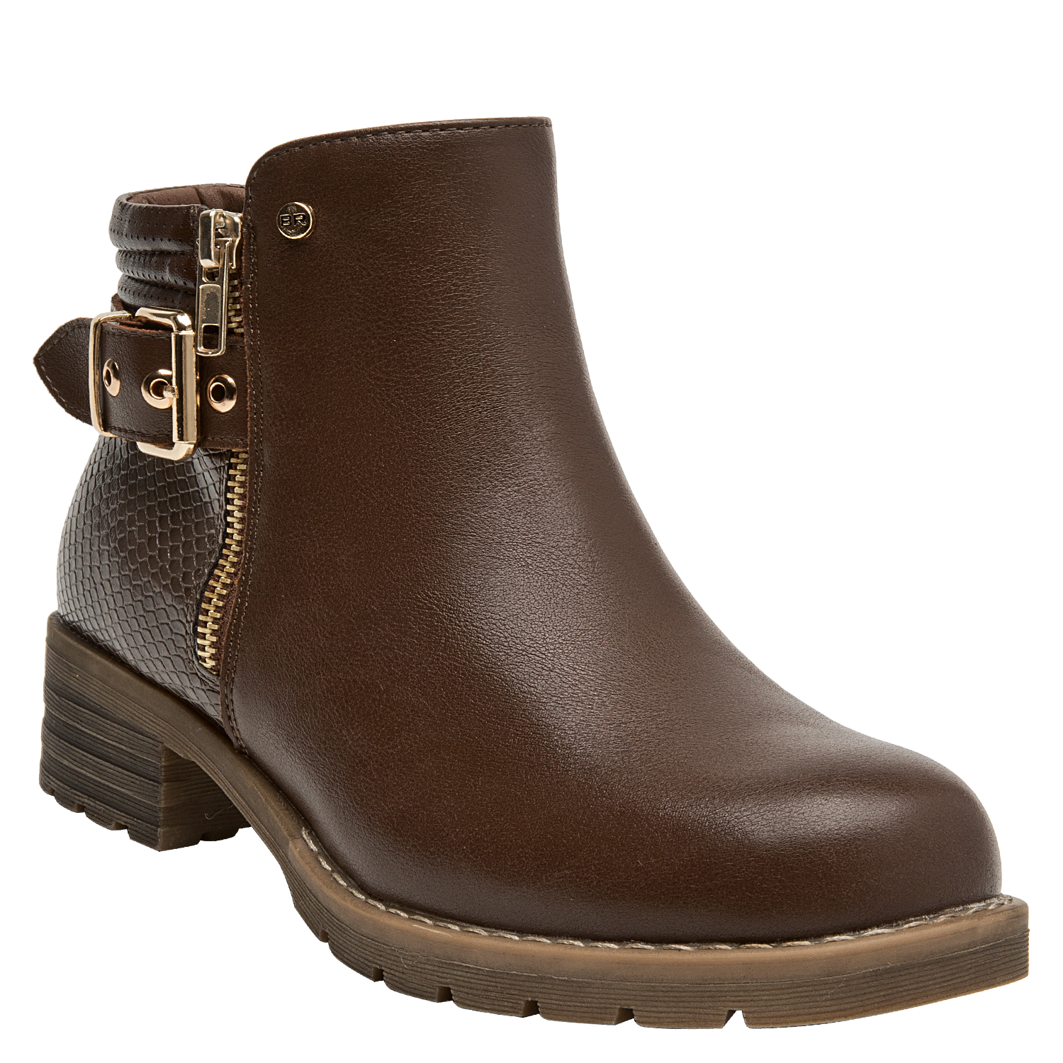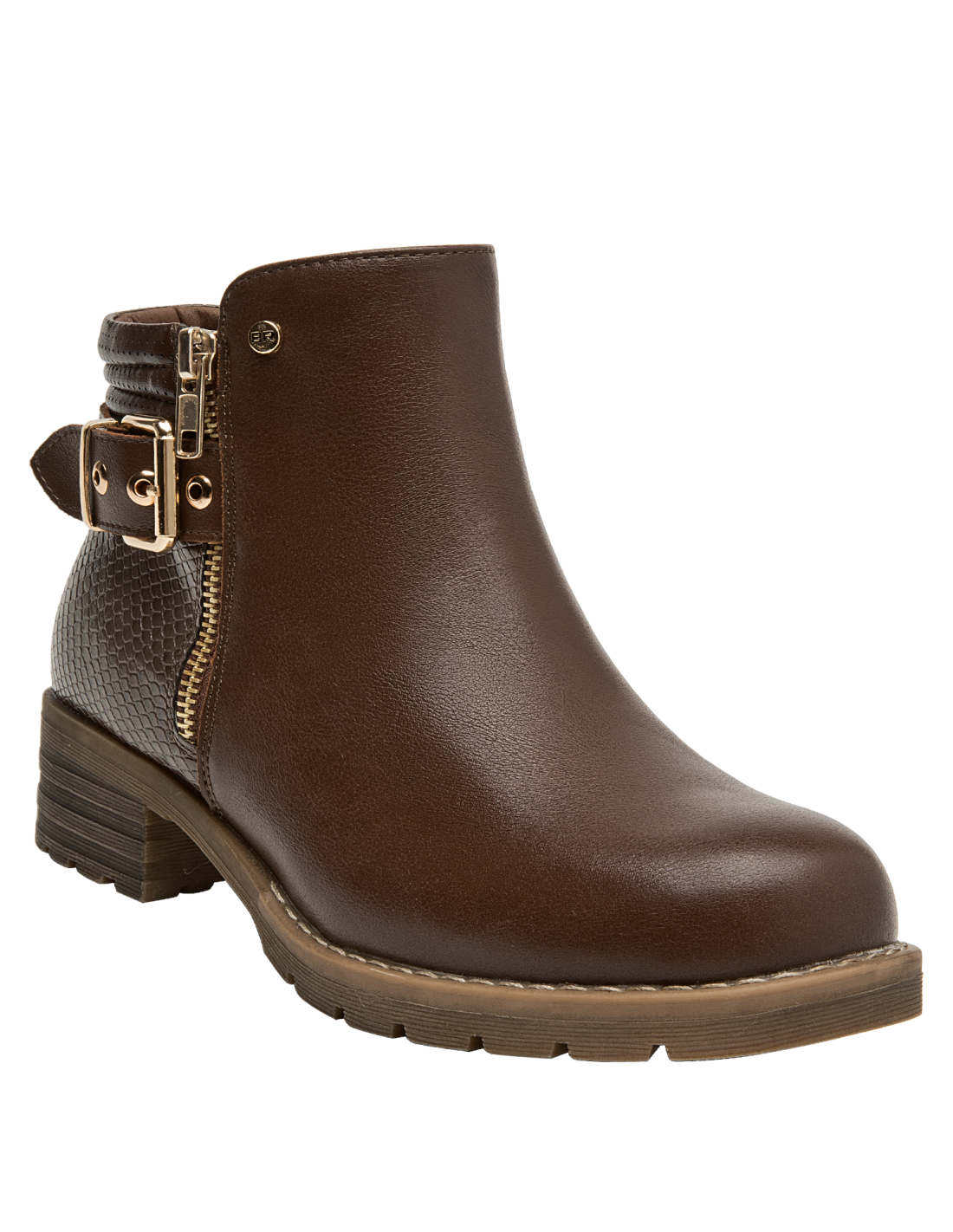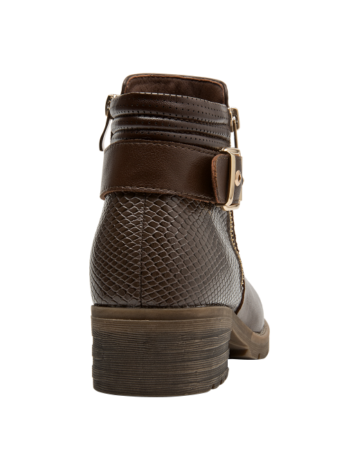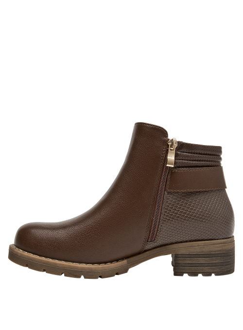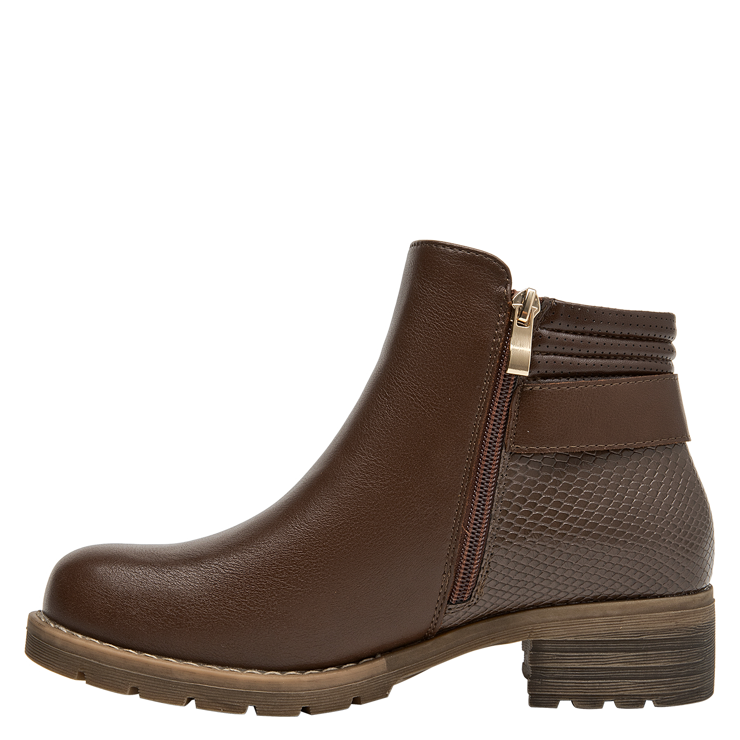 Botín casual de cuero para mujer en color café, con punta redonda y taco bloque de 4 cm que suma una elevación estable para el día a día. La capellada de cuero luce sobria y fácil de combinar, mientras que el interior incorpora forro sintético/textil. Un diseño versátil de líneas limpias que acompaña con estilo en temporadas frescas y escenarios urbanos.