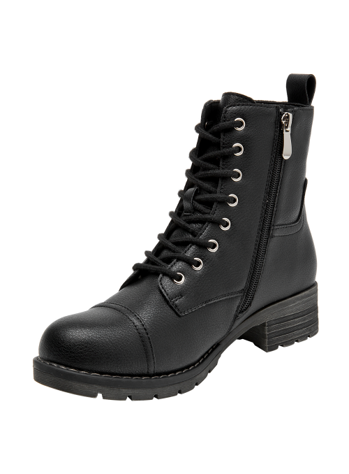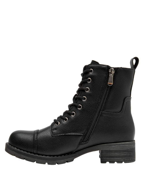 Botín de cuero para mujer de estilo urbano en color negro, con punta redonda y taco bloque de 4 cm que aporta estabilidad y una altura moderada. El forro sintético/textil ofrece una sensación agradable al contacto. Un diseño versátil y atemporal para transitar entre la oficina y salidas informales, manteniendo un look pulido en cualquier momento.
