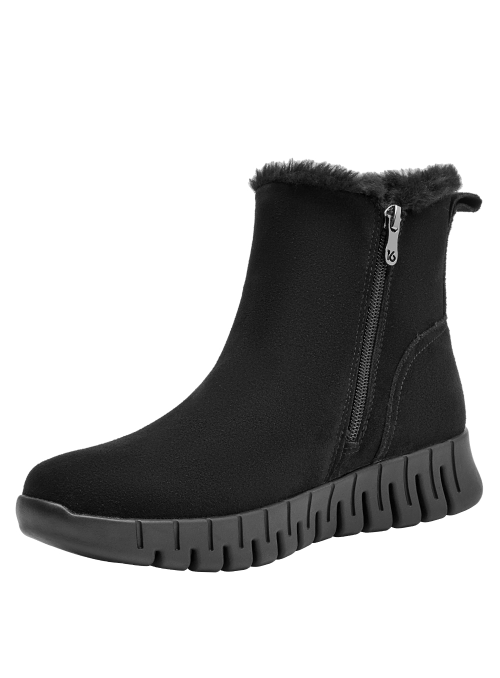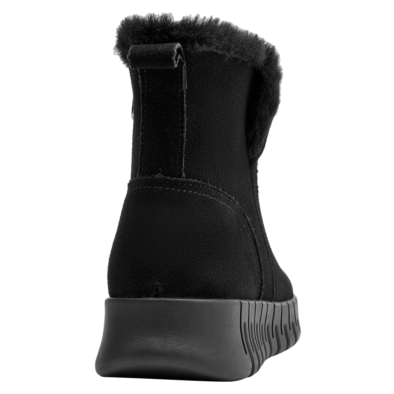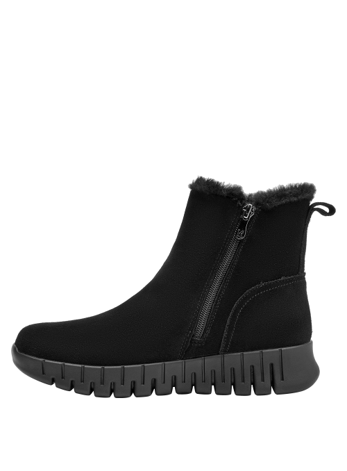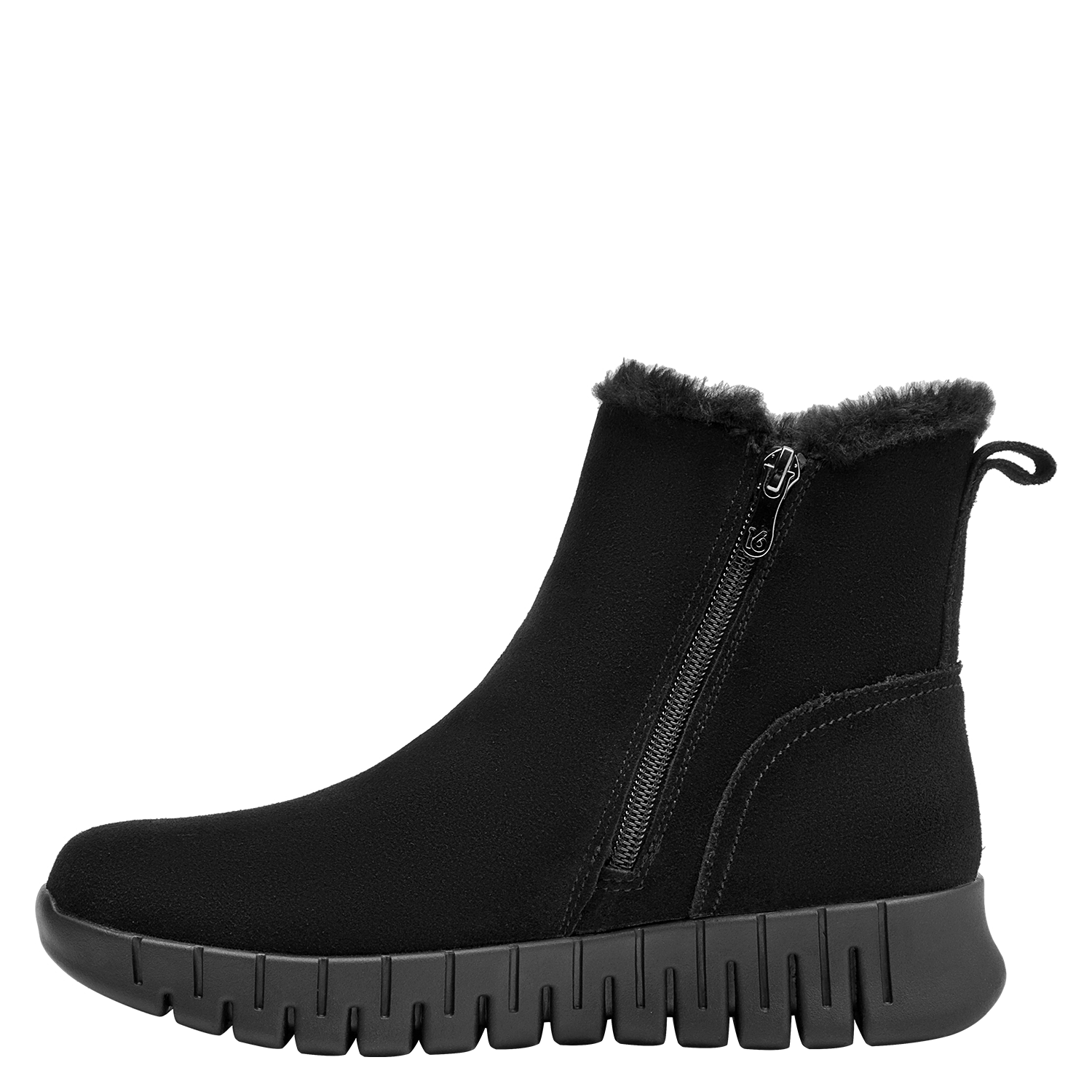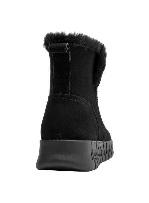 Botín con cuña para mujer en color negro, confeccionado en cuero con forro interior de pelo sintético y malla. Incorpora punta redonda y un taco cuña de 4 cm que eleva sutilmente manteniendo una pisada equilibrada. Diseño limpio y versátil, ideal para el día a día y transiciones de temporada.