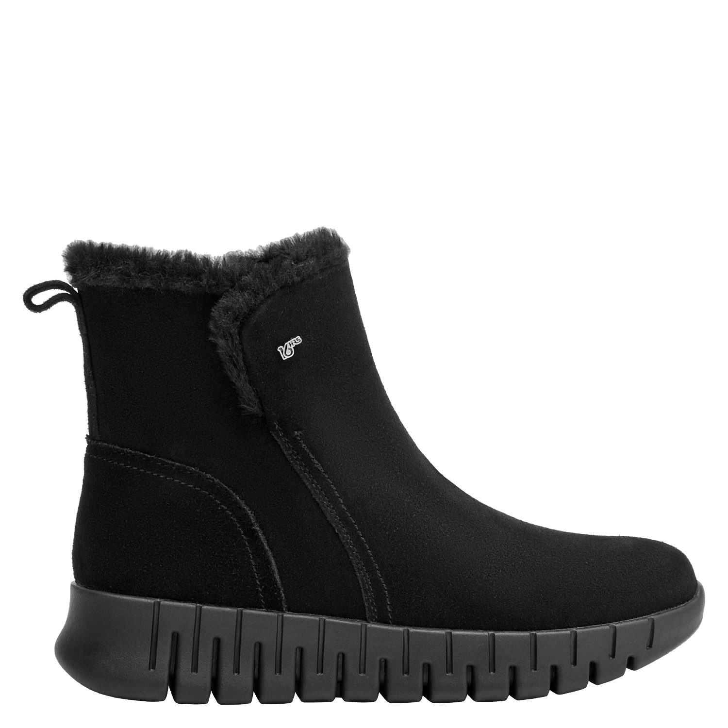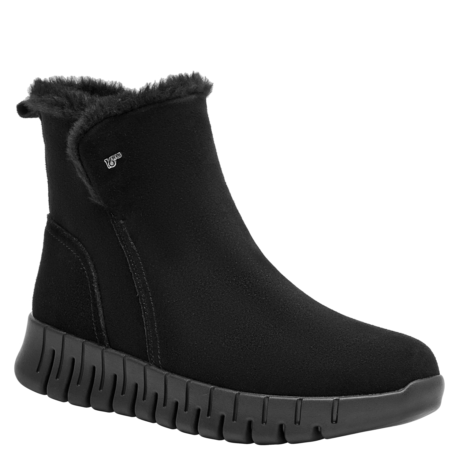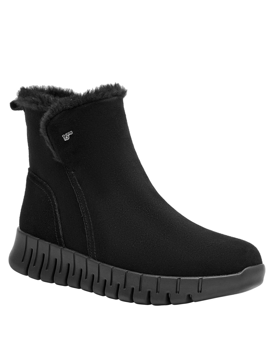 Botín con cuña para mujer en color negro, confeccionado en cuero con forro interior de pelo sintético y malla. Incorpora punta redonda y un taco cuña de 4 cm que eleva sutilmente manteniendo una pisada equilibrada. Diseño limpio y versátil, ideal para el día a día y transiciones de temporada.