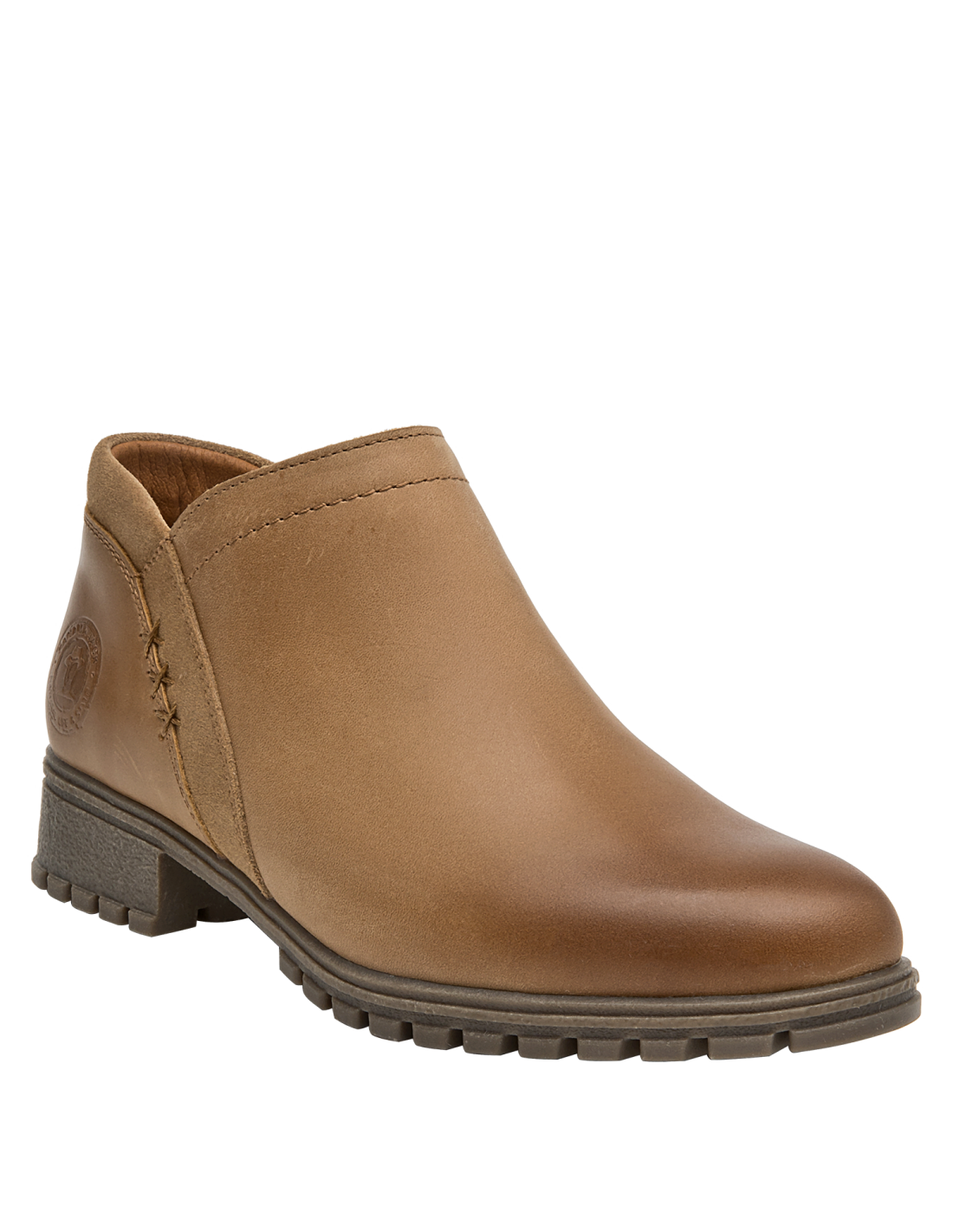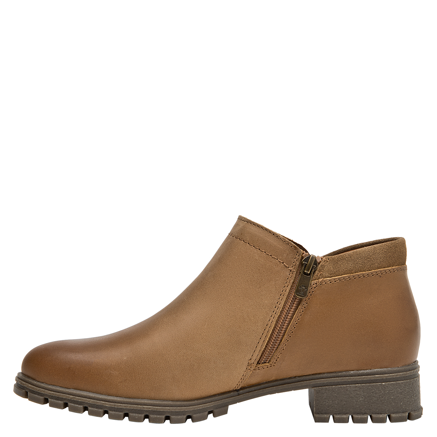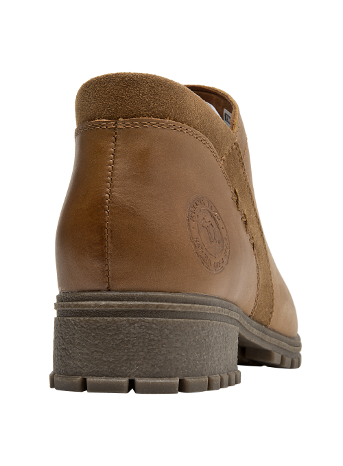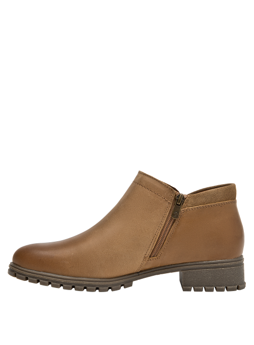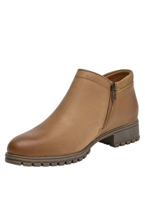 Botín de cuero para mujer en color camel, de estilo casual, con punta redonda y taco bloque de 3,6 cm. Su construcción en cuero y forro mixto textil/PU aporta una sensación agradable al contacto, mientras la altura moderada del taco favorece una pisada estable para el día a día. Un diseño versátil y atemporal que complementa distintos looks sin recargar, ideal para transiciones entre temporadas.