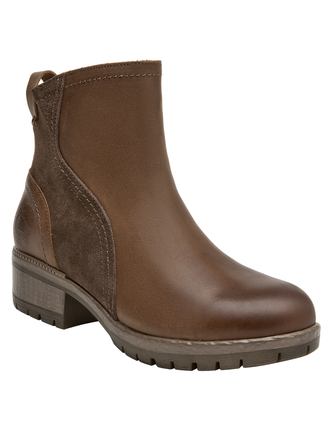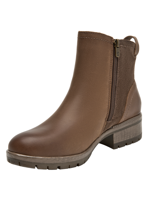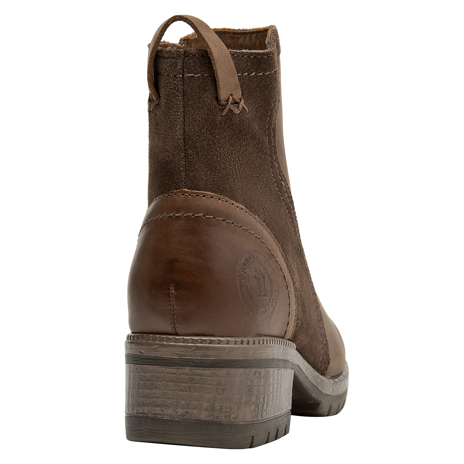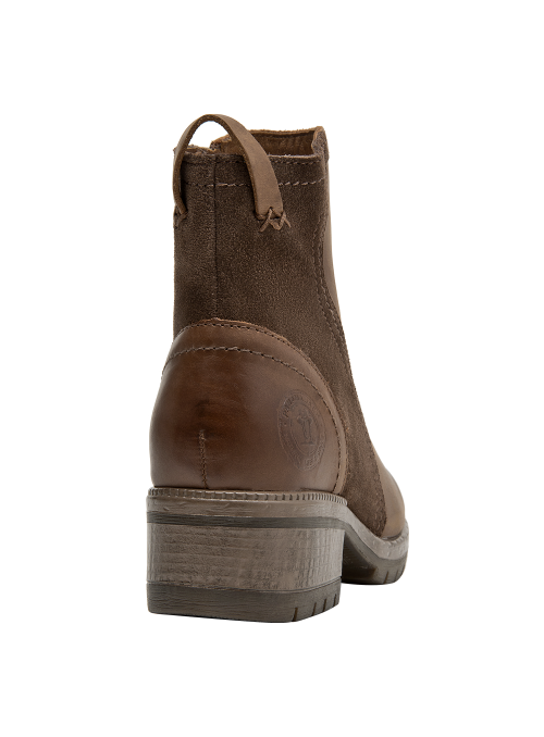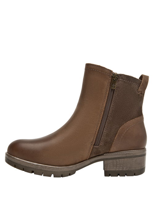 Botín de cuero para mujer de estilo urbano en color café, con punta redonda y taco bloque de 4.5 cm que aporta estabilidad y una silueta equilibrada. El exterior en cuero luce versátil y de fácil combinación, mientras el forro textil/PU contribuye a un calce cómodo para el día a día. Un diseño limpio y contemporáneo que se adapta a diferentes ocasiones sin perder elegancia relajada.