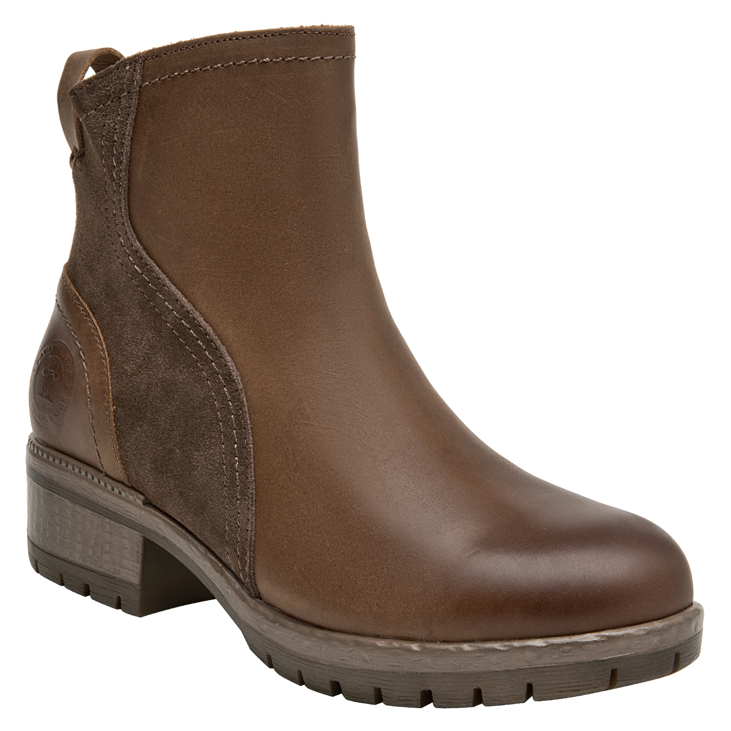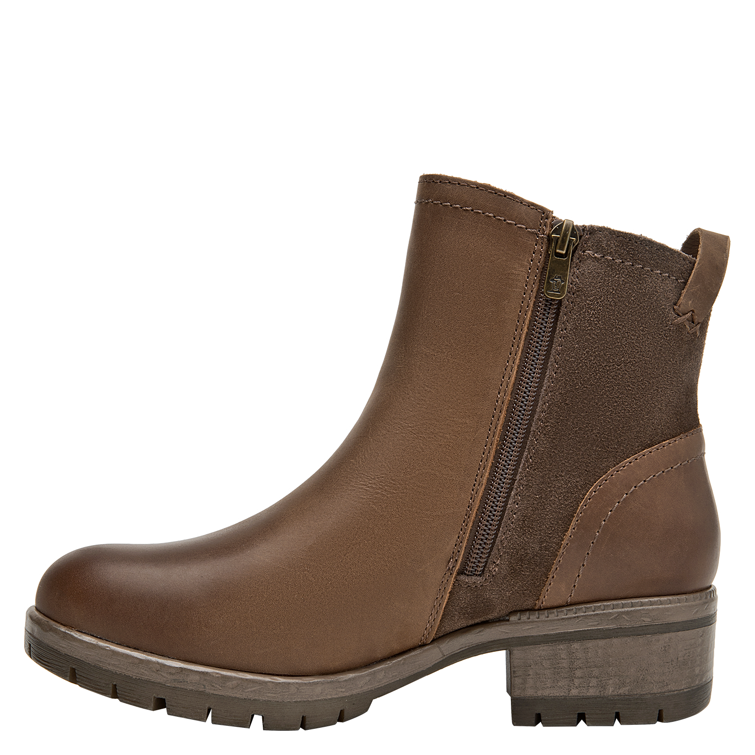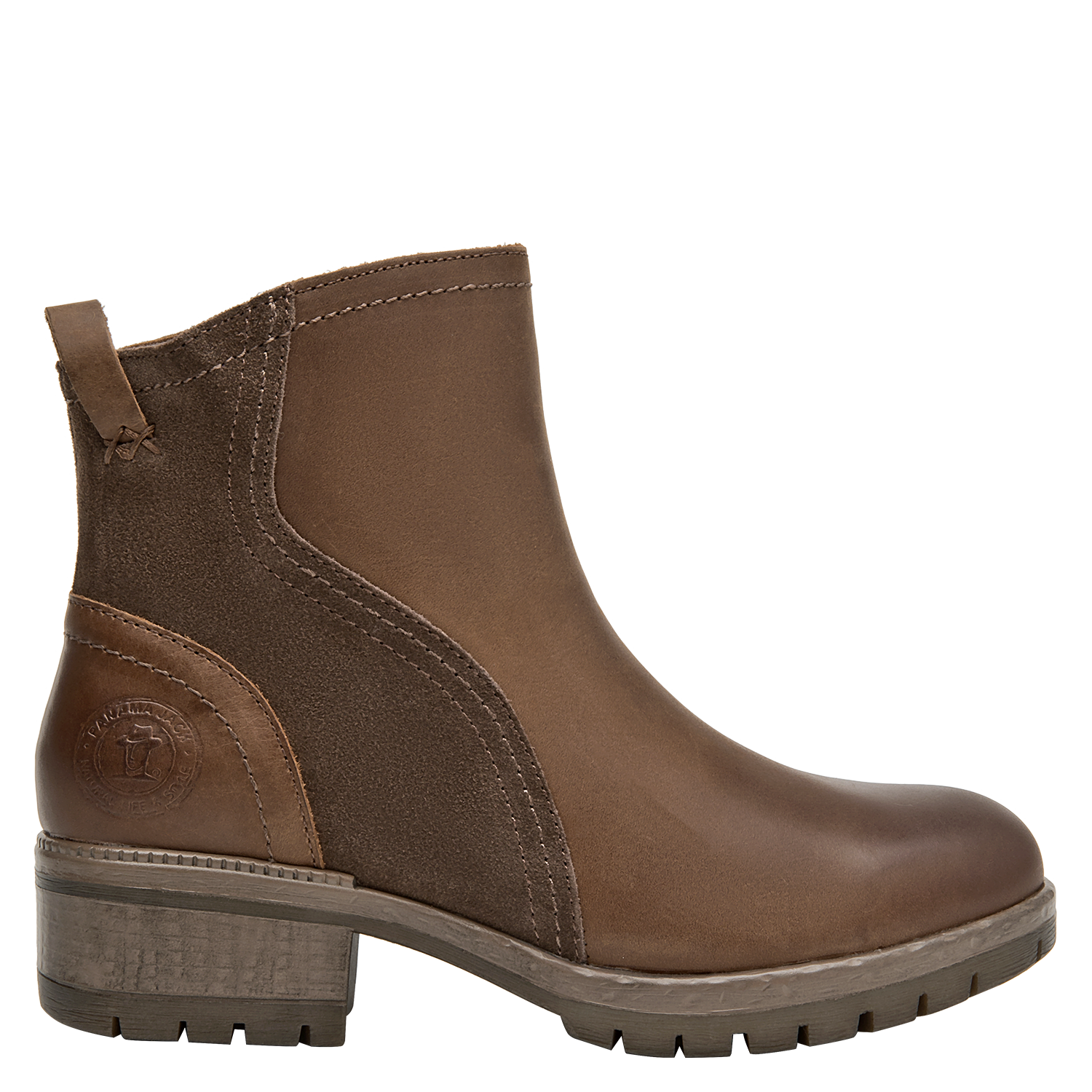 Botín de cuero para mujer de estilo urbano en color café, con punta redonda y taco bloque de 4.5 cm que aporta estabilidad y una silueta equilibrada. El exterior en cuero luce versátil y de fácil combinación, mientras el forro textil/PU contribuye a un calce cómodo para el día a día. Un diseño limpio y contemporáneo que se adapta a diferentes ocasiones sin perder elegancia relajada.