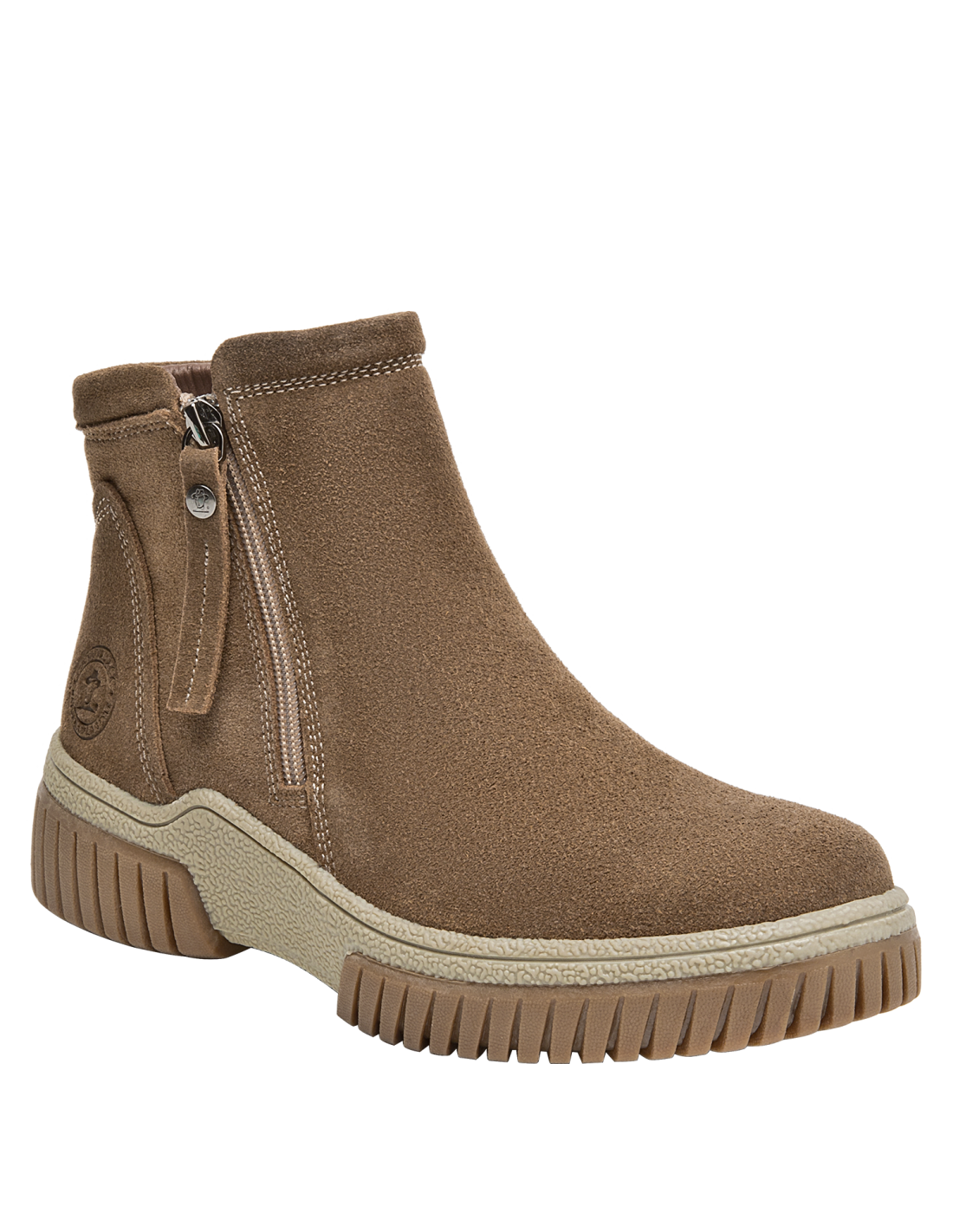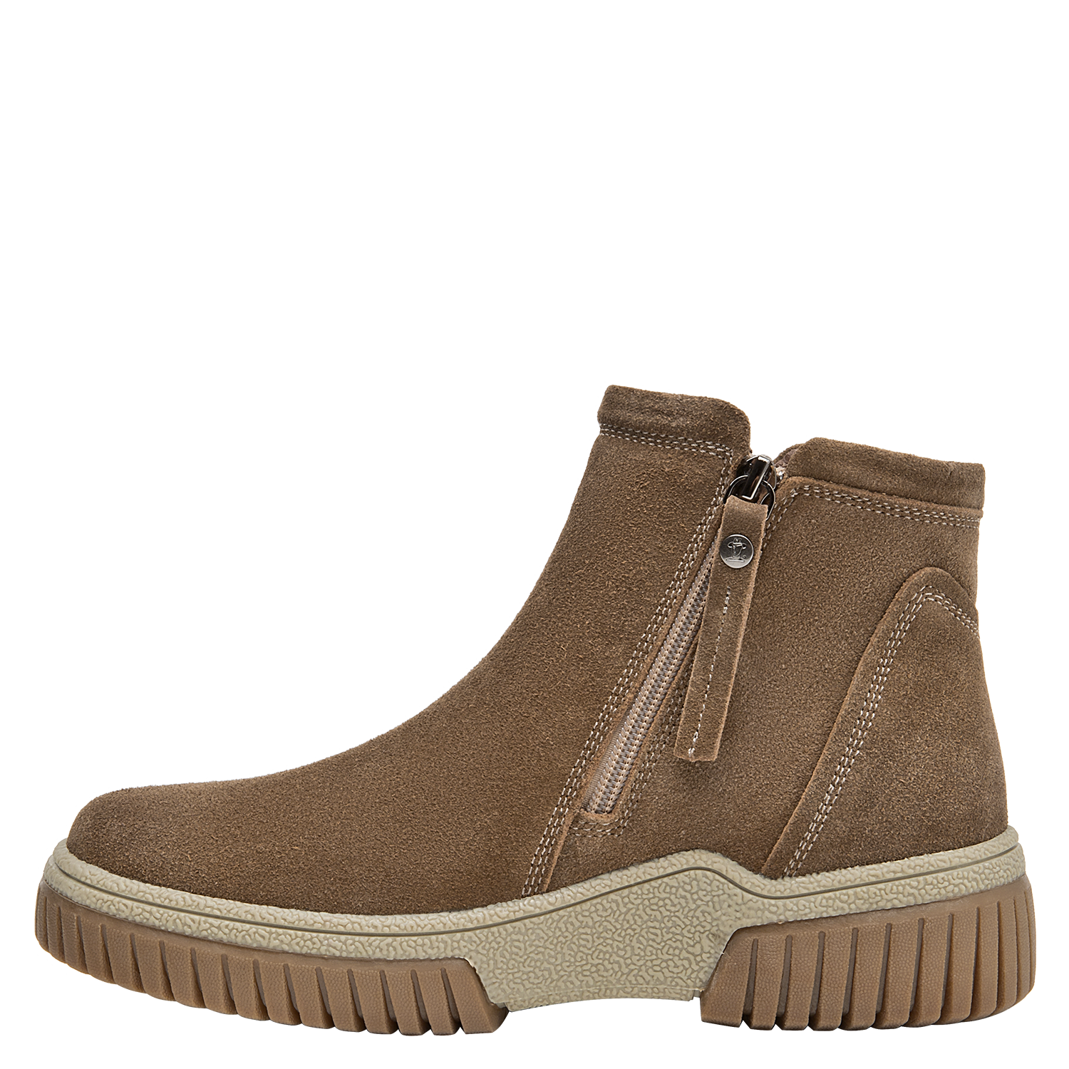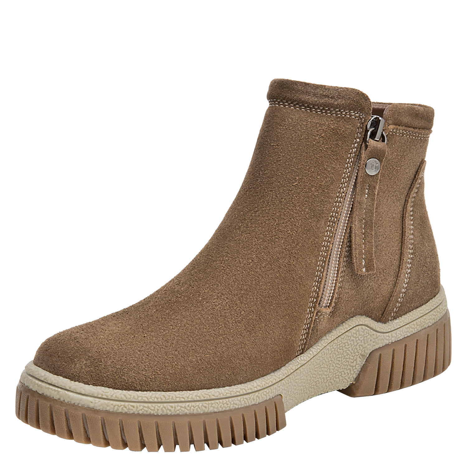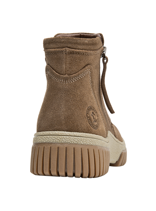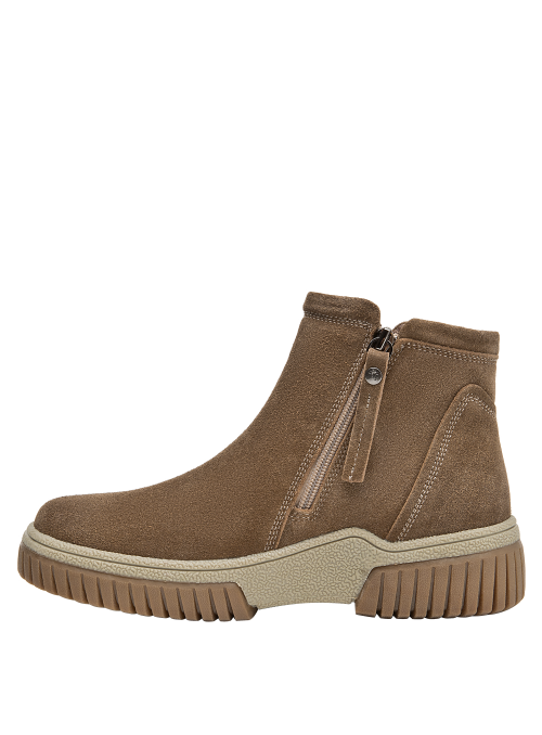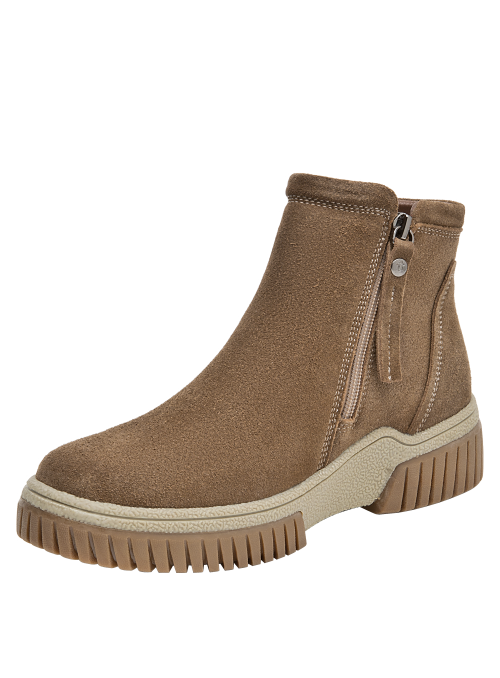 Botín urbano de cuero para mujer en color taupe, con punta redonda y taco plano de 4,5 cm. El exterior de cuero luce acabado suave y costuras prolijas, mientras el forro mixto textil/pelo aporta una sensación abrigada en días frescos. La suela estable brinda tracción y soporte para el uso diario sin sacrificar un look limpio.