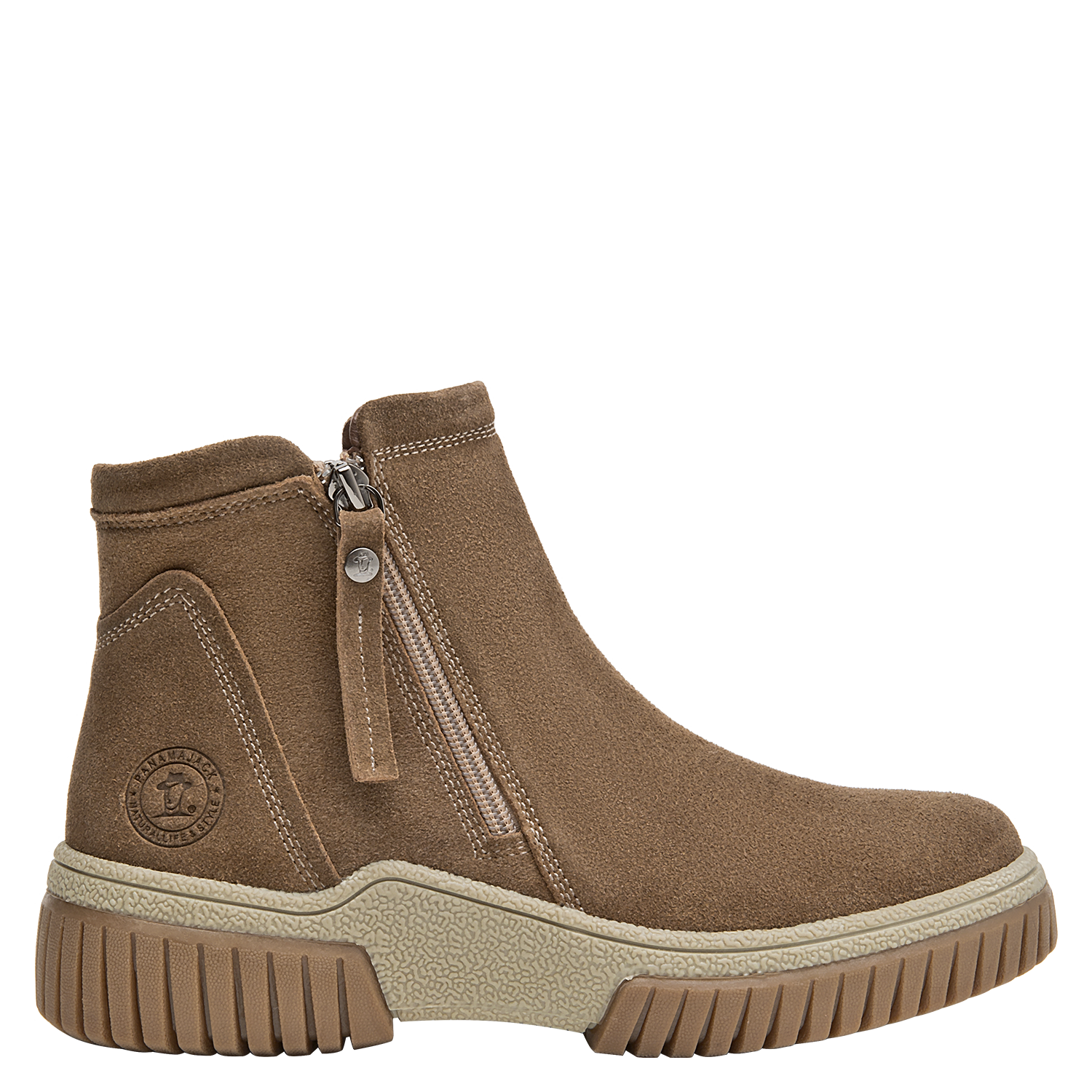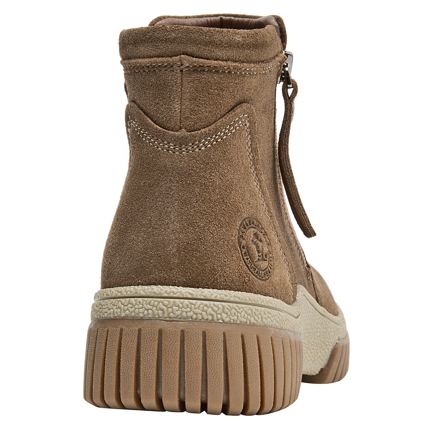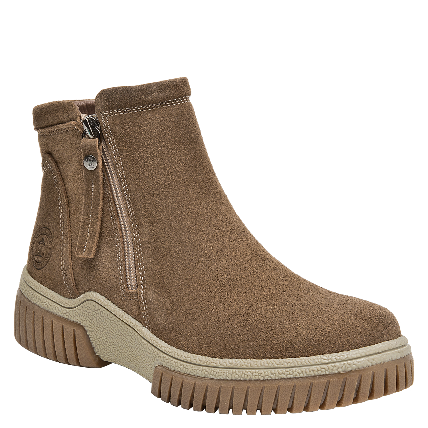 Botín urbano de cuero para mujer en color taupe, con punta redonda y taco plano de 4,5 cm. El exterior de cuero luce acabado suave y costuras prolijas, mientras el forro mixto textil/pelo aporta una sensación abrigada en días frescos. La suela estable brinda tracción y soporte para el uso diario sin sacrificar un look limpio.