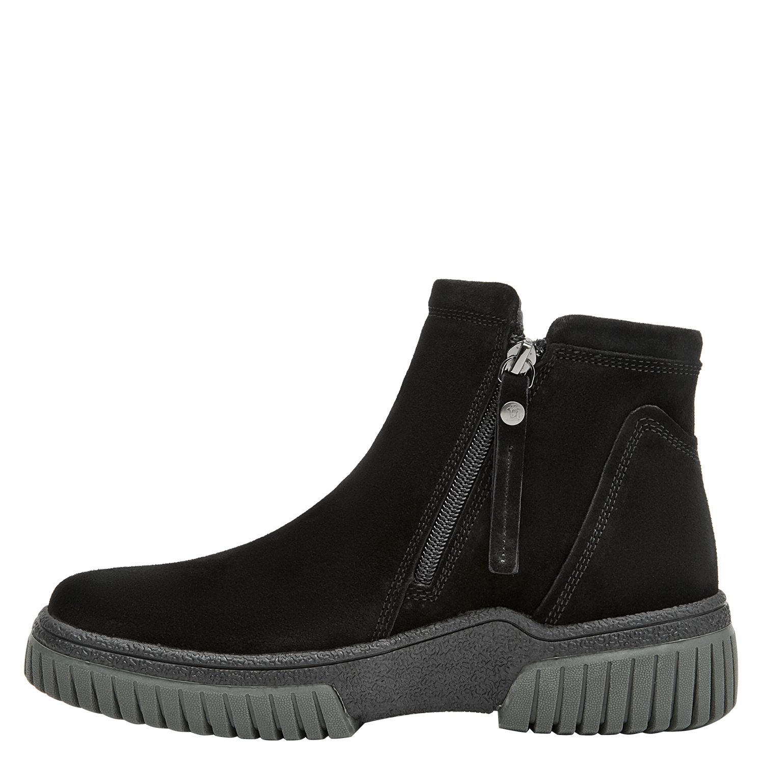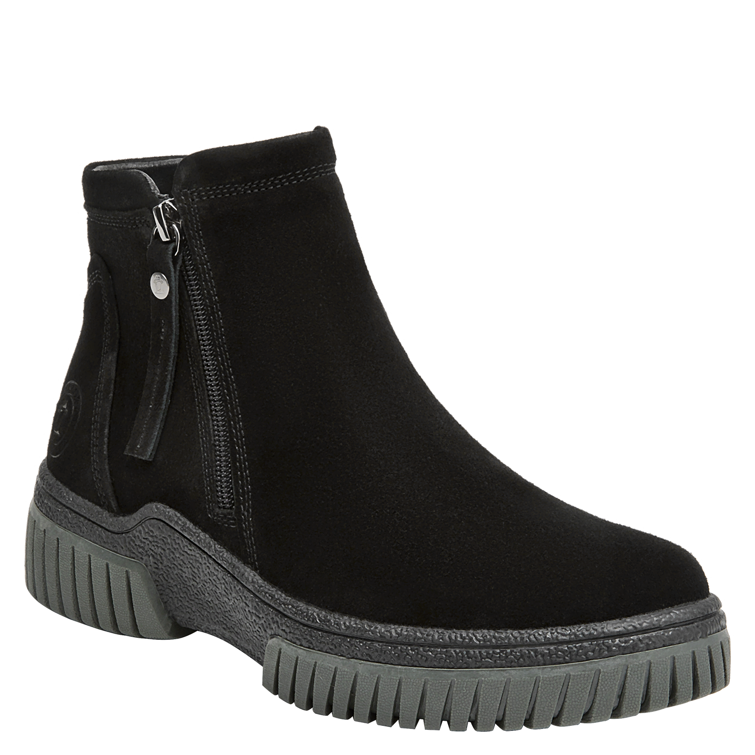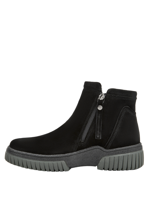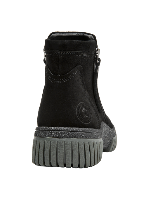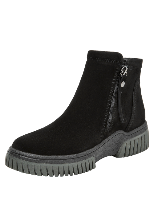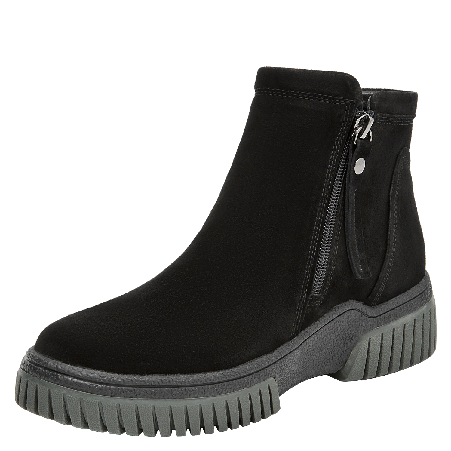 Botín urbano de cuero para mujer en color negro, con punta redonda y taco plano de 4,5 cm. Su construcción en cuero aporta durabilidad, mientras el forro textil/pelo ofrece una sensación acogedora en días fríos. La altura de la suela brinda estabilidad y confort en el andar, en un diseño versátil y fácil de combinar para distintos estilos cotidianos.