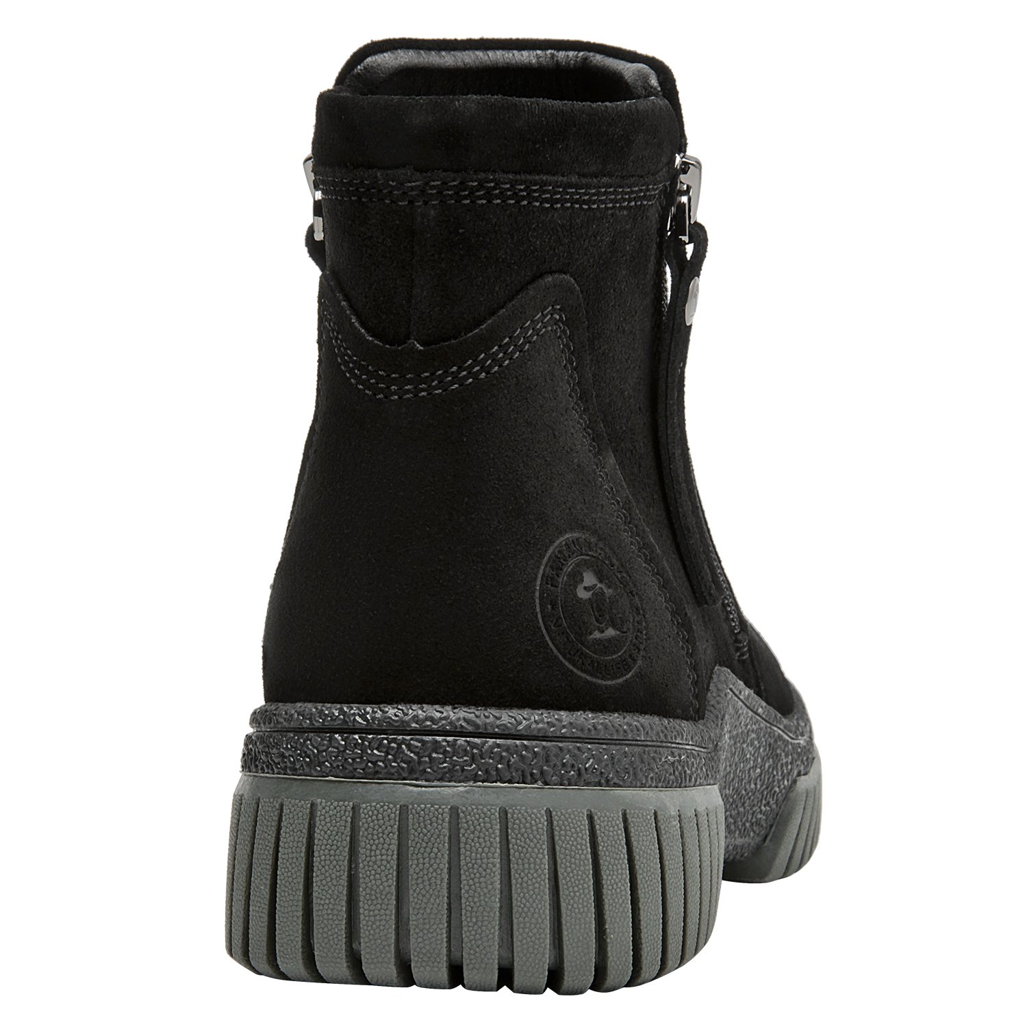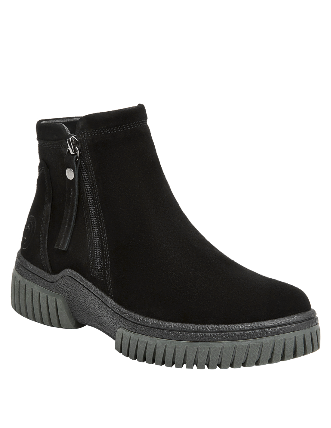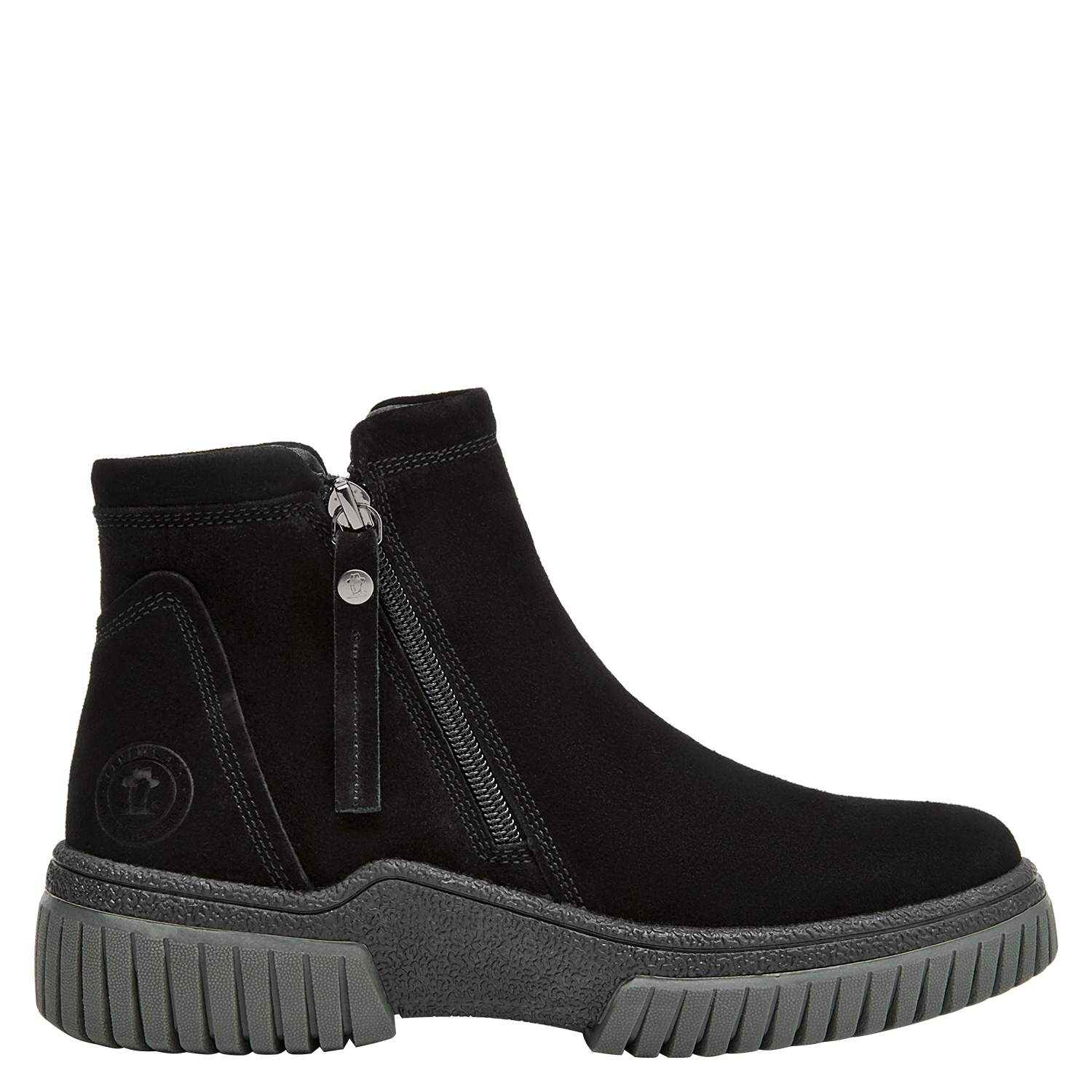 Botín urbano de cuero para mujer en color negro, con punta redonda y taco plano de 4,5 cm. Su construcción en cuero aporta durabilidad, mientras el forro textil/pelo ofrece una sensación acogedora en días fríos. La altura de la suela brinda estabilidad y confort en el andar, en un diseño versátil y fácil de combinar para distintos estilos cotidianos.