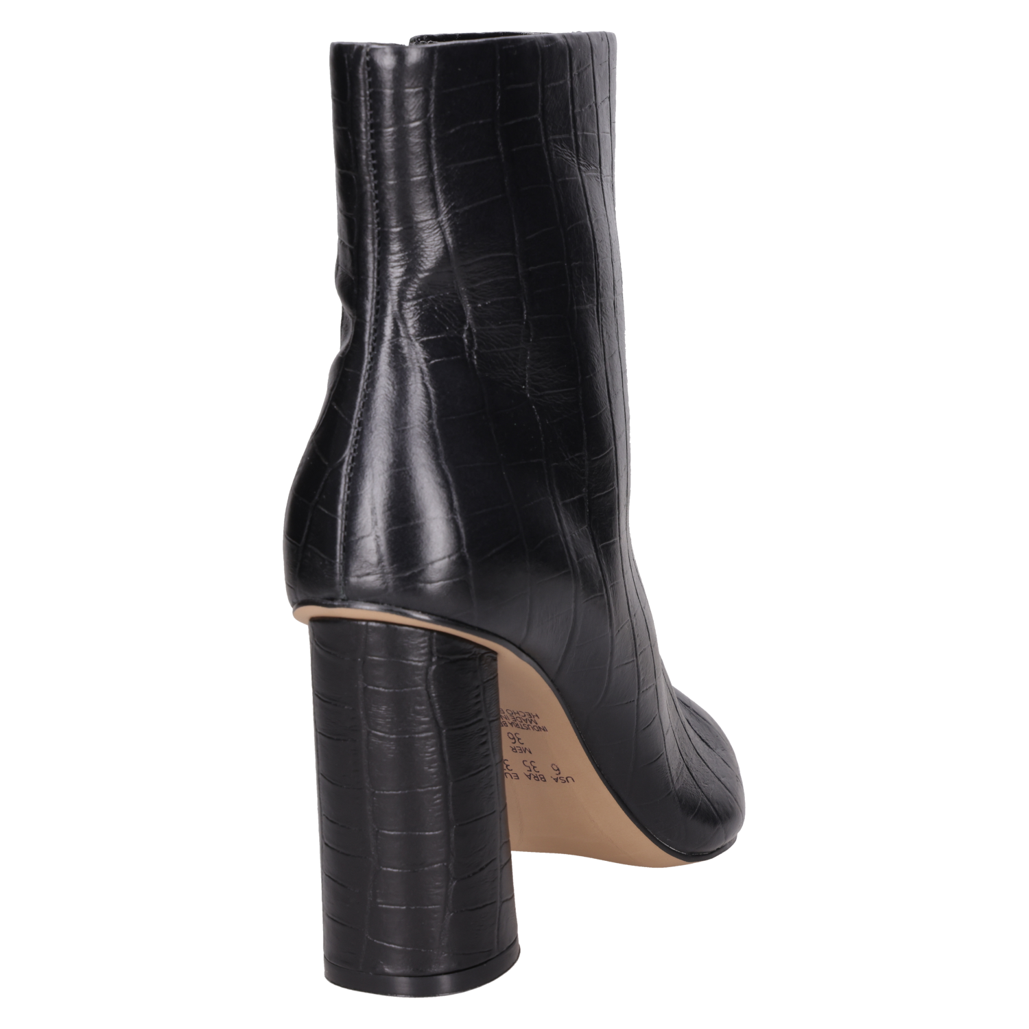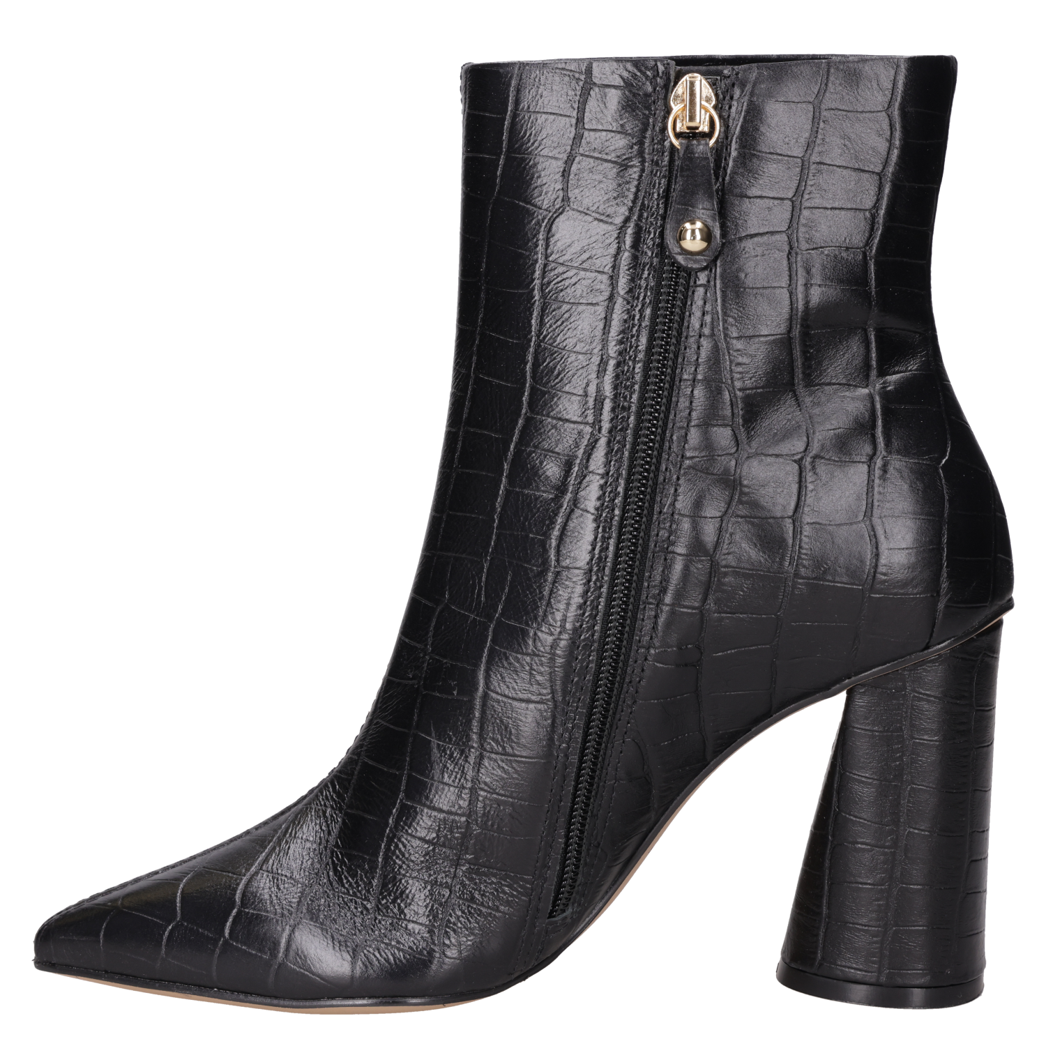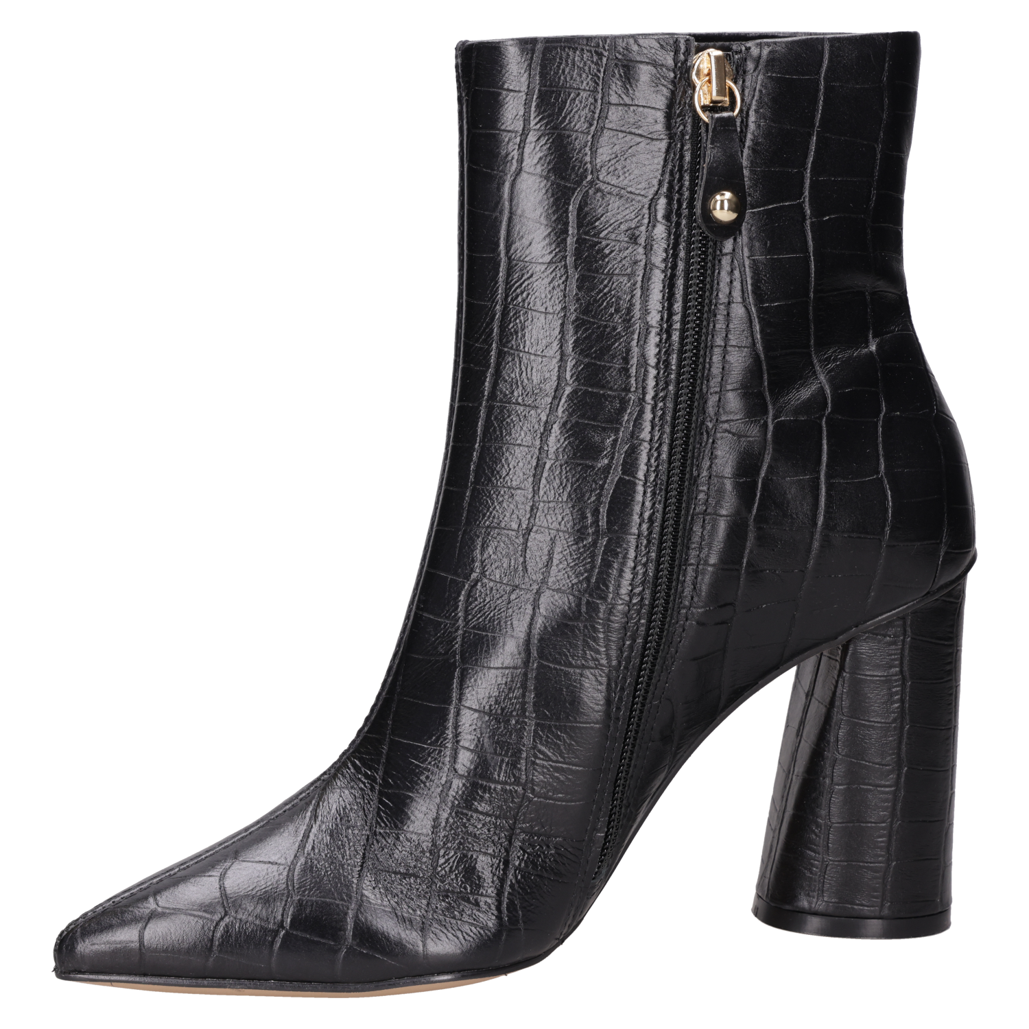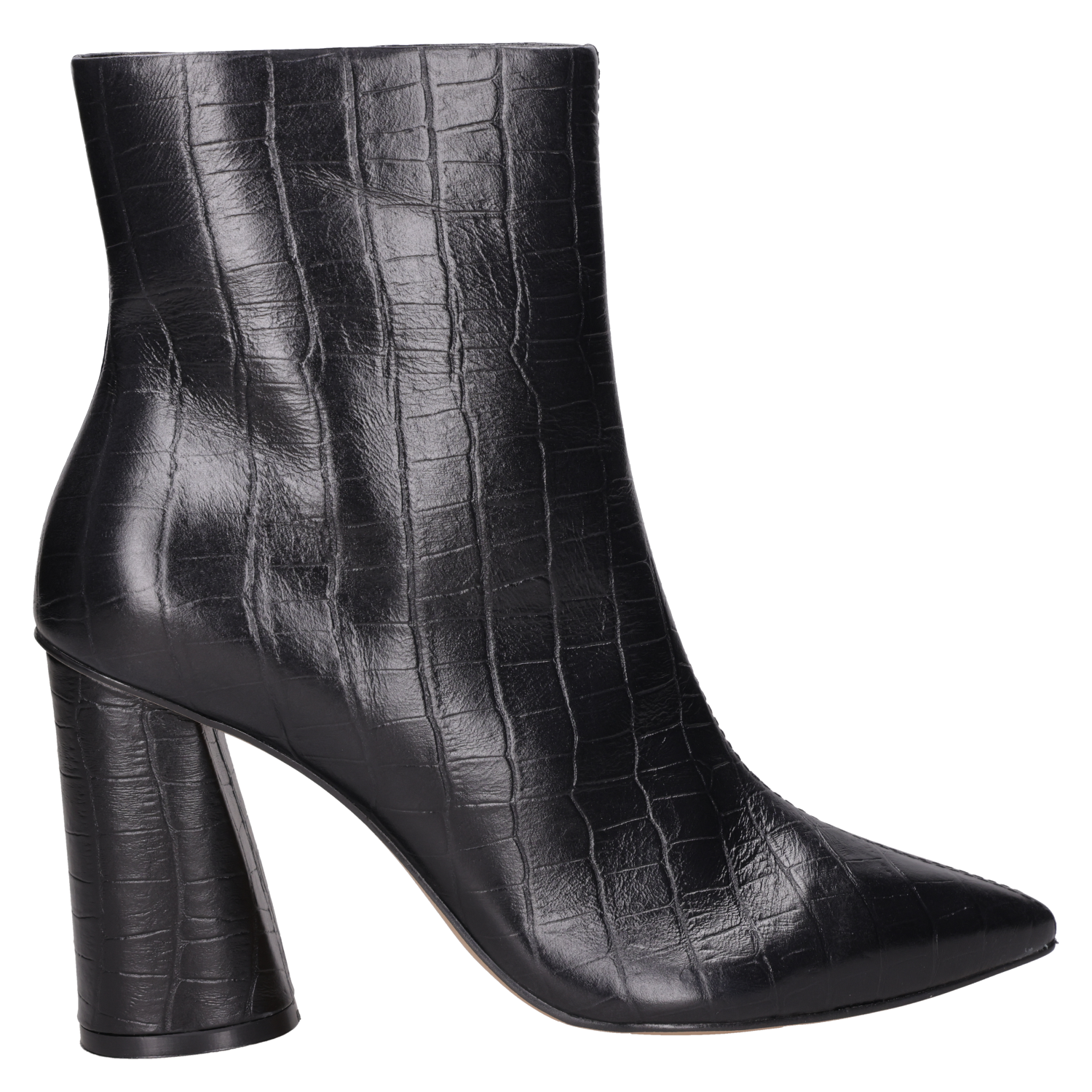 Zapato de tacón tipo pump con taco bloque en color negro, confeccionado en cuero. Incorpora punta puntiaguda y forro de PU, con líneas limpias y acabado liso que aportan un aire sofisticado. La altura de 9,5 cm equilibra presencia y estabilidad, perfecta para realzar looks de diario o de noche.
