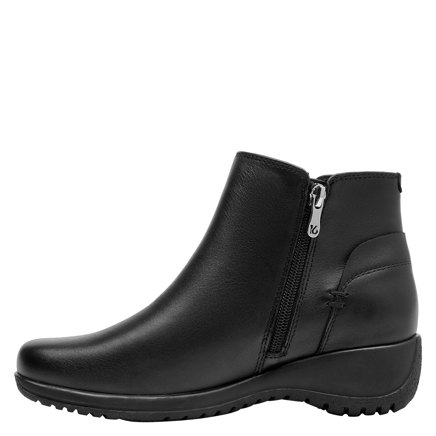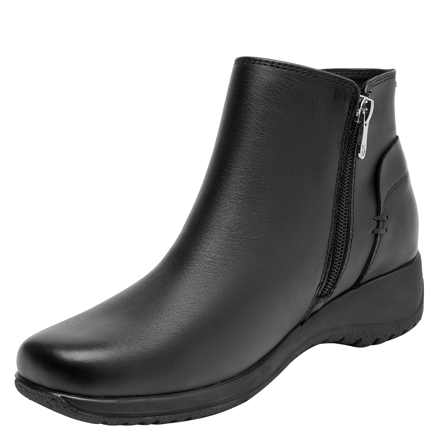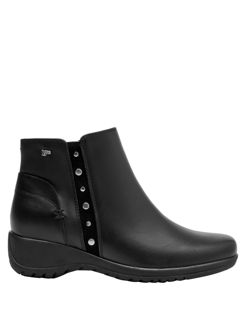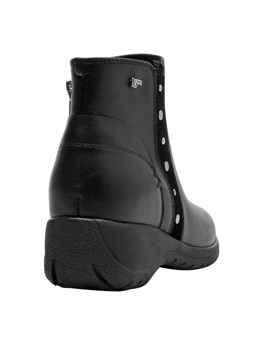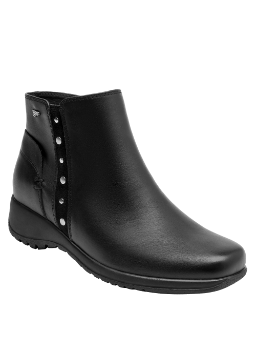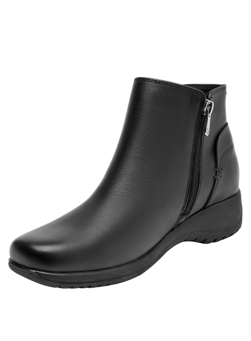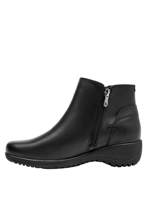 Botín de cuero para mujer de estilo urbano en color negro, con punta redonda y taco bloque de 4.5 cm. Presenta un acabado liso con costuras discretas y forro textil que aporta comodidad al contacto. Su silueta equilibrada y la altura del taco favorecen el uso diario, entregando una pisada confiable y un look pulido para múltiples ocasiones.