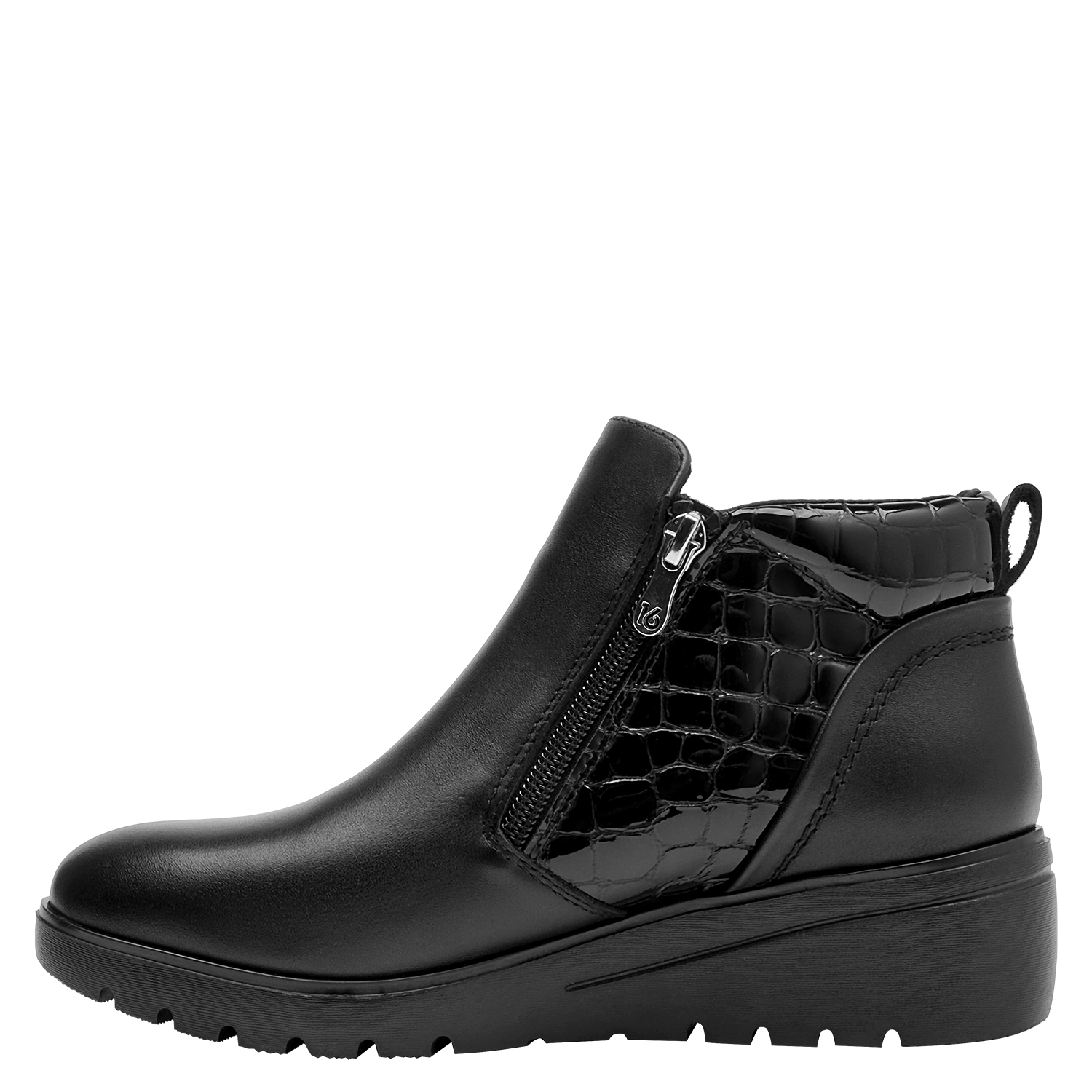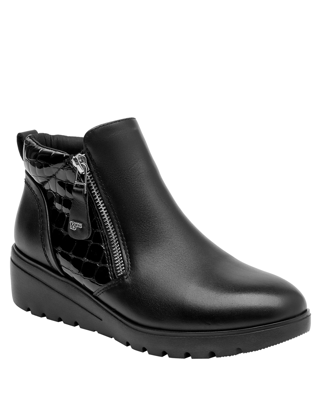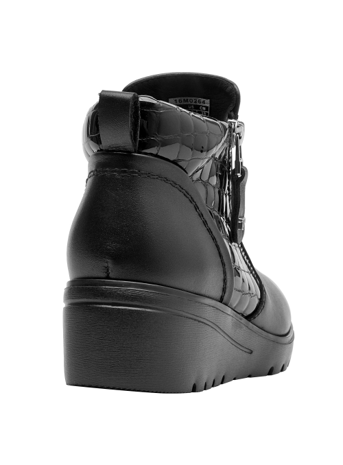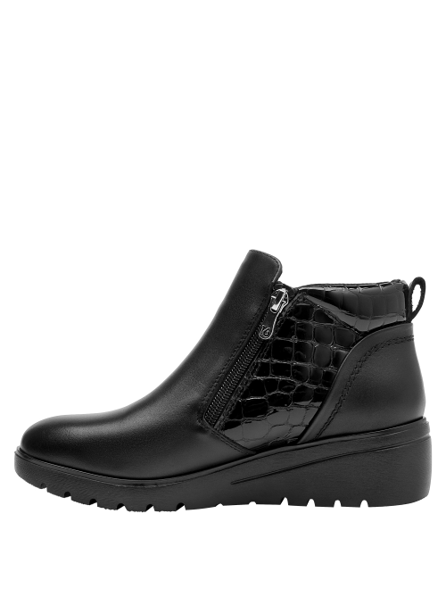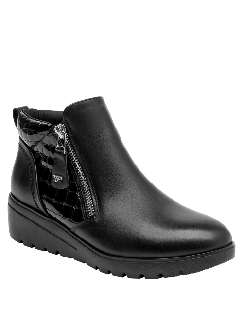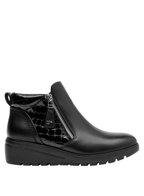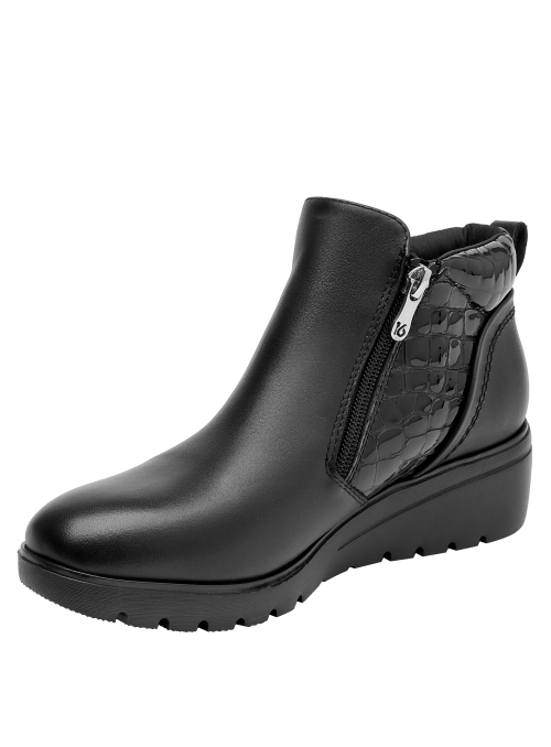 Botín con cuña para mujer en cuero negro, de punta redonda y altura de 5 cm. Su diseño limpio resalta el acabado liso del cuero y la cuña continua que suma elevación sutil con sensación estable. Incluye interior de microfibra suave y un perfil atemporal que facilita combinarlo en múltiples ocasiones.