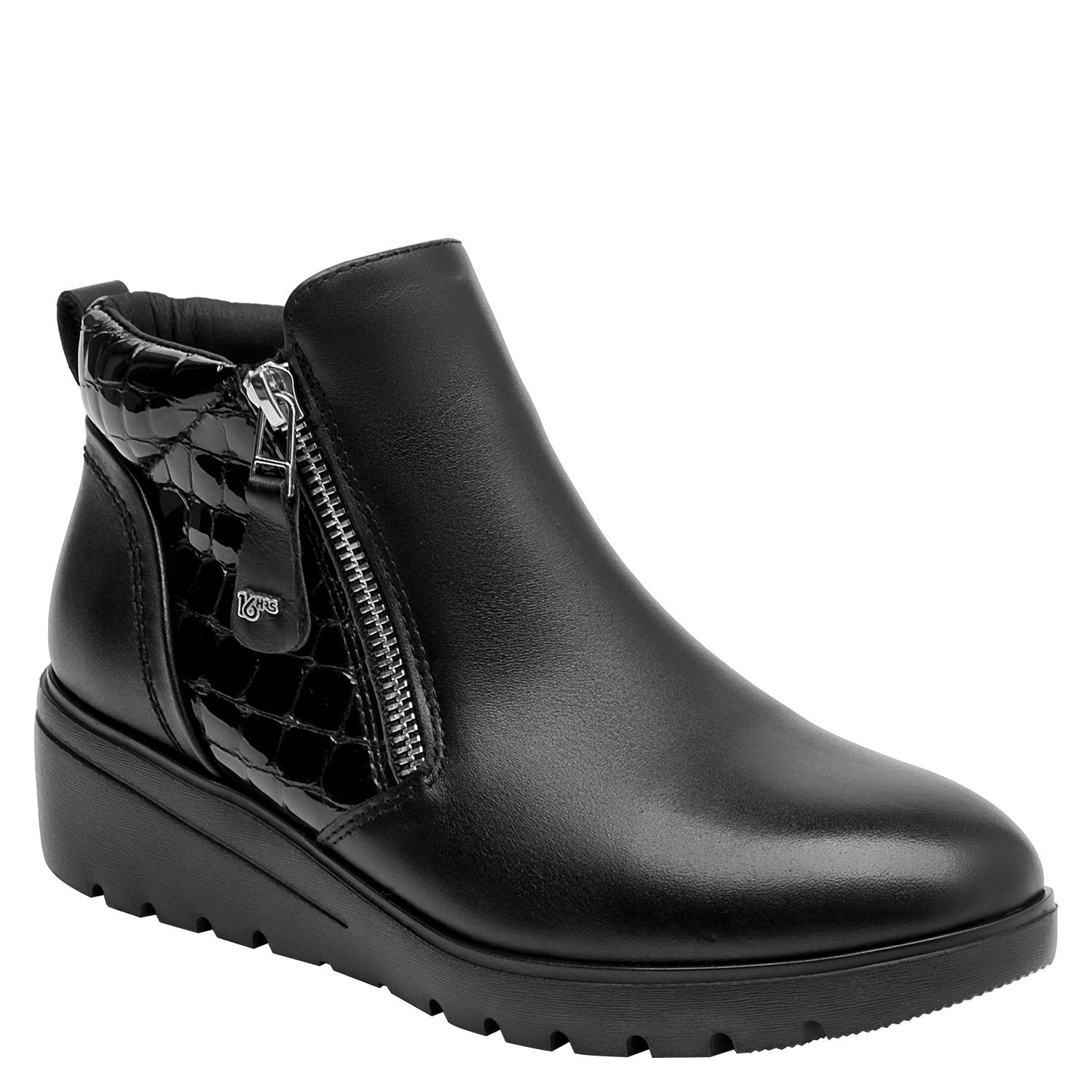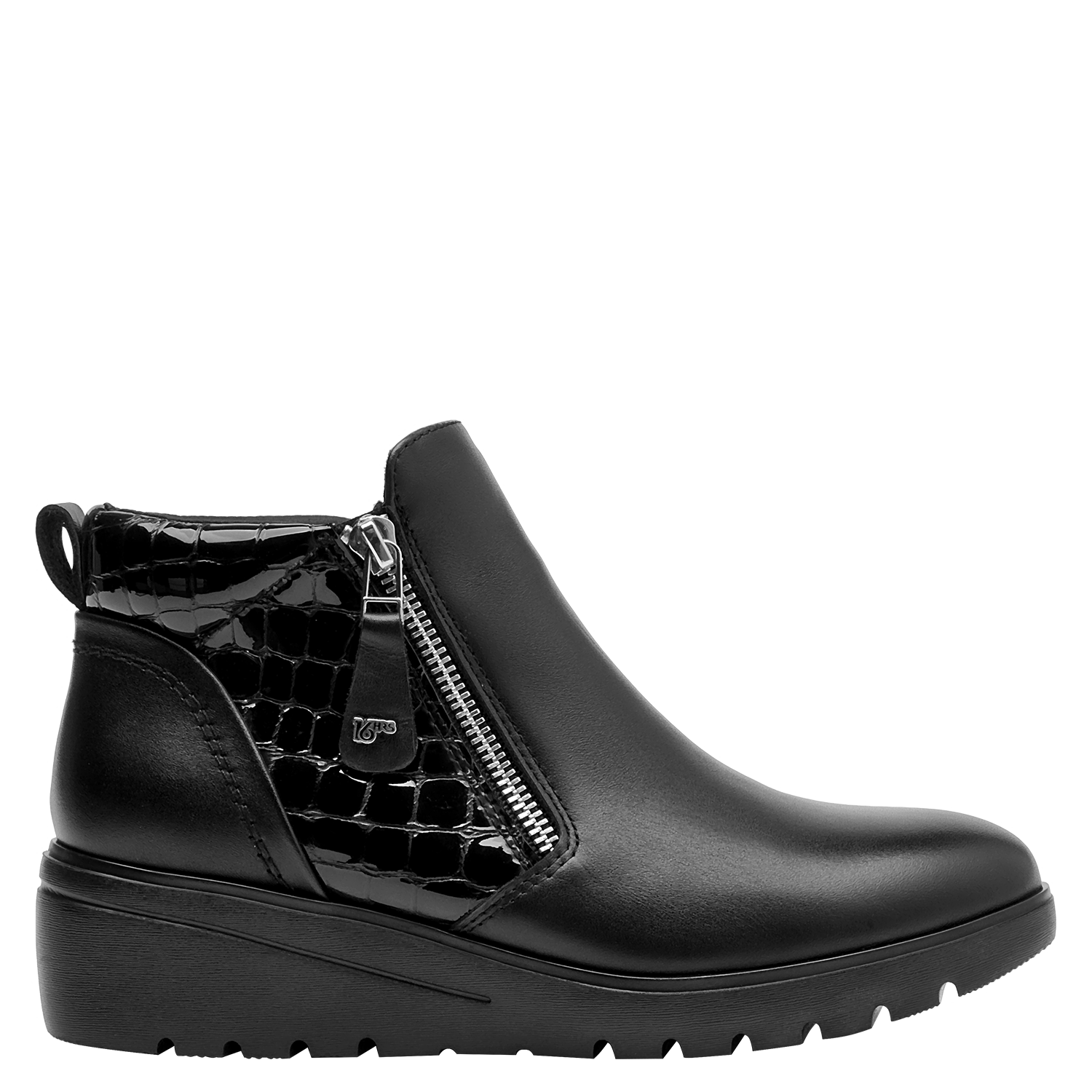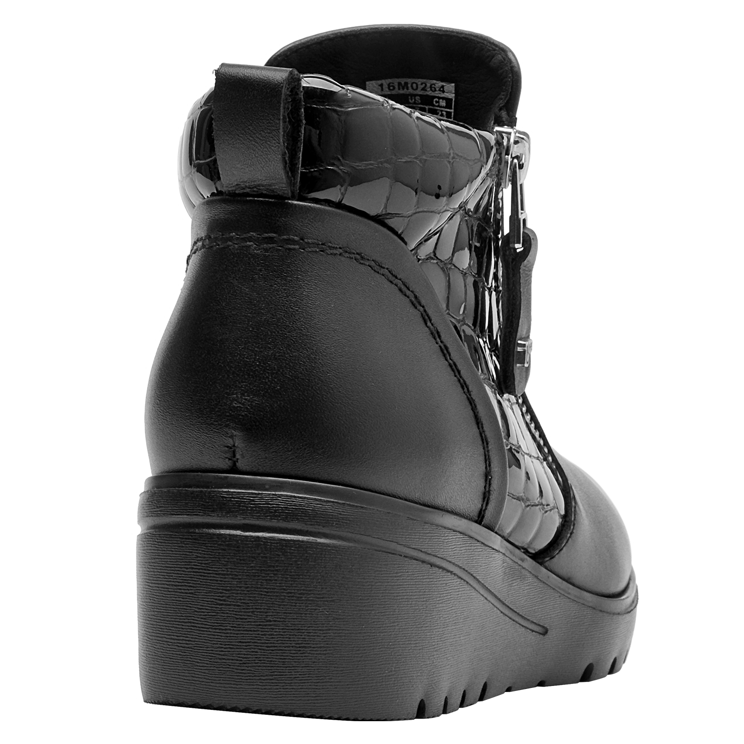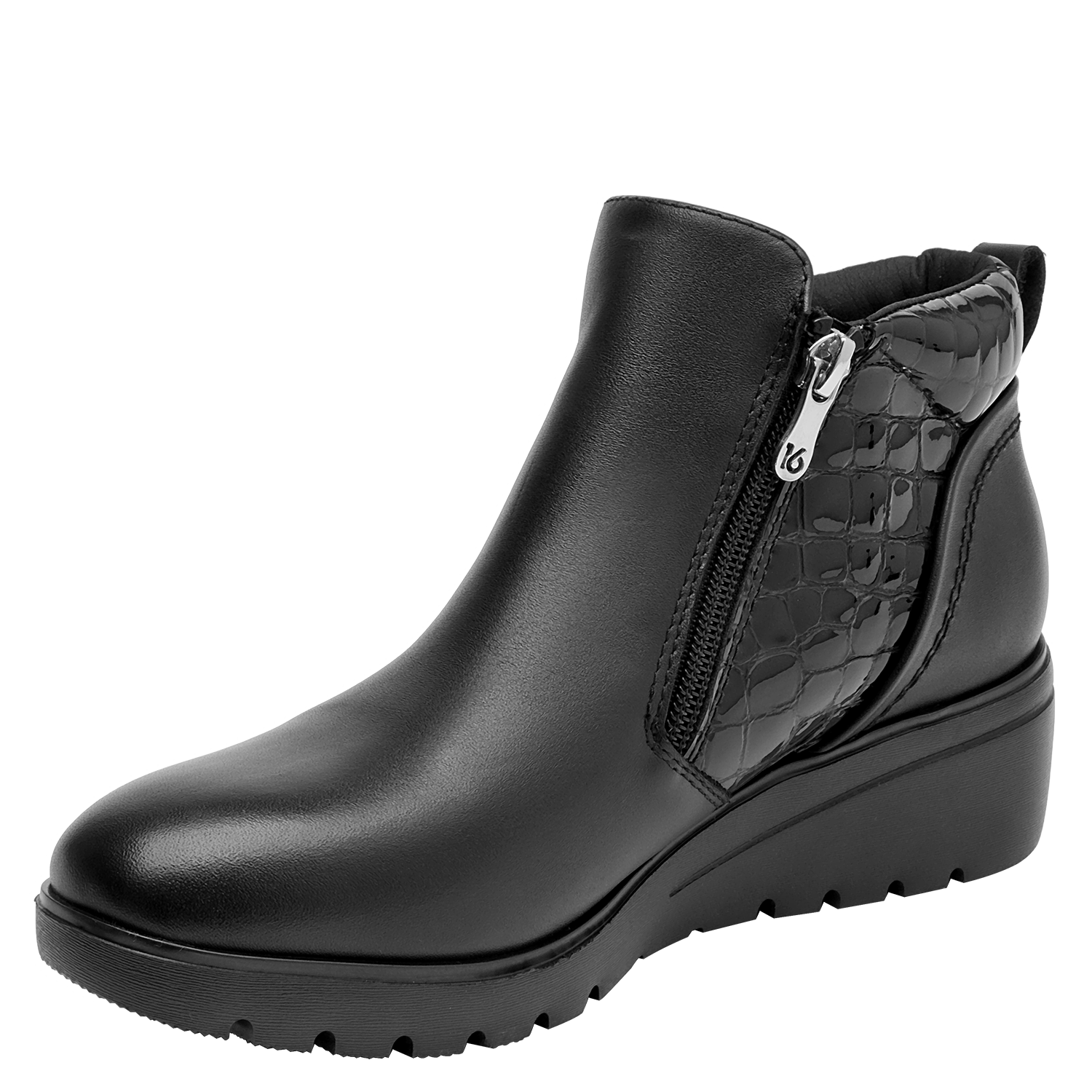 Botín con cuña para mujer en cuero negro, de punta redonda y altura de 5 cm. Su diseño limpio resalta el acabado liso del cuero y la cuña continua que suma elevación sutil con sensación estable. Incluye interior de microfibra suave y un perfil atemporal que facilita combinarlo en múltiples ocasiones.