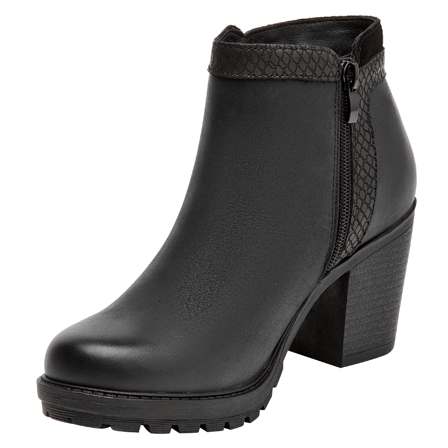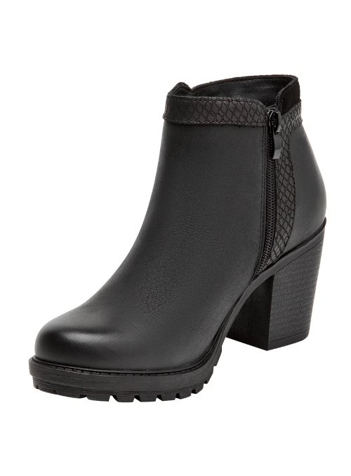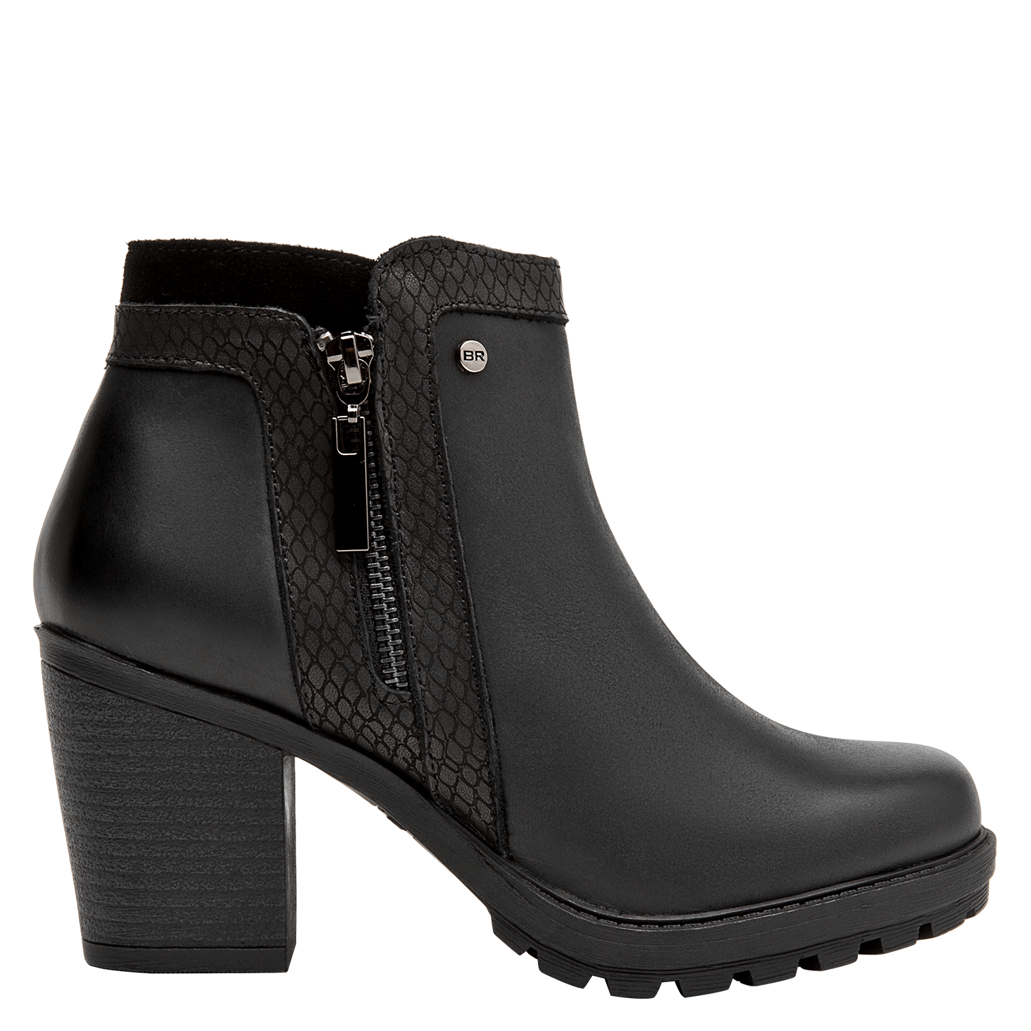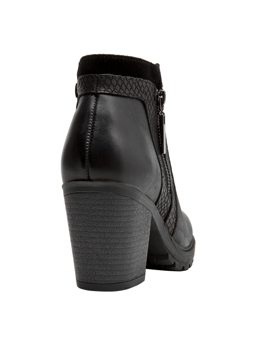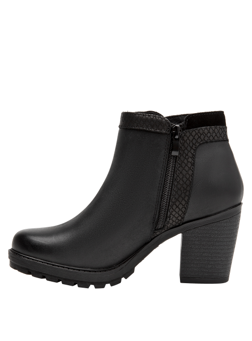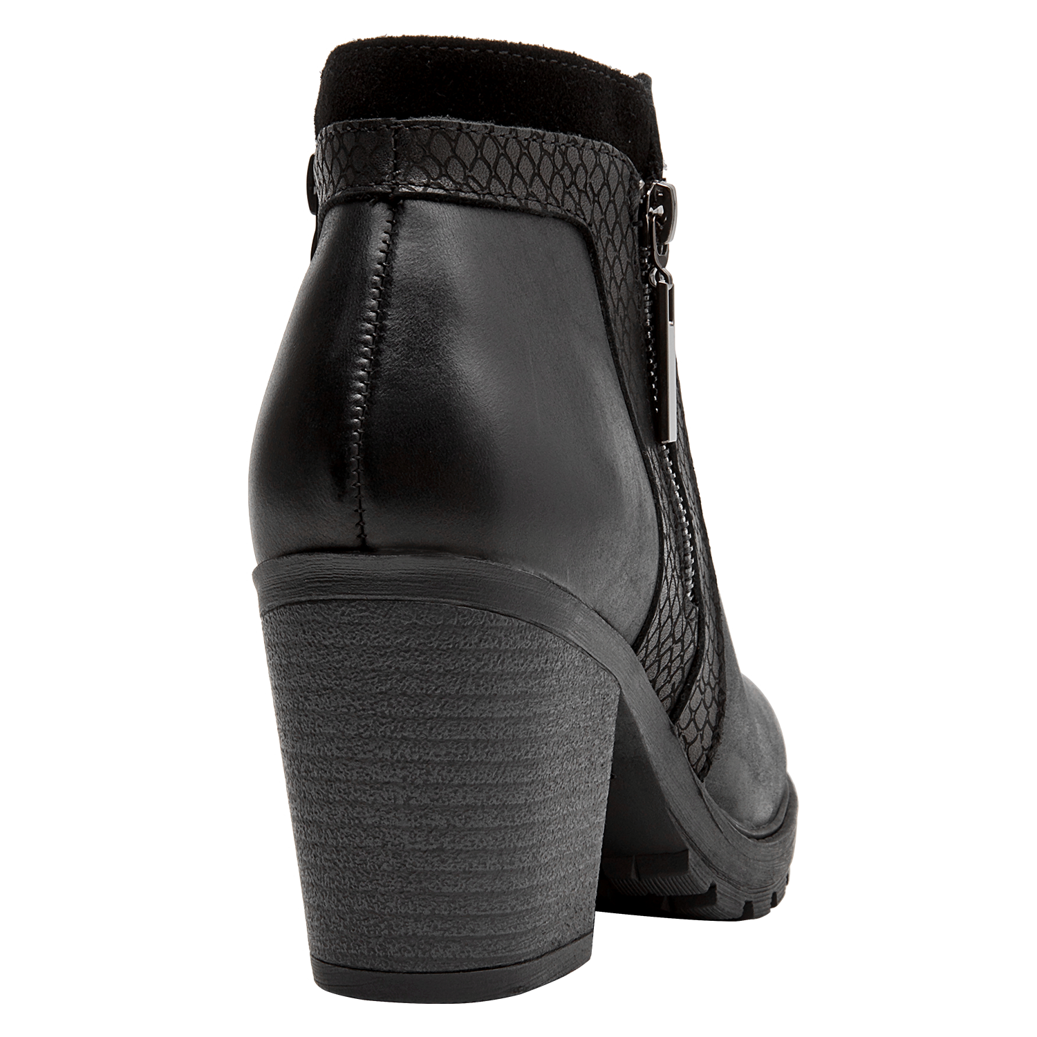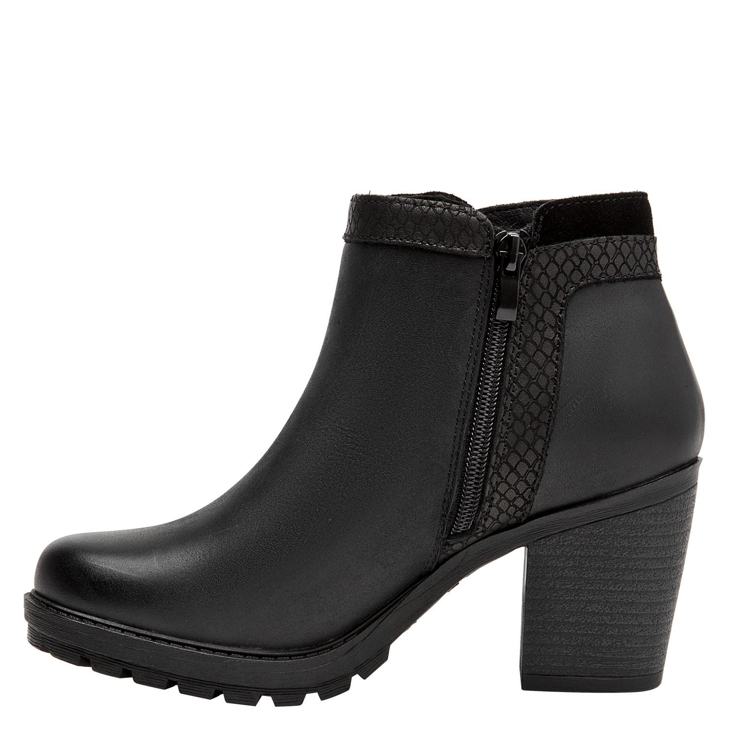 Botín de tacón bloque para mujer en cuero negro, con punta puntiaguda y taco de 8 cm. Su diseño limpio y estilizado realza una estética moderna y versátil. Fabricado en cuero con forro sintético/textil, ofrece un look pulido ideal para acompañar distintas ocasiones, manteniendo una presencia sofisticada sin excesos.
