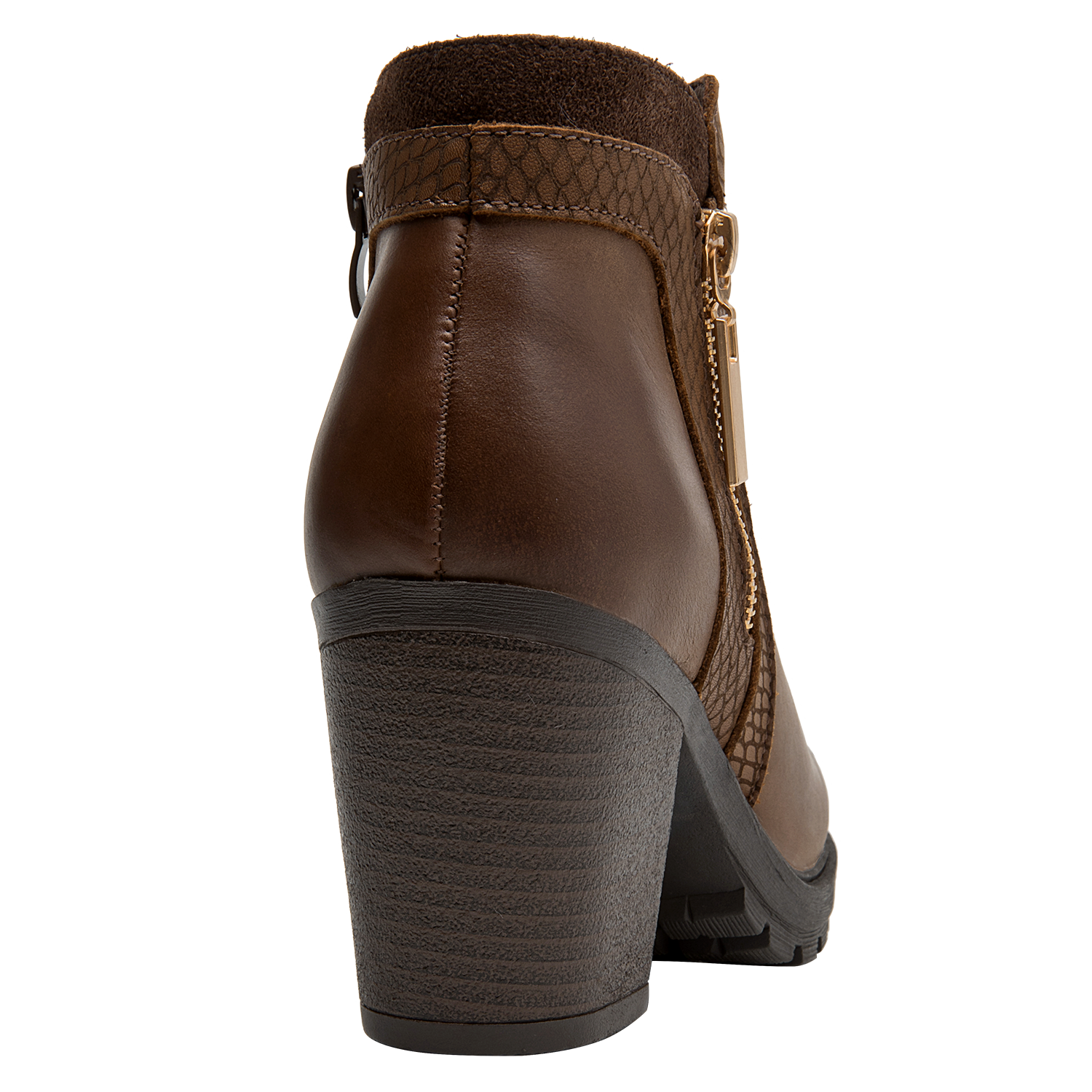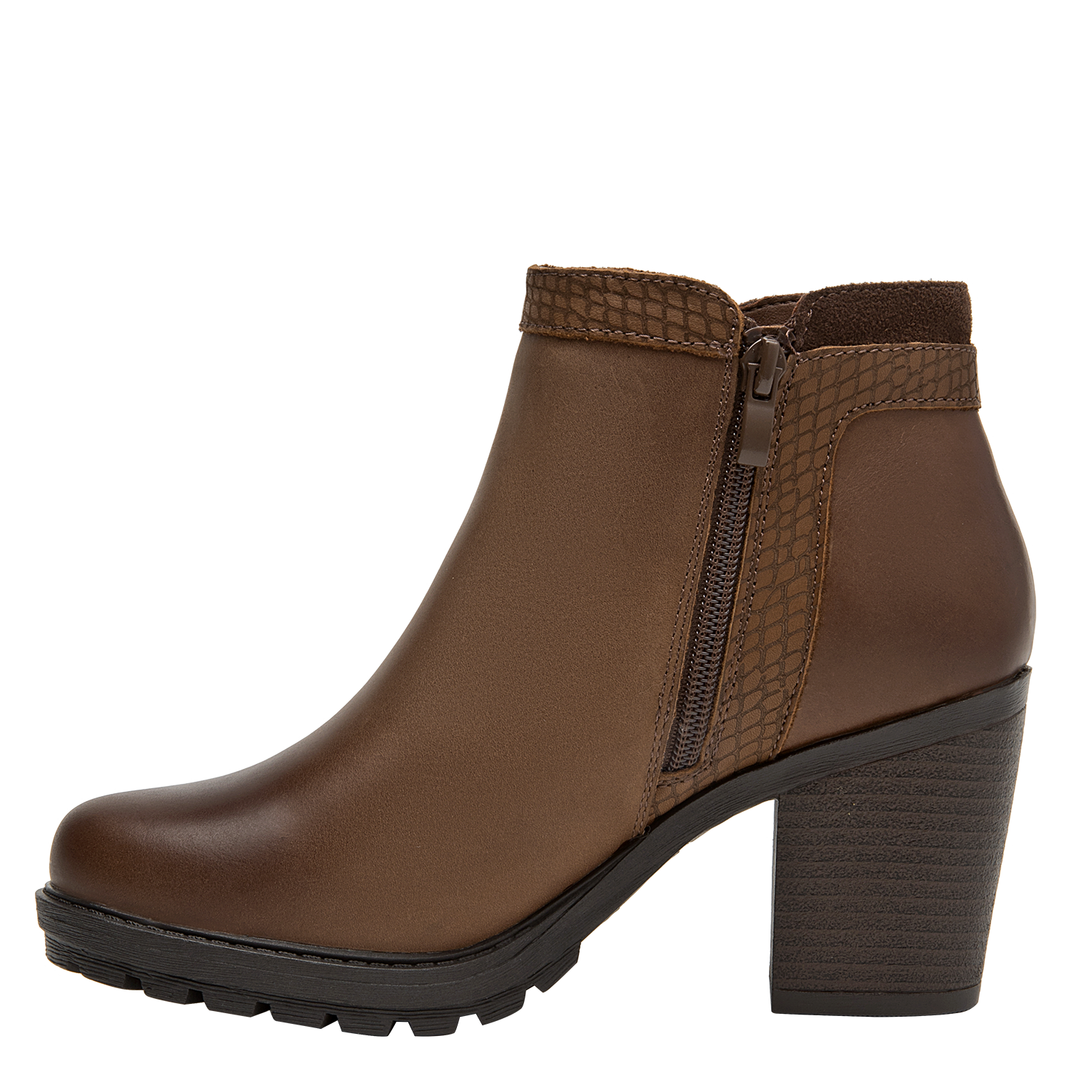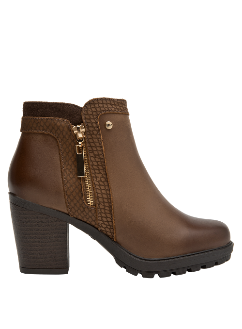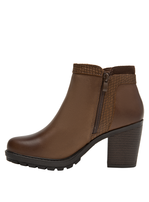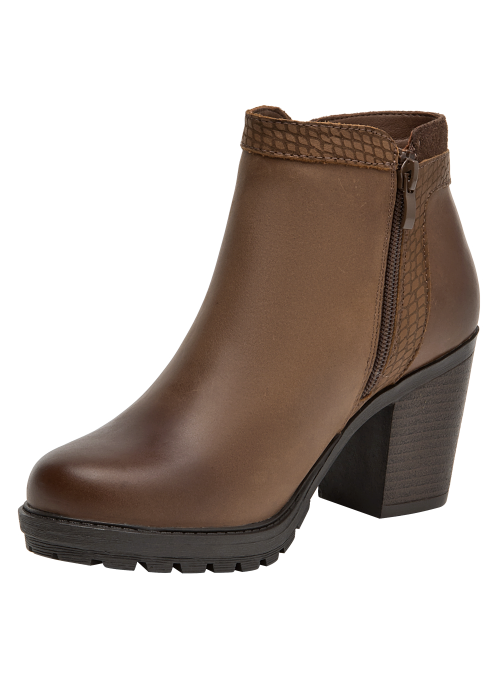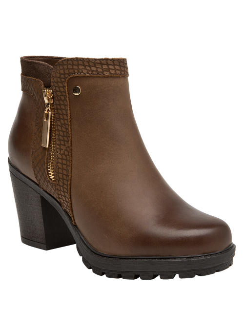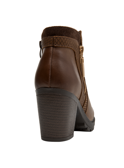 Botín de cuero para mujer en color café, con punta puntiaguda y taco bloque de 8 cm que aporta elevación y estabilidad. La capellada de cuero se complementa con forro sintético/textil para un calce agradable. Su diseño sobrio y versátil, de líneas limpias, eleva cualquier look con un aire contemporáneo.