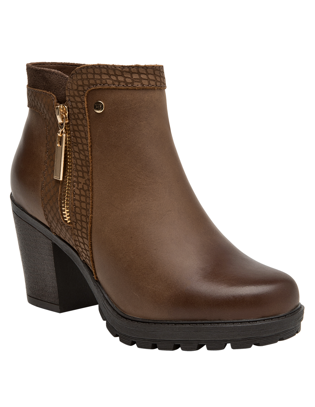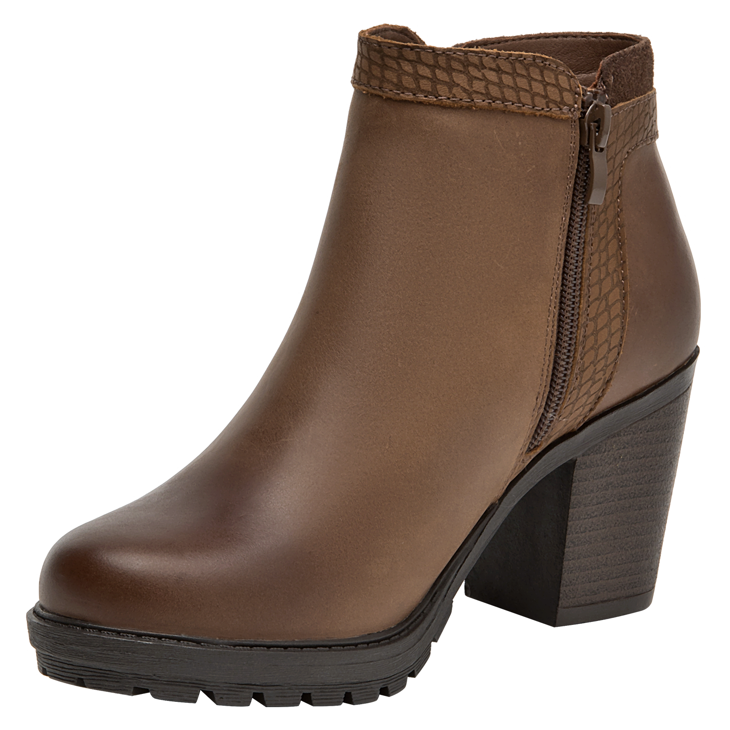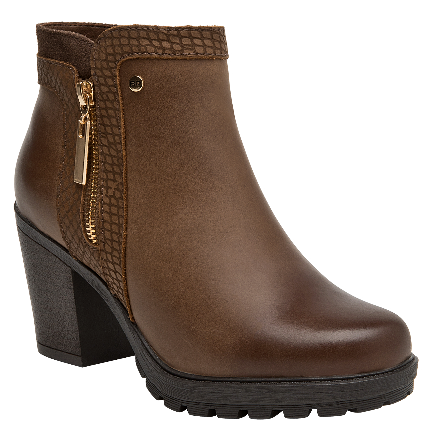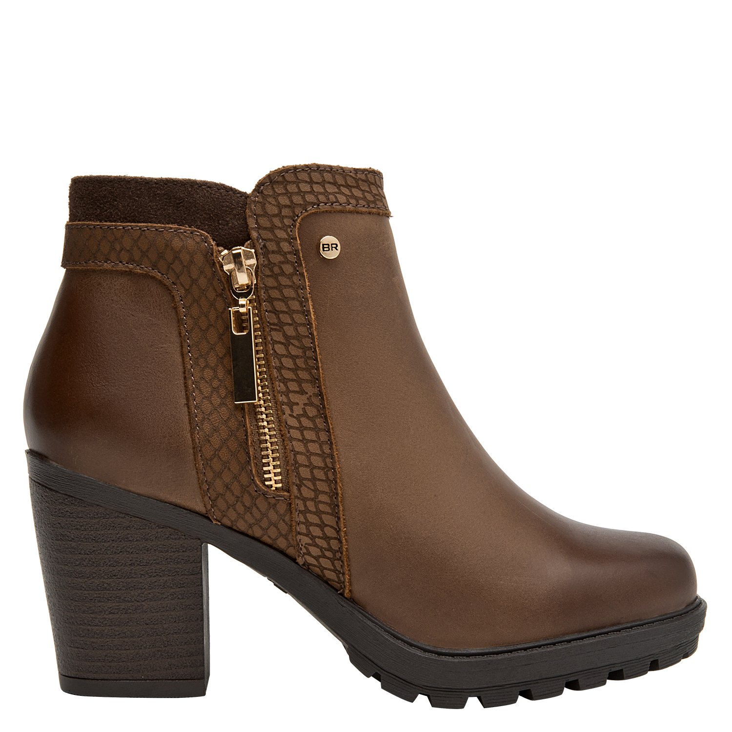 Botín de cuero para mujer en color café, con punta puntiaguda y taco bloque de 8 cm que aporta elevación y estabilidad. La capellada de cuero se complementa con forro sintético/textil para un calce agradable. Su diseño sobrio y versátil, de líneas limpias, eleva cualquier look con un aire contemporáneo.