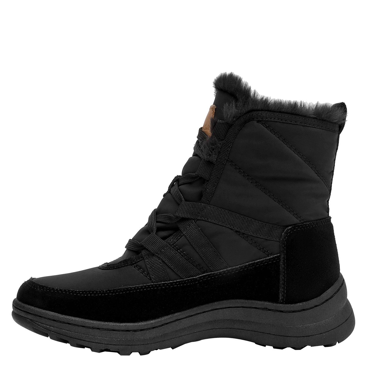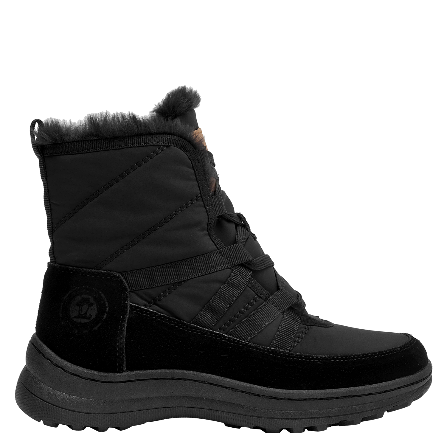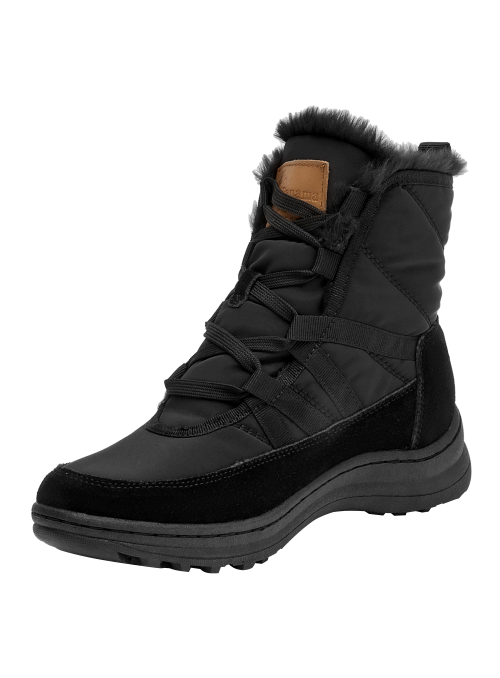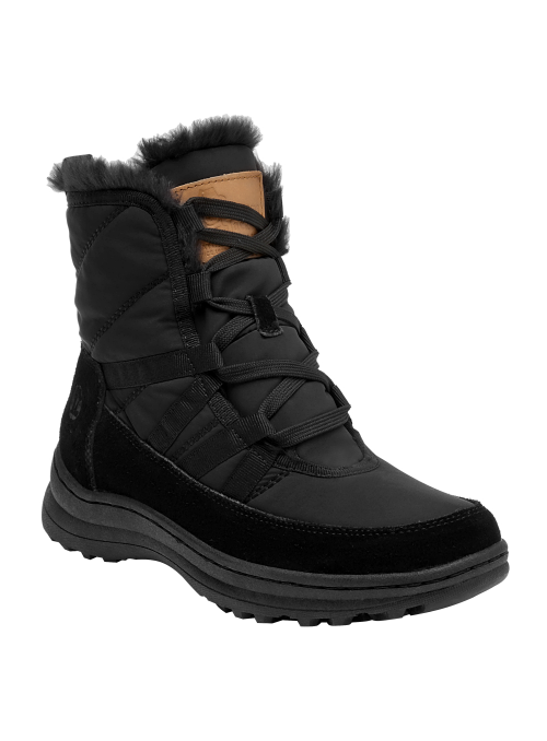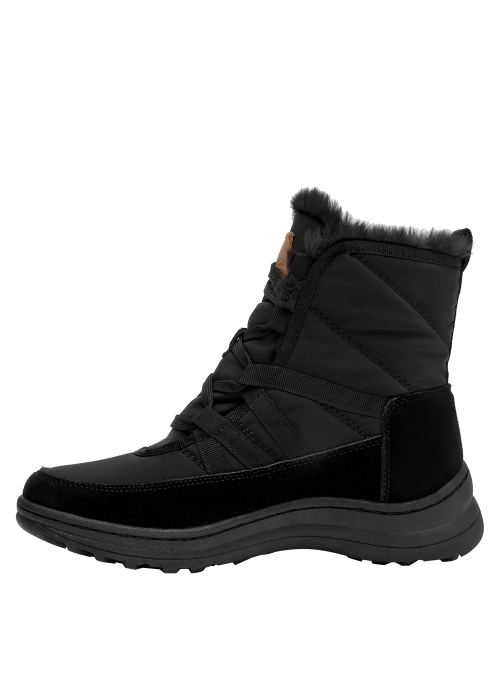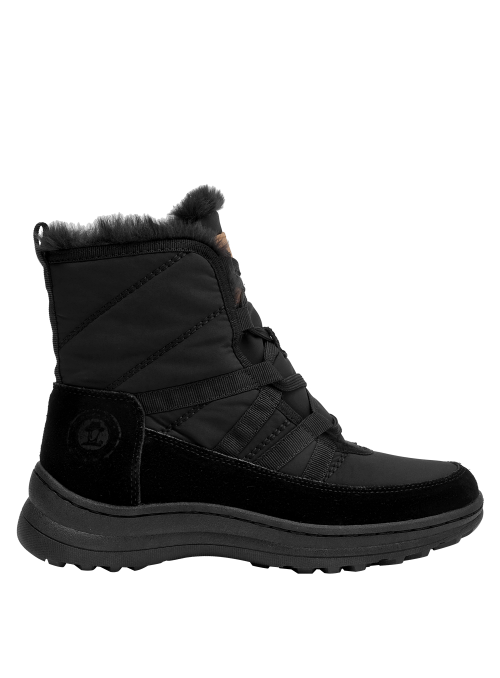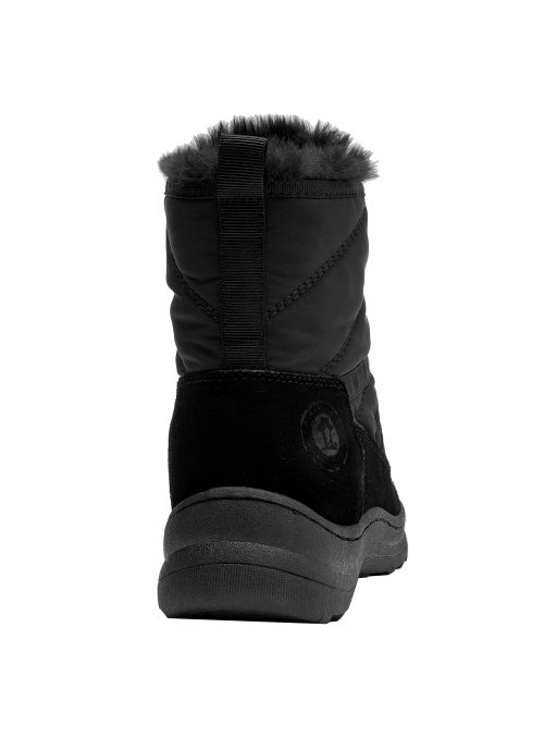 Botín urbano de mujer en color negro, confeccionado en material textil con forro textil/pelo de tacto suave. Incorpora punta redonda y una suela plana de 5 cm que aporta una elevación sutil y una base estable. Su diseño depurado y versátil se adapta a estilos casuales y relajados, manteniendo un perfil estilizado para el día a día.