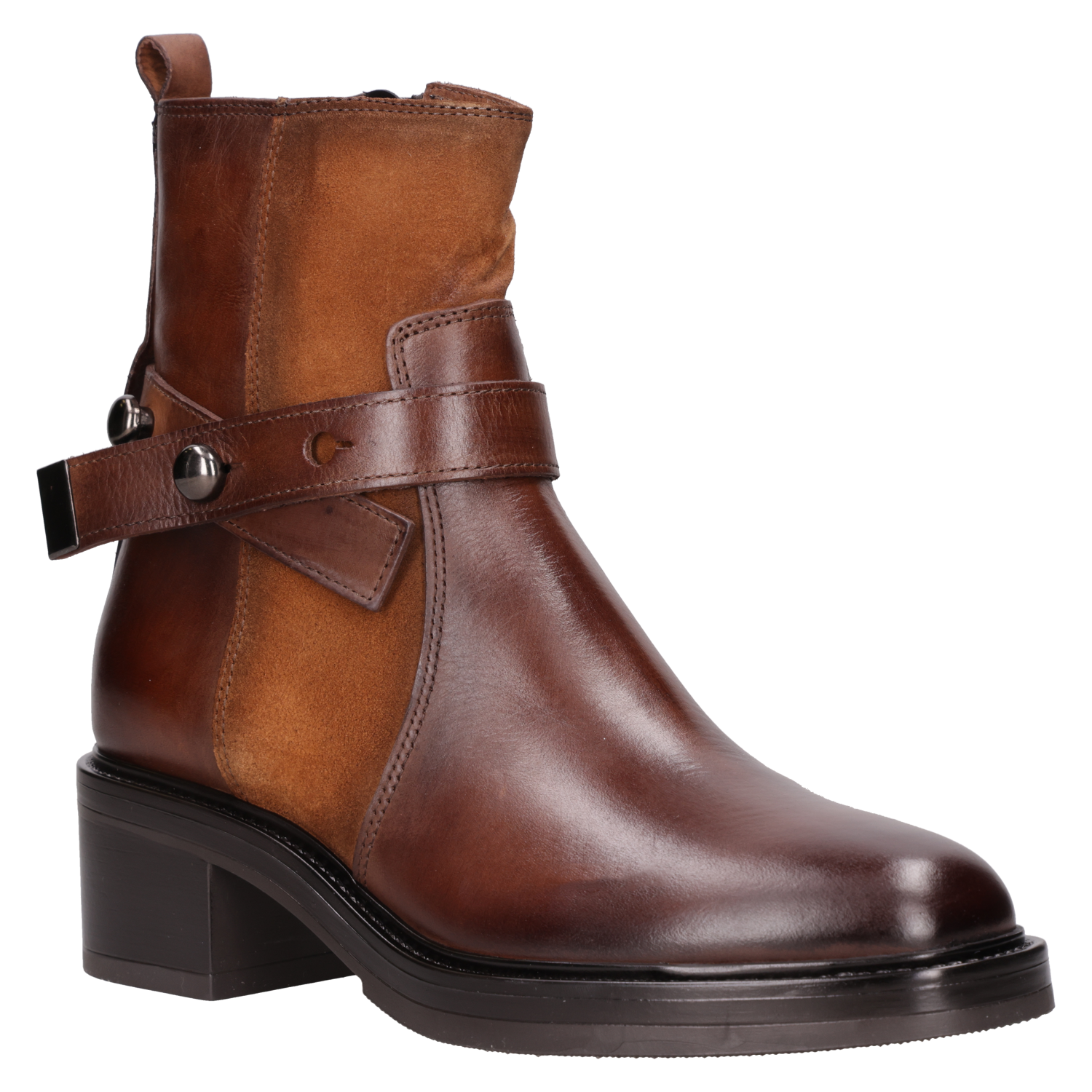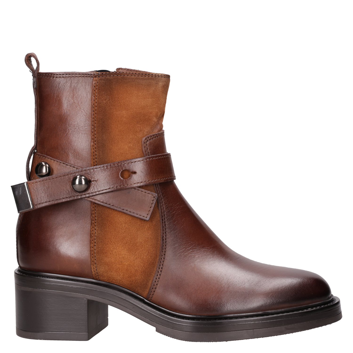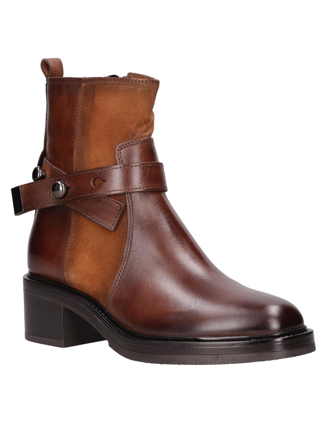Luce con actitud y elegancia con este botín café de cuero, perfecto para marcar tendencia. Con un diseño vanguardista y una combinación de texturas que destacan su carácter, este modelo cuenta con un taco bloque de 5 cm que asegura comodidad sin sacrificar estilo. Sus detalles metálicos y el cierre lateral añaden un toque disruptivo. Combínalo con un vestido midi para un look impactante o con jeans ajustados para resaltar tu esencia urbana.