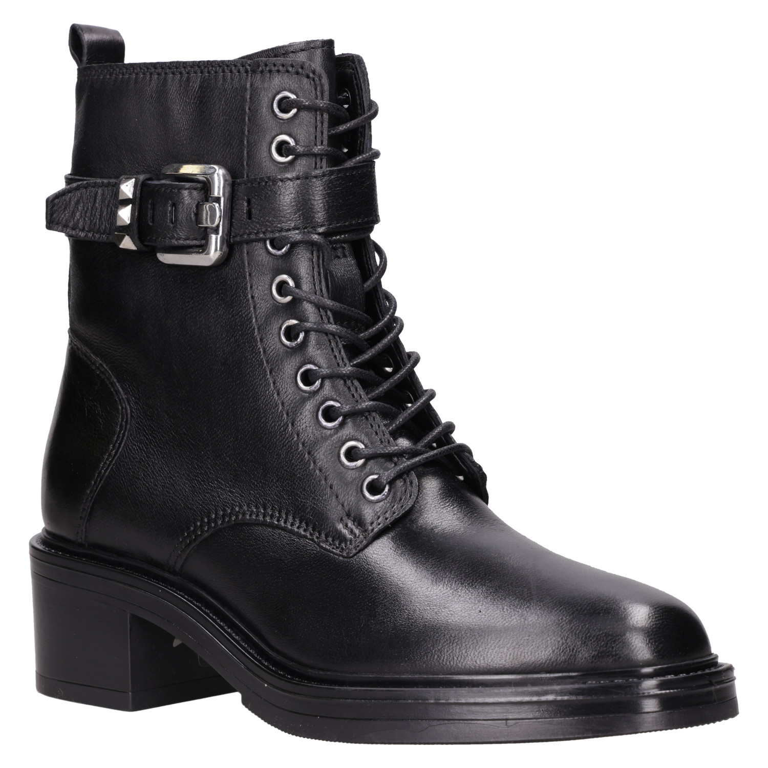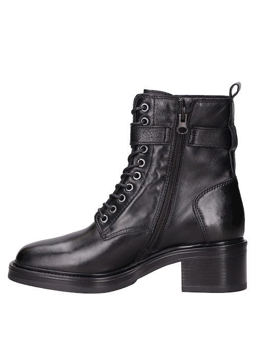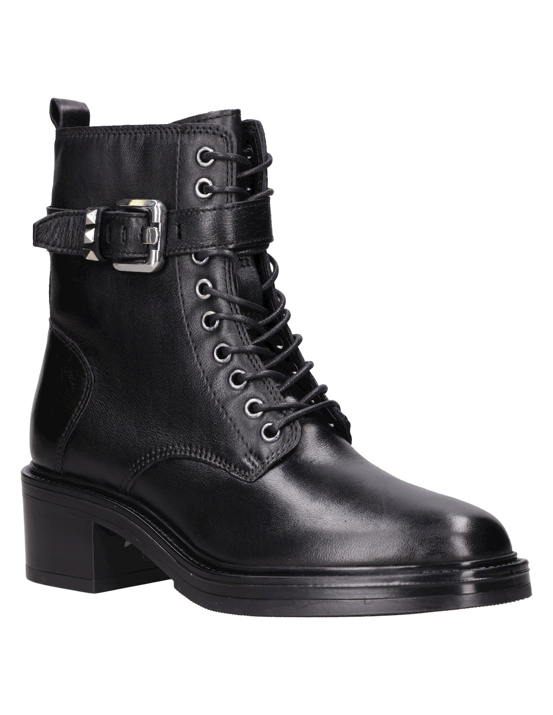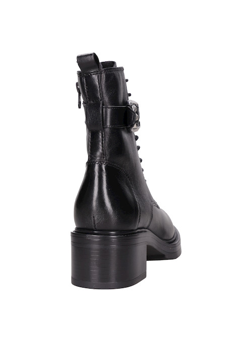 Embrace your edgy side con estos botines de cuero negro, que destacan por su diseño vanguardista y actitud desafiante. Con un taco bloque de 5 cm y una punta redonda, son perfectos para marcar tendencia en cualquier ocasión. Los detalles metálicos, como la hebilla y las tachas, aportan un carácter único y vibrante a tu look. Combínalos con jeans ajustados y una camisa de oversize para un impacto visual moderno y atrevido, o con un vestido fluido para un contraste urbano que no pasará desapercibido.