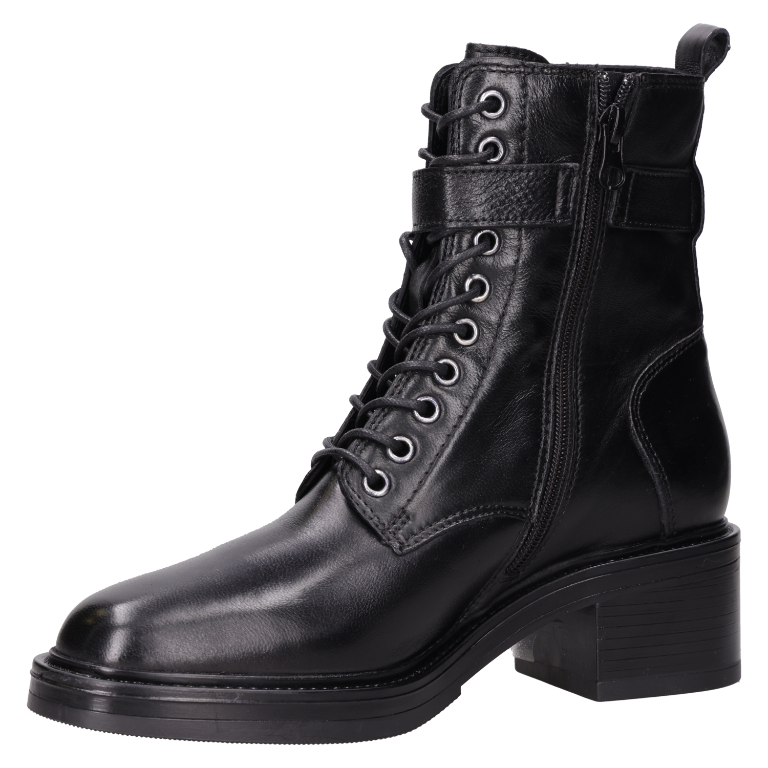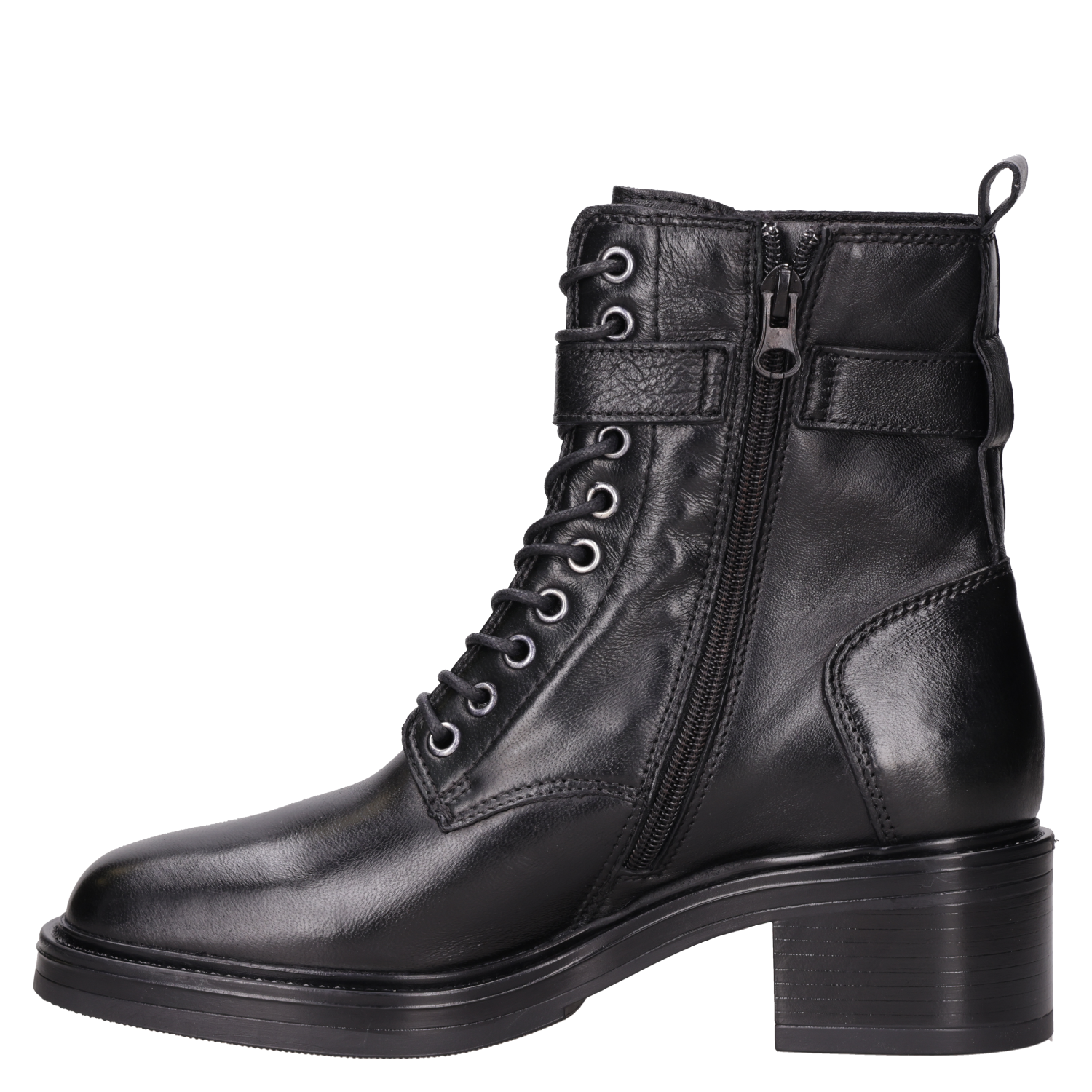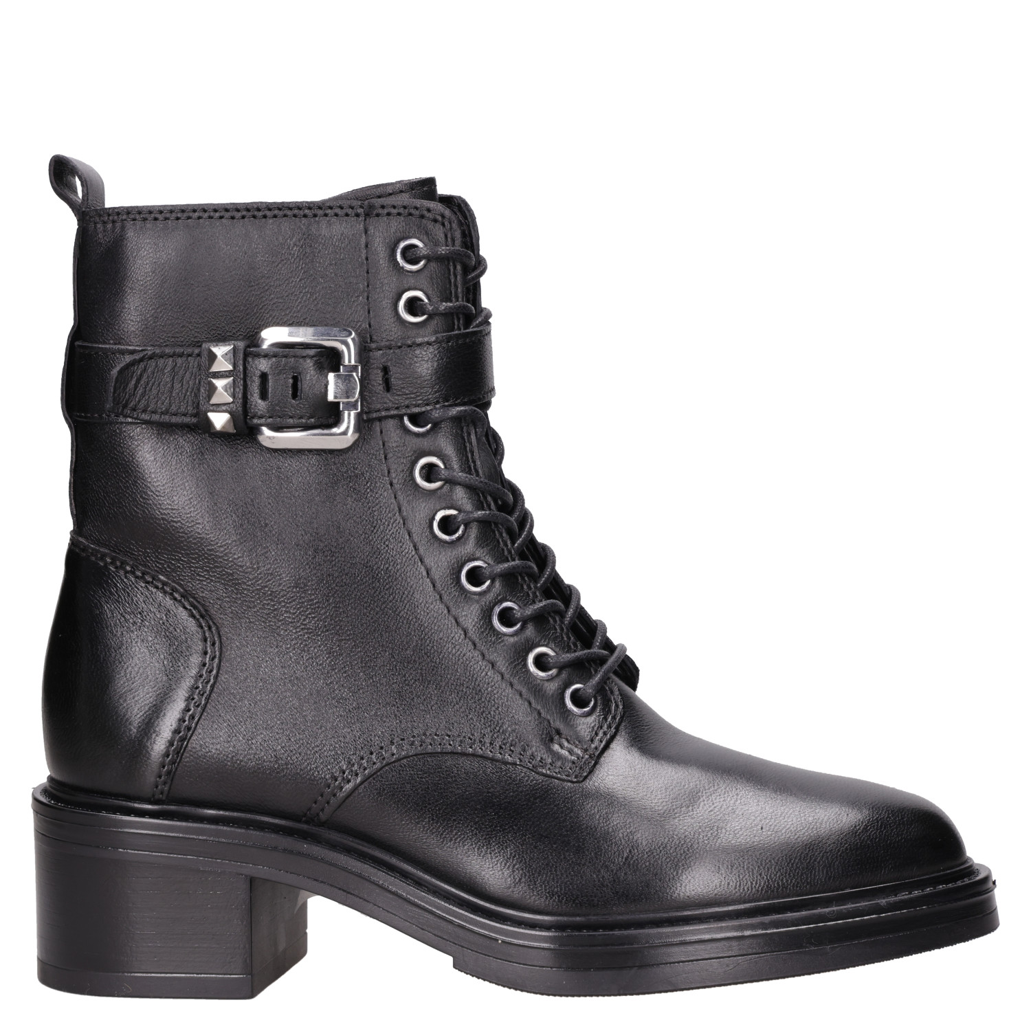 Embrace your edgy side con estos botines de cuero negro, que destacan por su diseño vanguardista y actitud desafiante. Con un taco bloque de 5 cm y una punta redonda, son perfectos para marcar tendencia en cualquier ocasión. Los detalles metálicos, como la hebilla y las tachas, aportan un carácter único y vibrante a tu look. Combínalos con jeans ajustados y una camisa de oversize para un impacto visual moderno y atrevido, o con un vestido fluido para un contraste urbano que no pasará desapercibido.