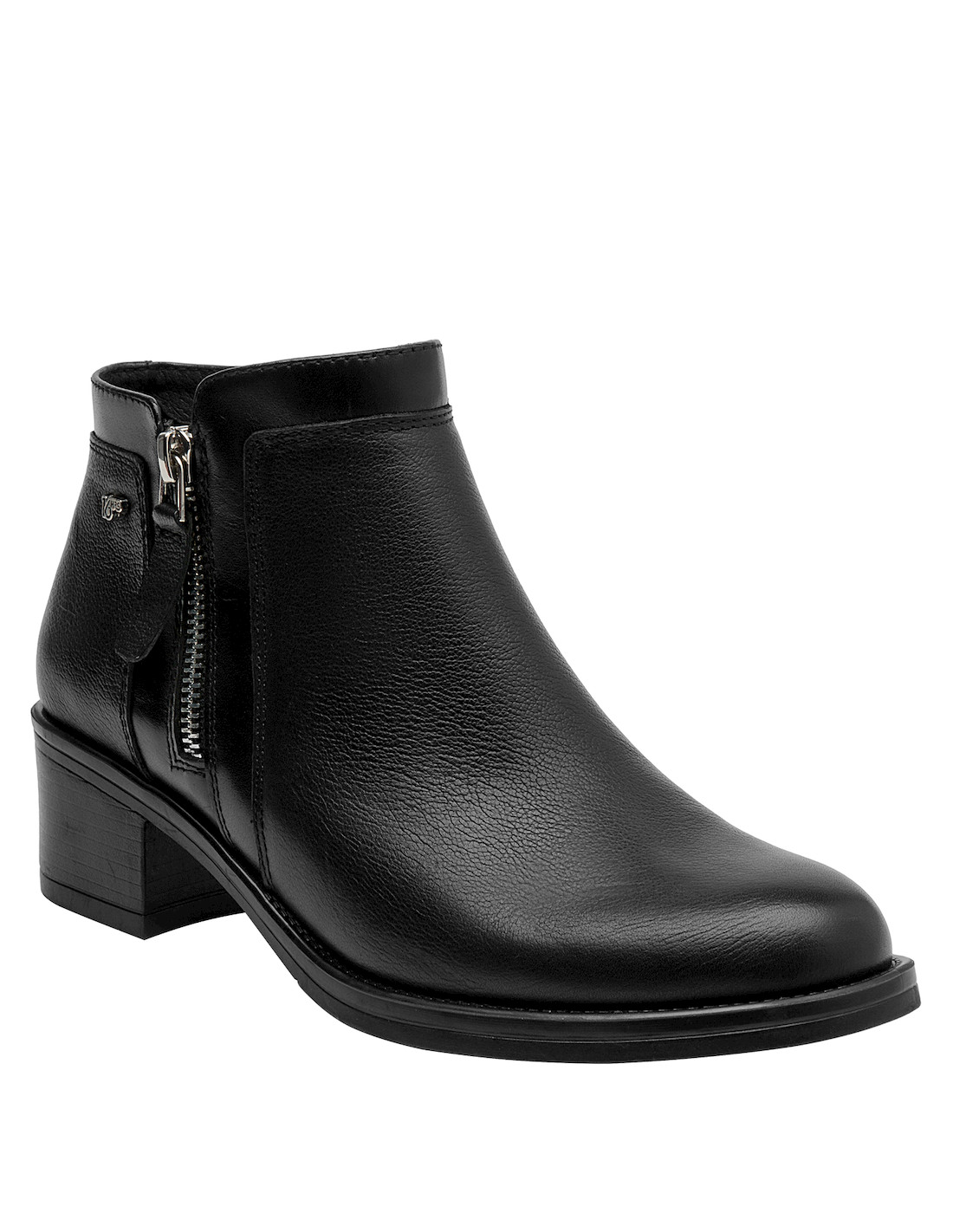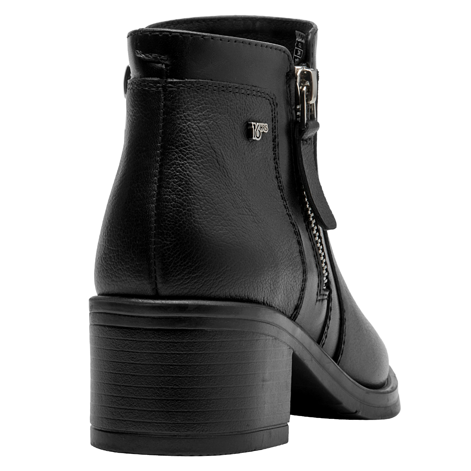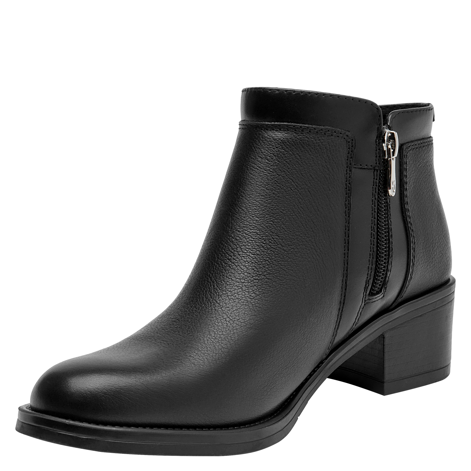 Ambos en chic y comodidad, estos botines de cuero negro para mujer son la elección ideal para cada jornada. Con un diseño de punta redonda y un taco bloque de 5 cm, ofrecen estabilidad y un estilo urbano inigualable. El suave forro de on steam realza la sensación de bienestar, acompañando cada paso con ligereza y flexibilidad. Perfectos para combinar con tus jeans favoritos o una falda, añadiendo un toque elegante a tu rutina diaria.