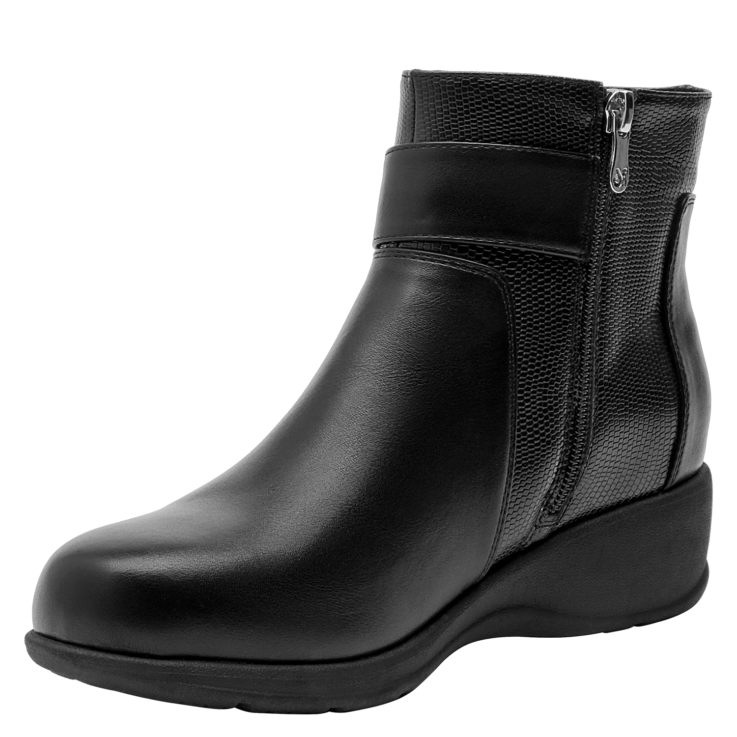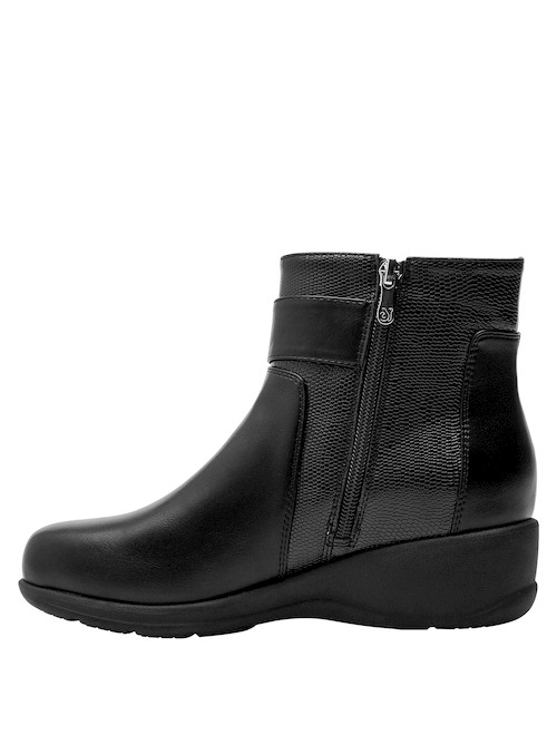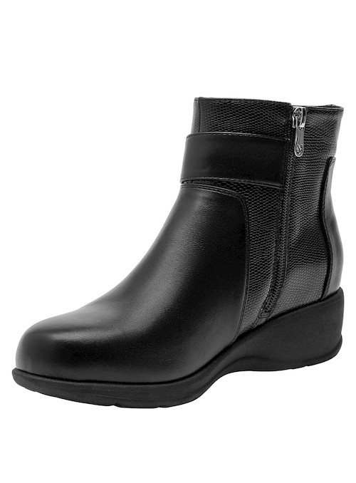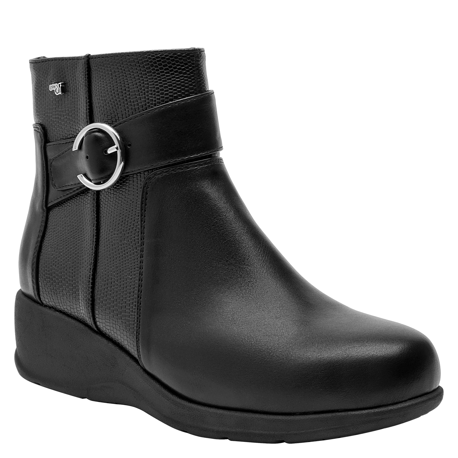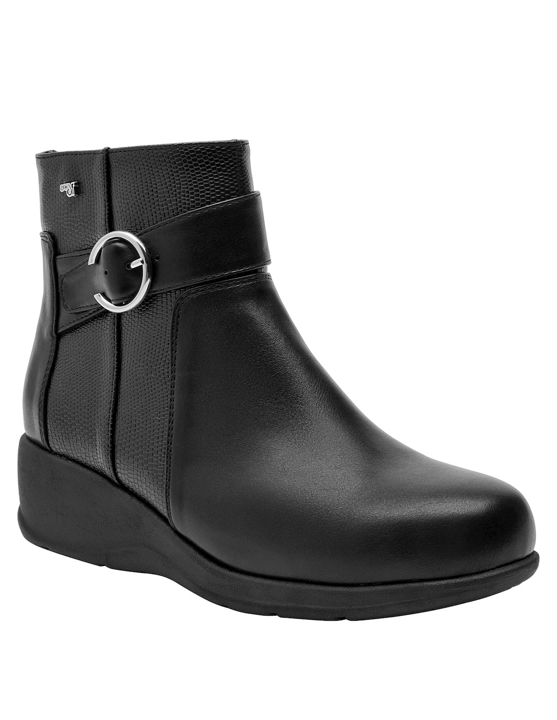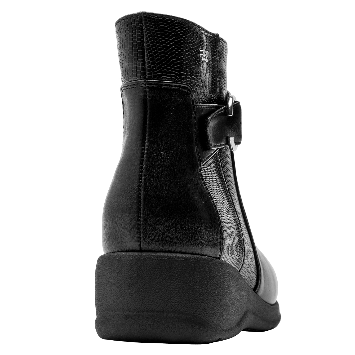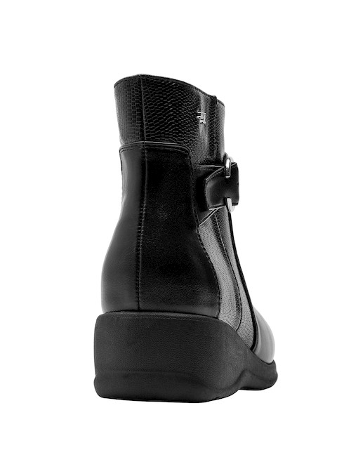 Abraza la elegancia de lo sencillo con nuestros botines de cuña negros, perfectos para cada momento del día. Su diseño redondeado y el acabado sintético de alta calidad ofrecen suavidad y un toque moderno. La cuña de 5 cm brinda la altura justa sin sacrificar la comodidad, permitiendo que cada paso sea ligero y flexible. Ideal para combinar con jeans ajustados o un vestido casual. Siéntete bien mientras acompañas el ritmo de tu vida urbana.