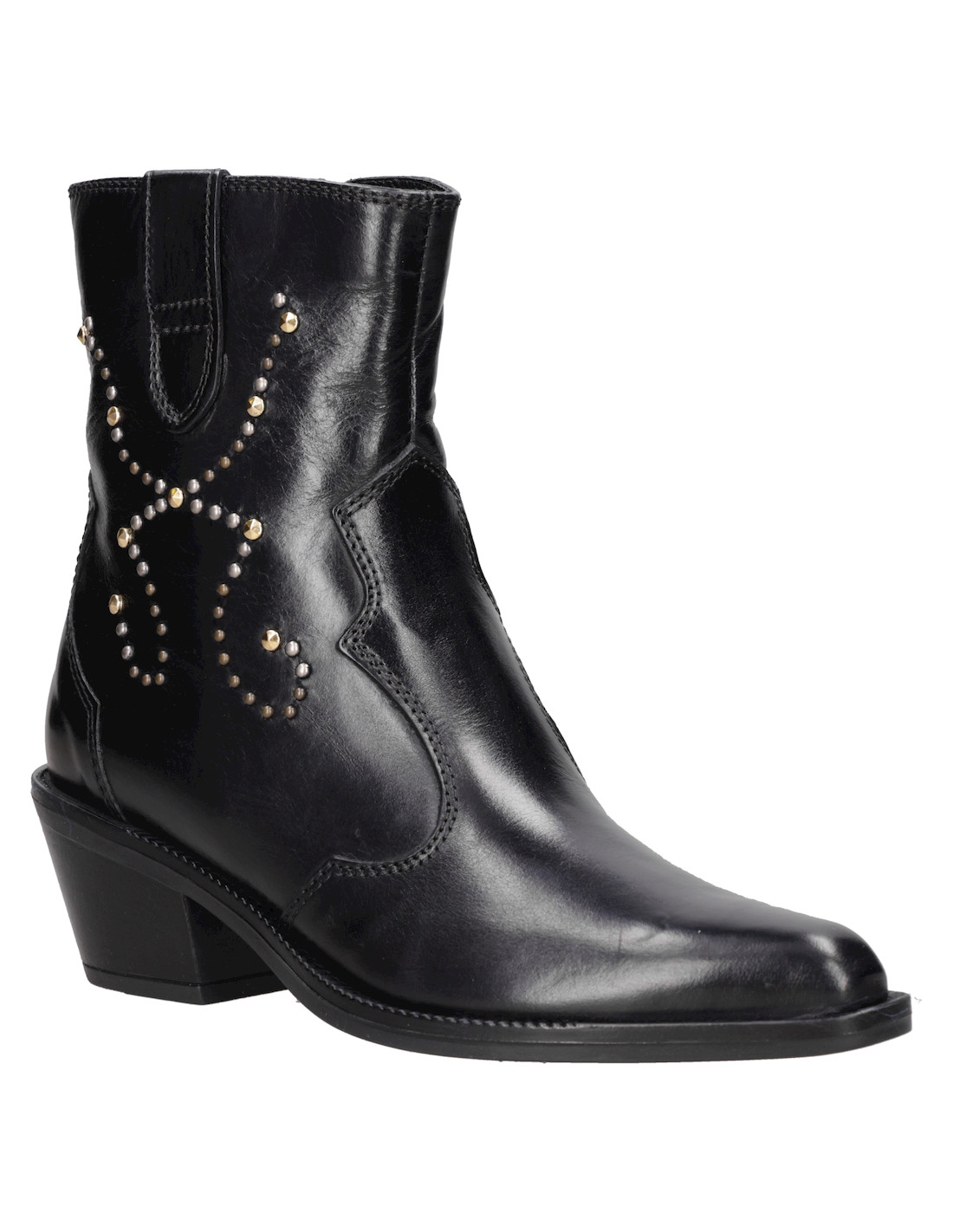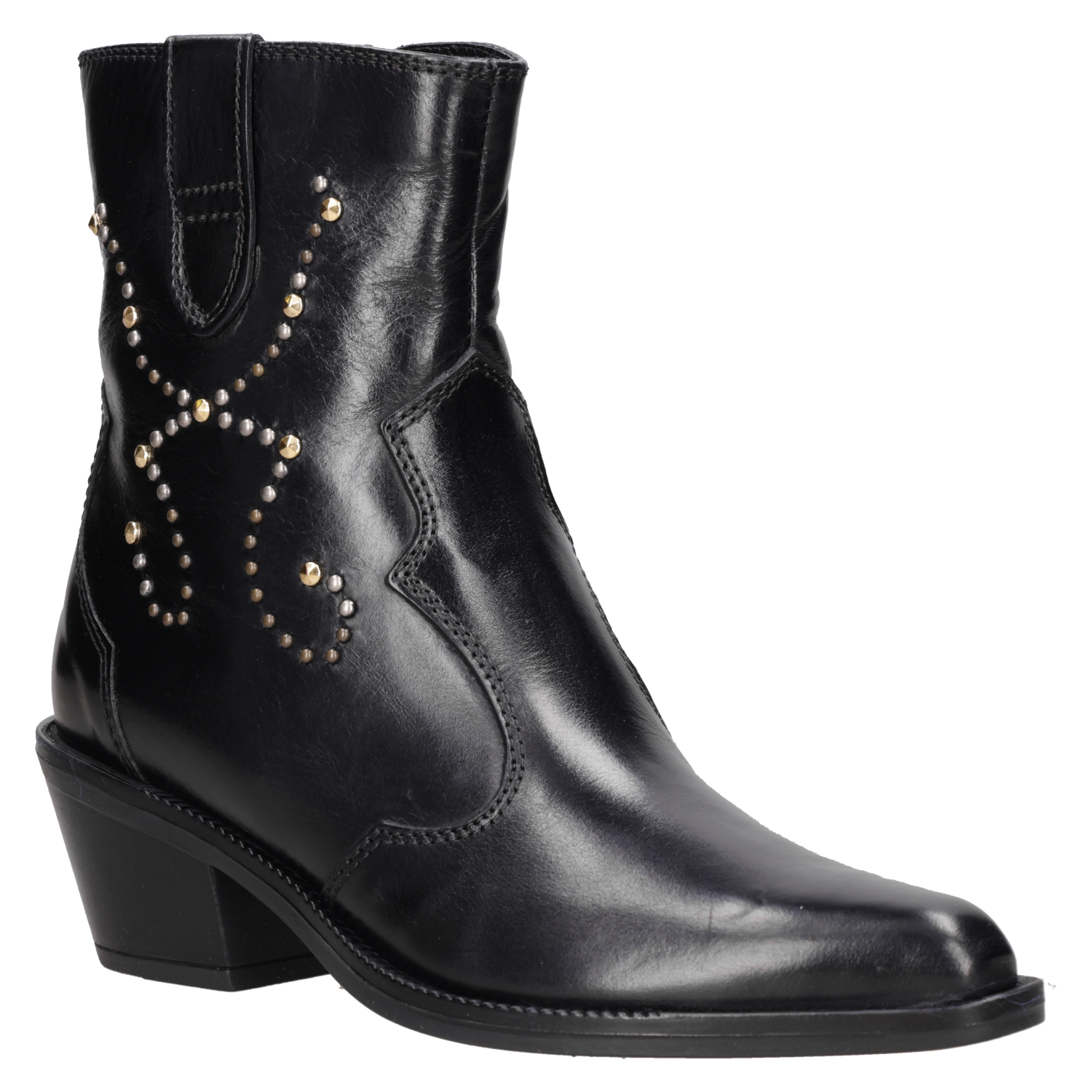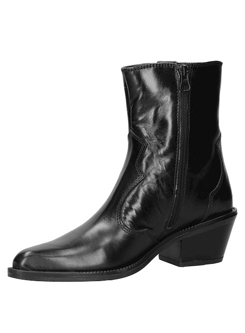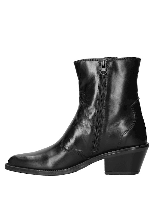 Este audaz botín de cuero negro para mujer destaca por su puntera puntiaguda y un taco bloque de 6 cm, ideal para marcar tendencias. Los detalles metálicos aportan un toque rockero y contemporáneo, mientras que su silueta urbana se ajusta a un look lleno de personalidad. Con acabados impecables, esta pieza es perfecta para realzar tus outfits. Combínalo con un vestido fluido o unos jeans ajustados para un contraste impactante.