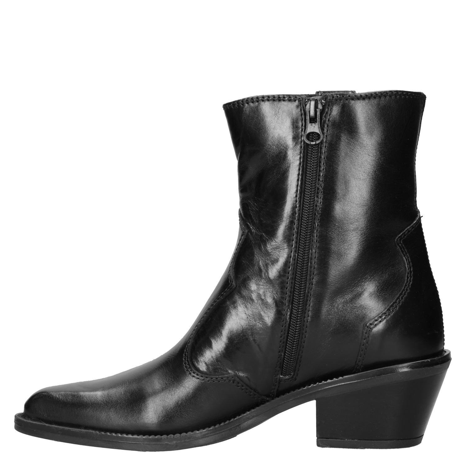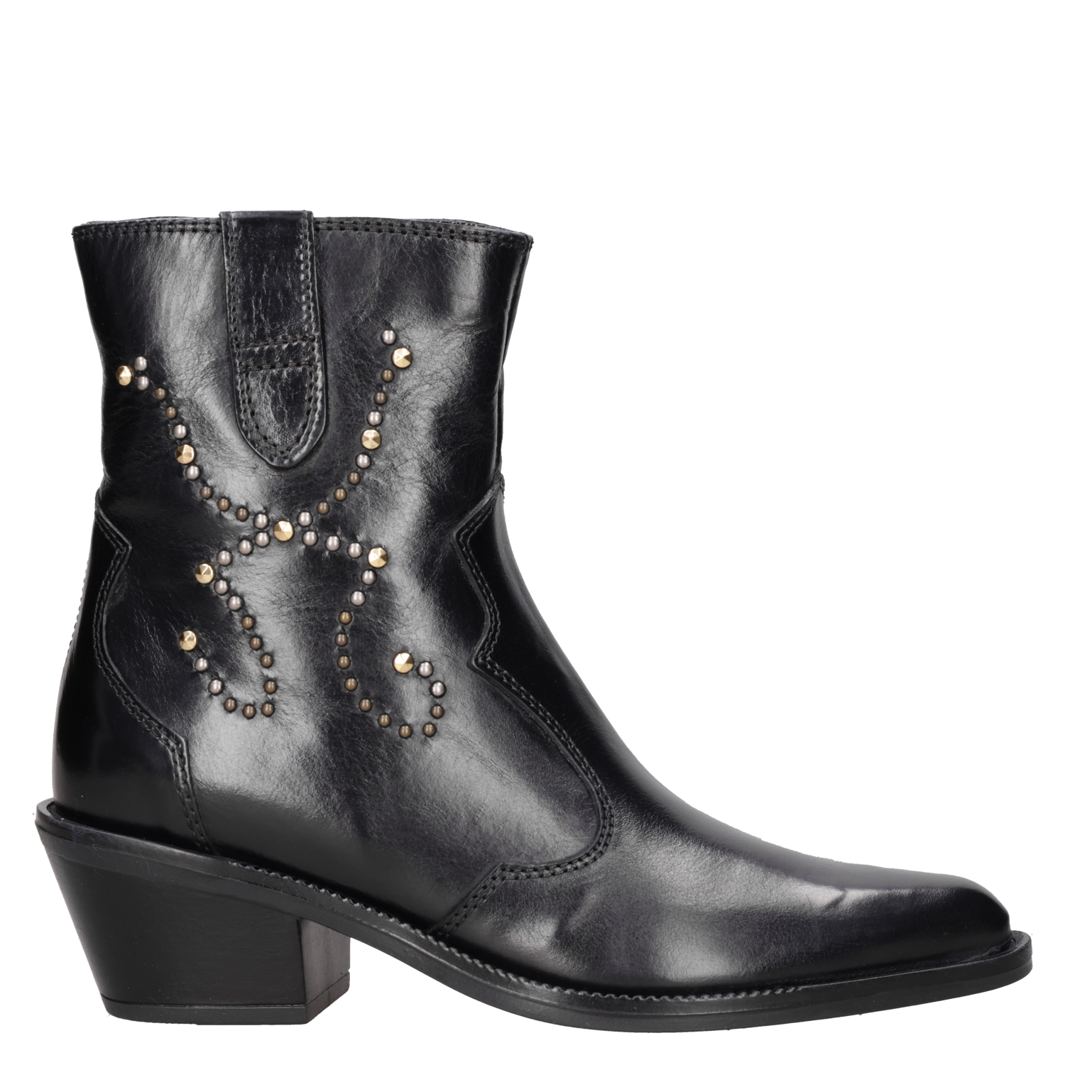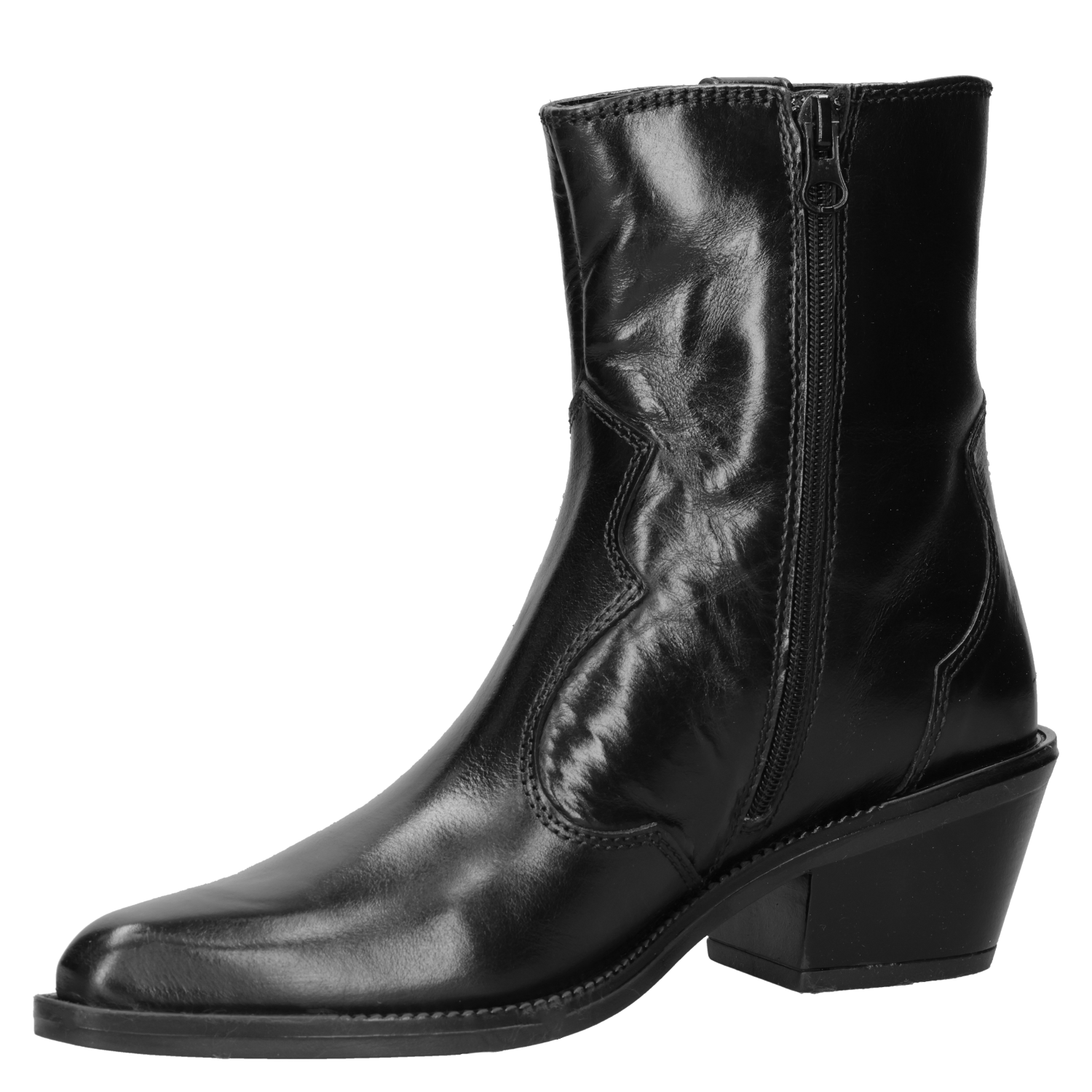 Este audaz botín de cuero negro para mujer destaca por su puntera puntiaguda y un taco bloque de 6 cm, ideal para marcar tendencias. Los detalles metálicos aportan un toque rockero y contemporáneo, mientras que su silueta urbana se ajusta a un look lleno de personalidad. Con acabados impecables, esta pieza es perfecta para realzar tus outfits. Combínalo con un vestido fluido o unos jeans ajustados para un contraste impactante.