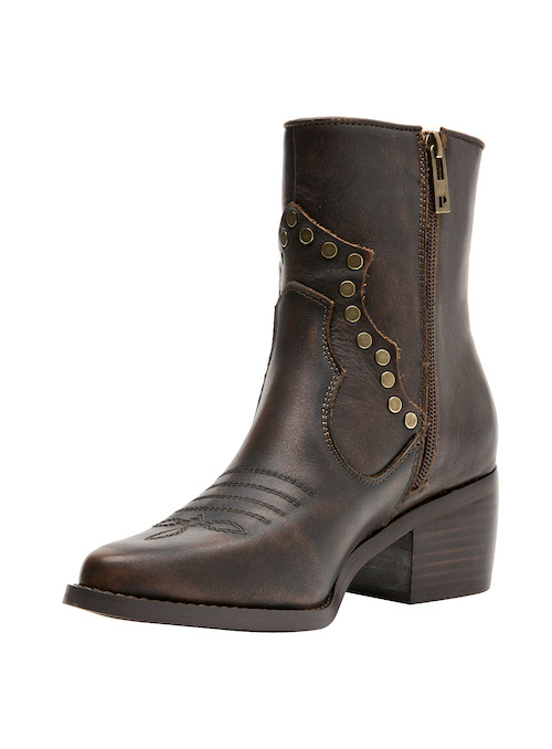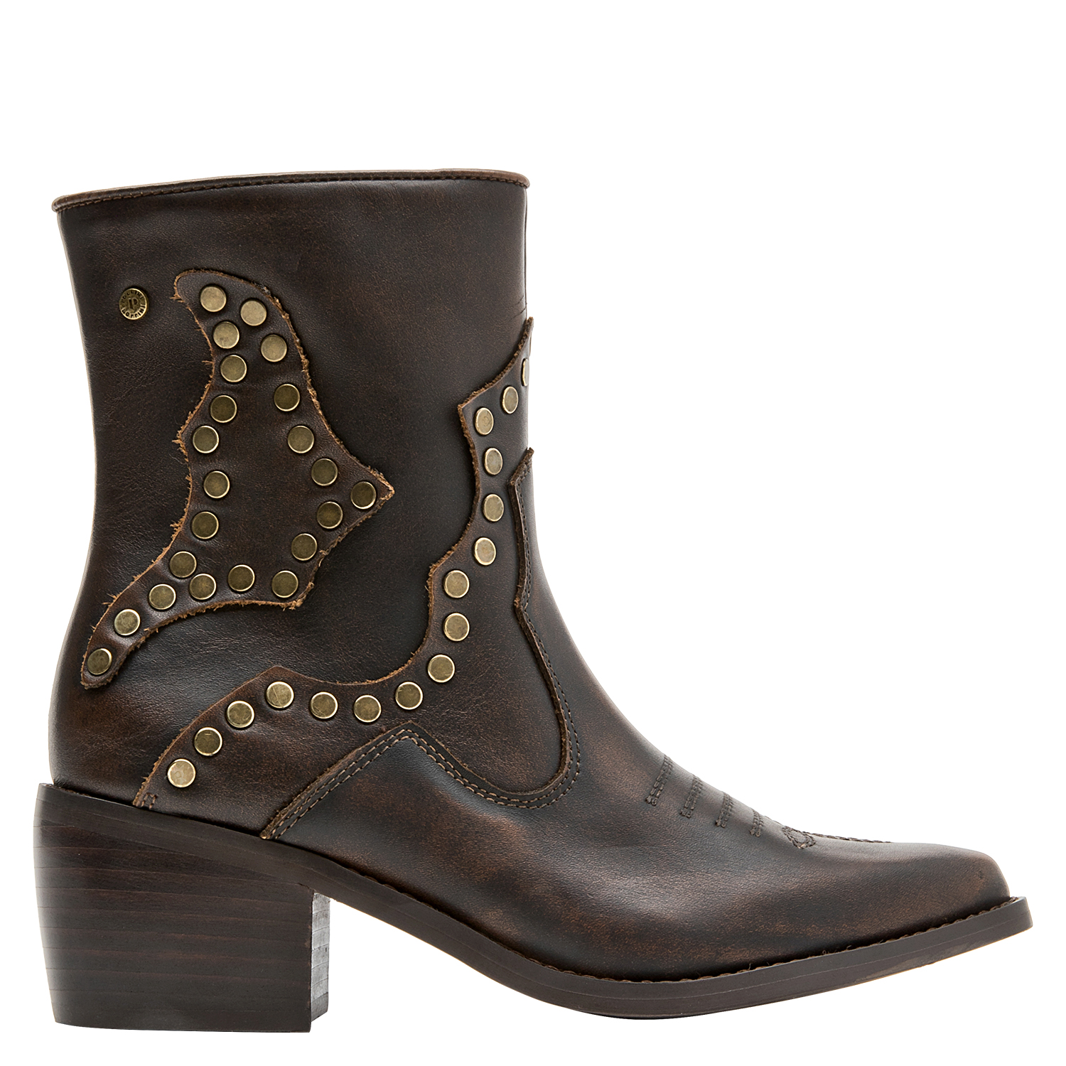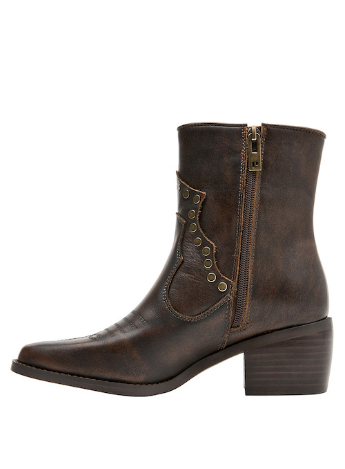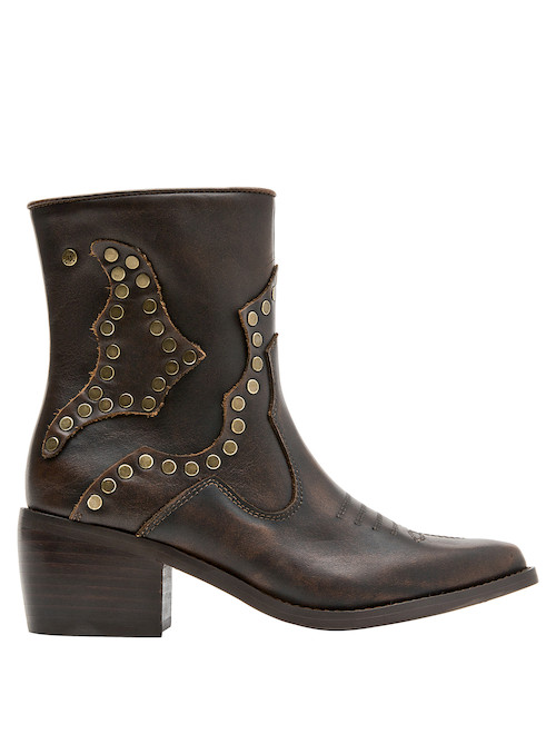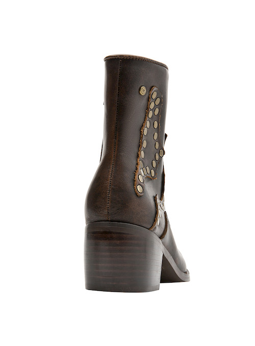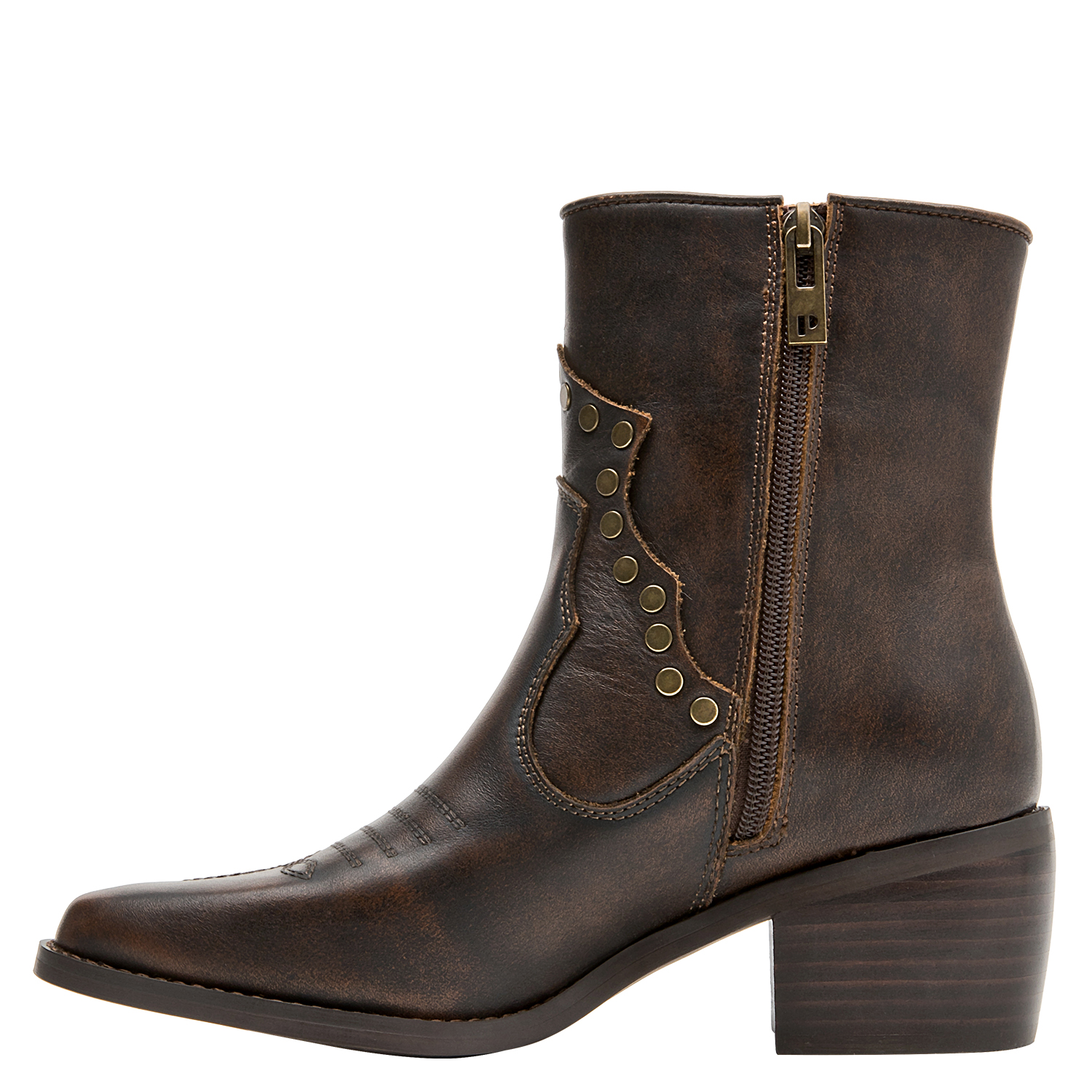 Siente la fuerza de la moda con nuestros sofisticados botines de cuero en un elegante color moro. Su diseño con punta puntiaguda y un tacón de bloque de 6 cm aportan un toque moderno y seguro a tu andar. Los detalles de metal que adornan el contorno realzan su estilo vanguardista, mientras que la textura suave del cuero asegura una experiencia de confort excepcional. Combinan a la perfección con jeans ajustados o un vestido fluido, ideales para cualquier ocasión que exija presencia y atractivo.