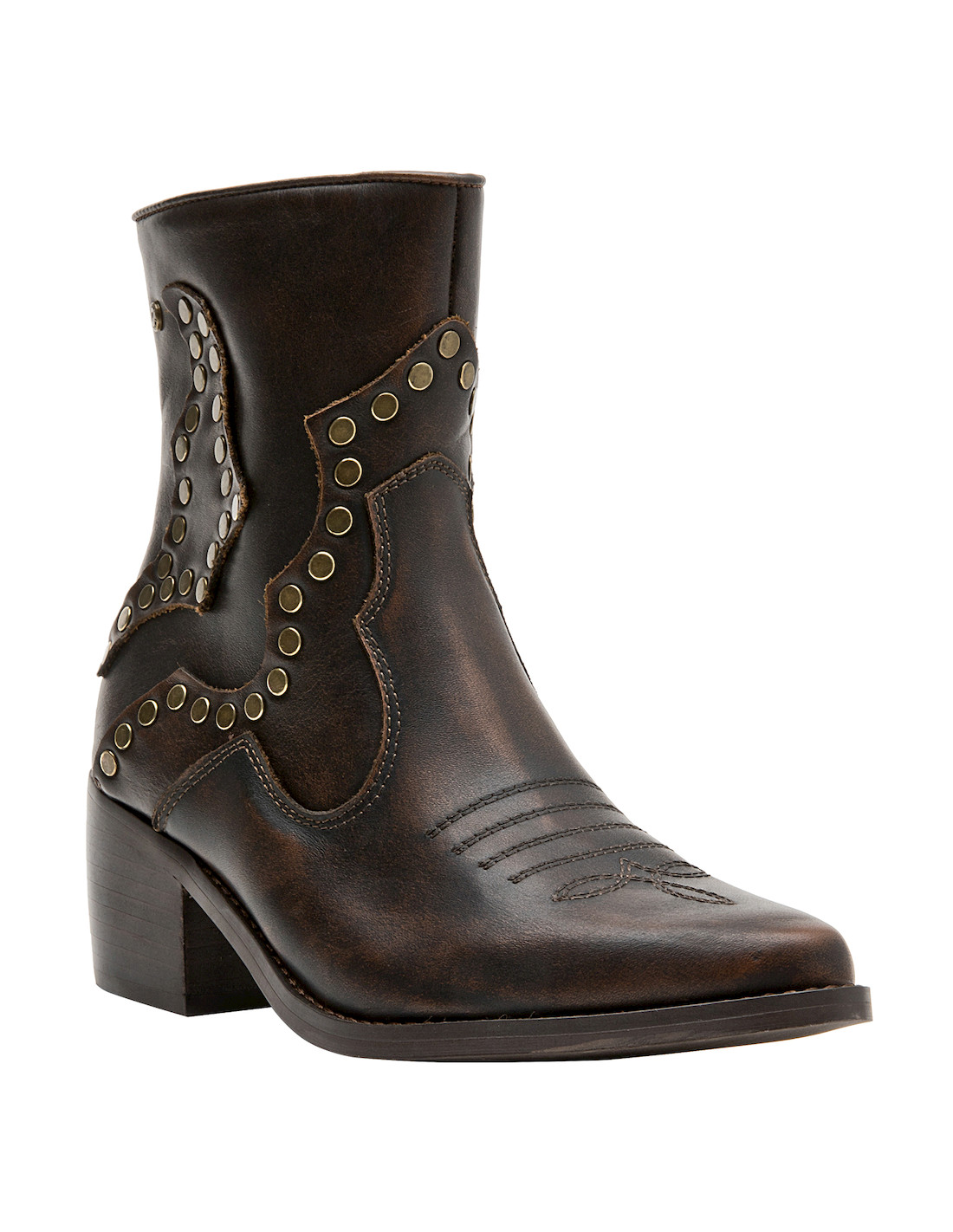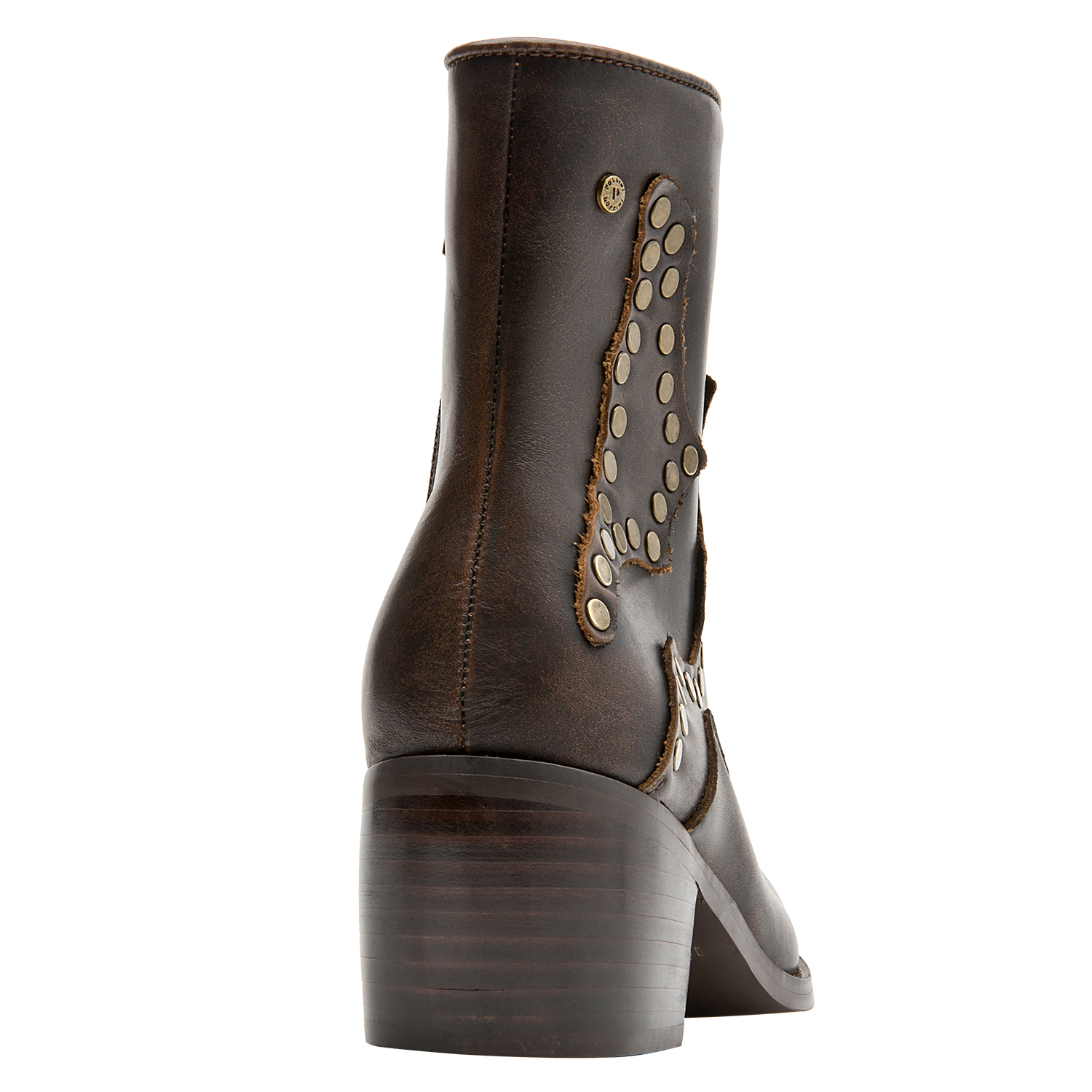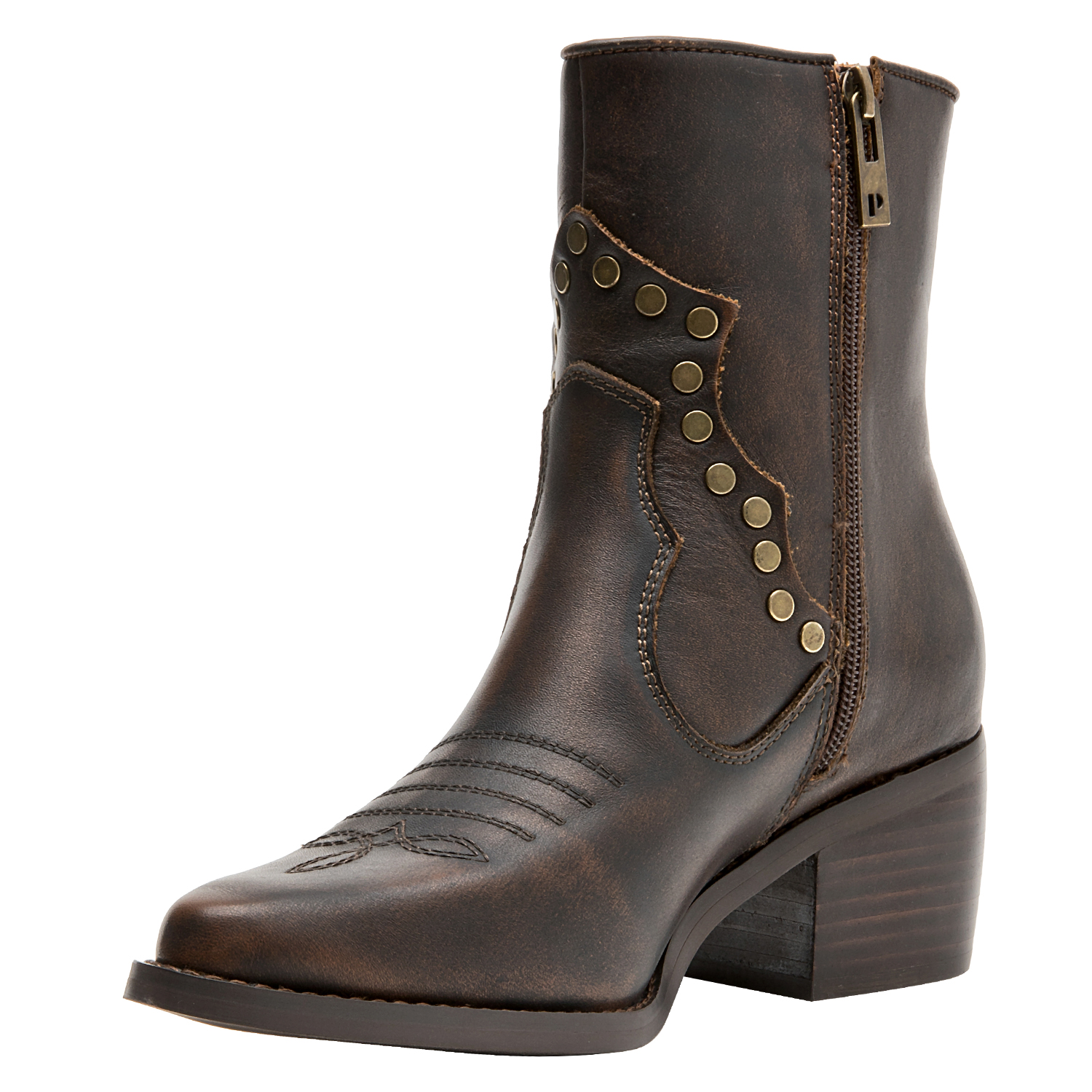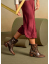 Siente la fuerza de la moda con nuestros sofisticados botines de cuero en un elegante color moro. Su diseño con punta puntiaguda y un tacón de bloque de 6 cm aportan un toque moderno y seguro a tu andar. Los detalles de metal que adornan el contorno realzan su estilo vanguardista, mientras que la textura suave del cuero asegura una experiencia de confort excepcional. Combinan a la perfección con jeans ajustados o un vestido fluido, ideales para cualquier ocasión que exija presencia y atractivo.