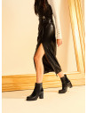 Redefine tu estilo con estos sofisticados botines de cuero negro, diseñados para la mujer moderna. Con un taco bloque de 7.5 cm y una punta cuadrada, ofrecen altura y comodidad sin sacrificar tu elegancia. La textura del cuero, combinada con un detalle de acabado en piel de serpiente, añade un toque de distinción que resalta tu feminidad. Combínalos con un vestido midi y una chaqueta de cuero para un look urbano o con jeans ajustados y una blusa ligera para un día de oficina. ¡Sé la reina de la moda en cada paso!