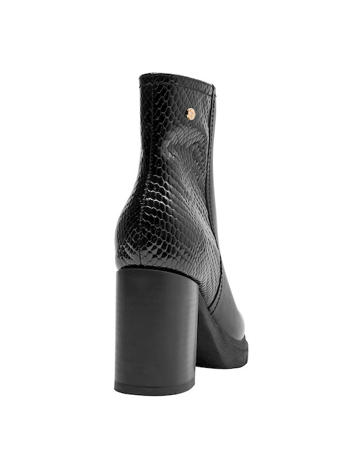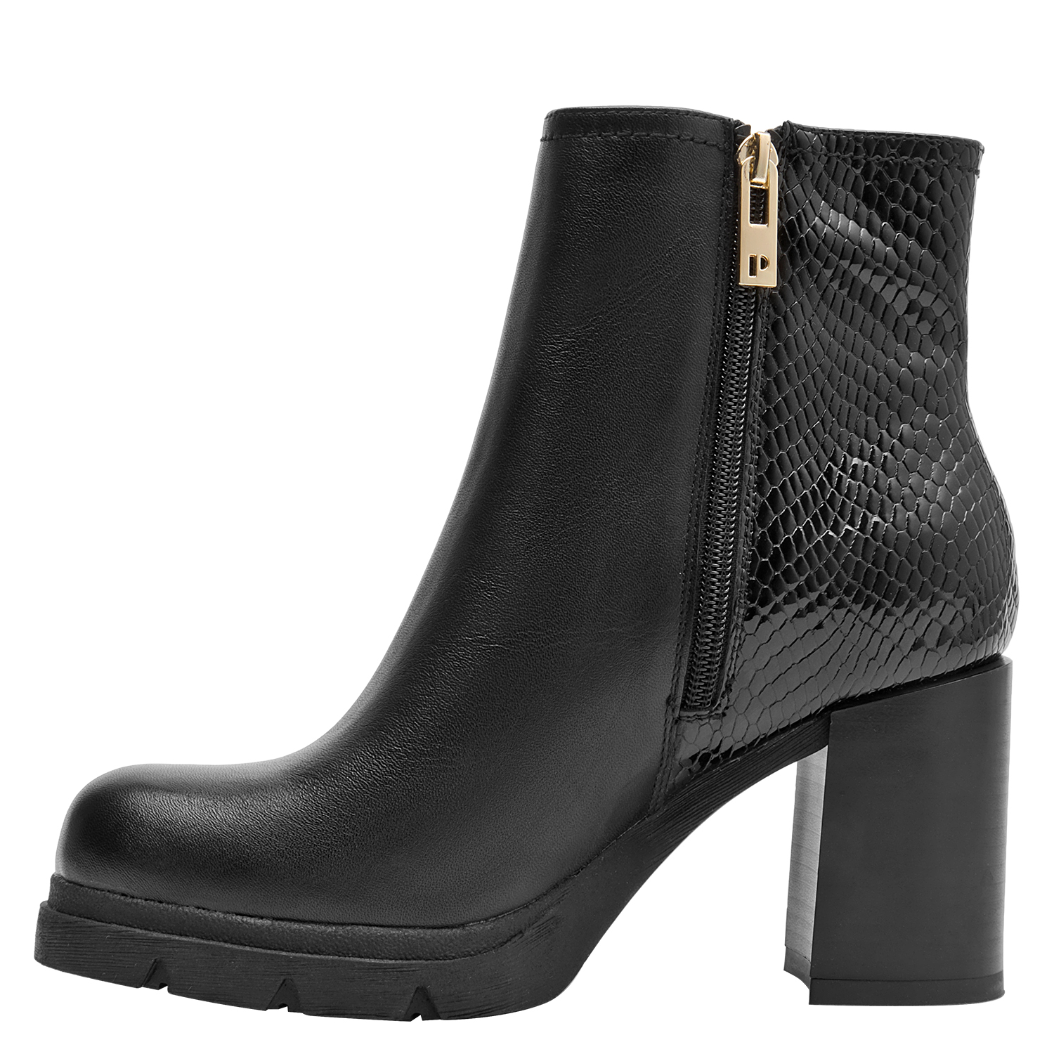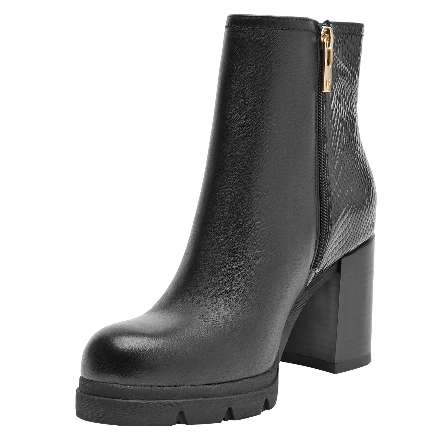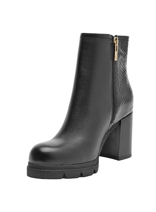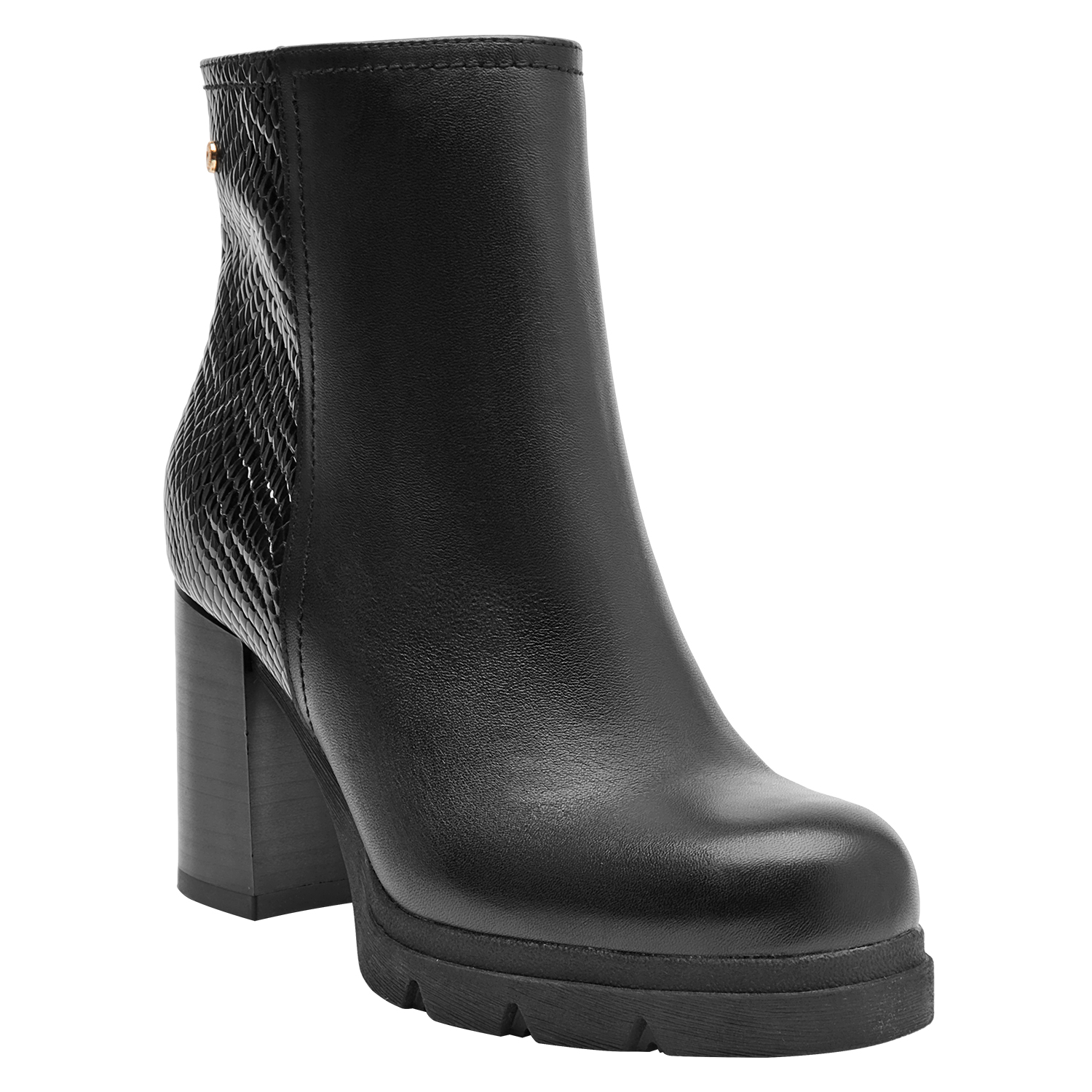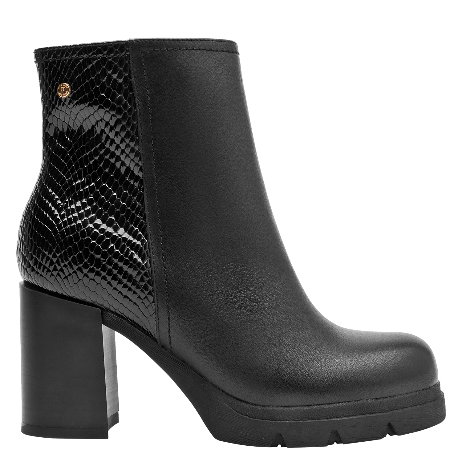 Redefine tu estilo con estos sofisticados botines de cuero negro, diseñados para la mujer moderna. Con un taco bloque de 7.5 cm y una punta cuadrada, ofrecen altura y comodidad sin sacrificar tu elegancia. La textura del cuero, combinada con un detalle de acabado en piel de serpiente, añade un toque de distinción que resalta tu feminidad. Combínalos con un vestido midi y una chaqueta de cuero para un look urbano o con jeans ajustados y una blusa ligera para un día de oficina. ¡Sé la reina de la moda en cada paso!