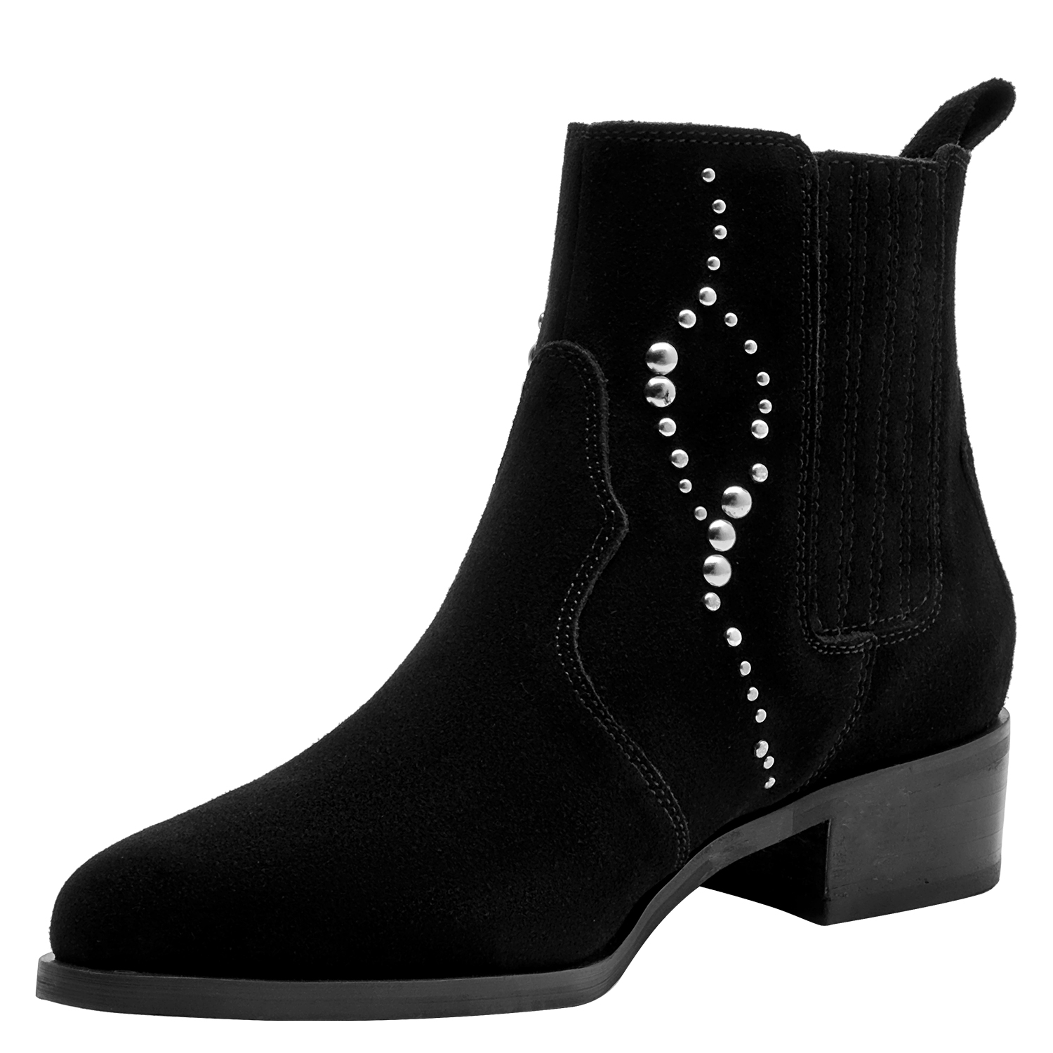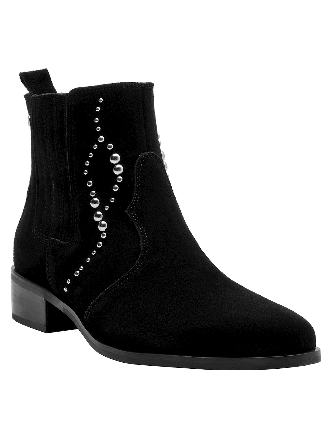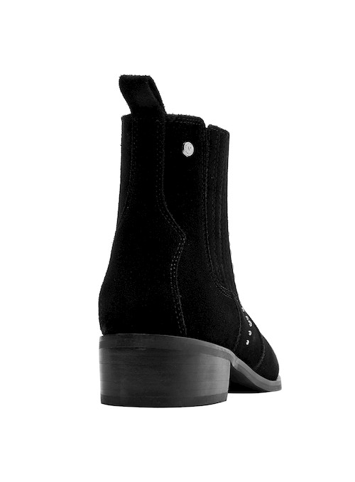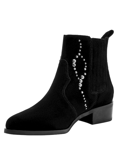 Dale un toque vanguardista a tu look con estos elegantes botines negros. Elaborados en suave cuero de gamuza, su diseño resalta por los detalles de strass que aportan un brillo sutil y sofisticado. Con un tacón de bloque de 4 cm y una punta puntiaguda, son versátiles para transitar desde el día a la noche. Combínalos con un vestido fluido para un estilo chic o con jeans ajustados y una blusa elegante para un toque moderno en tu día a día.