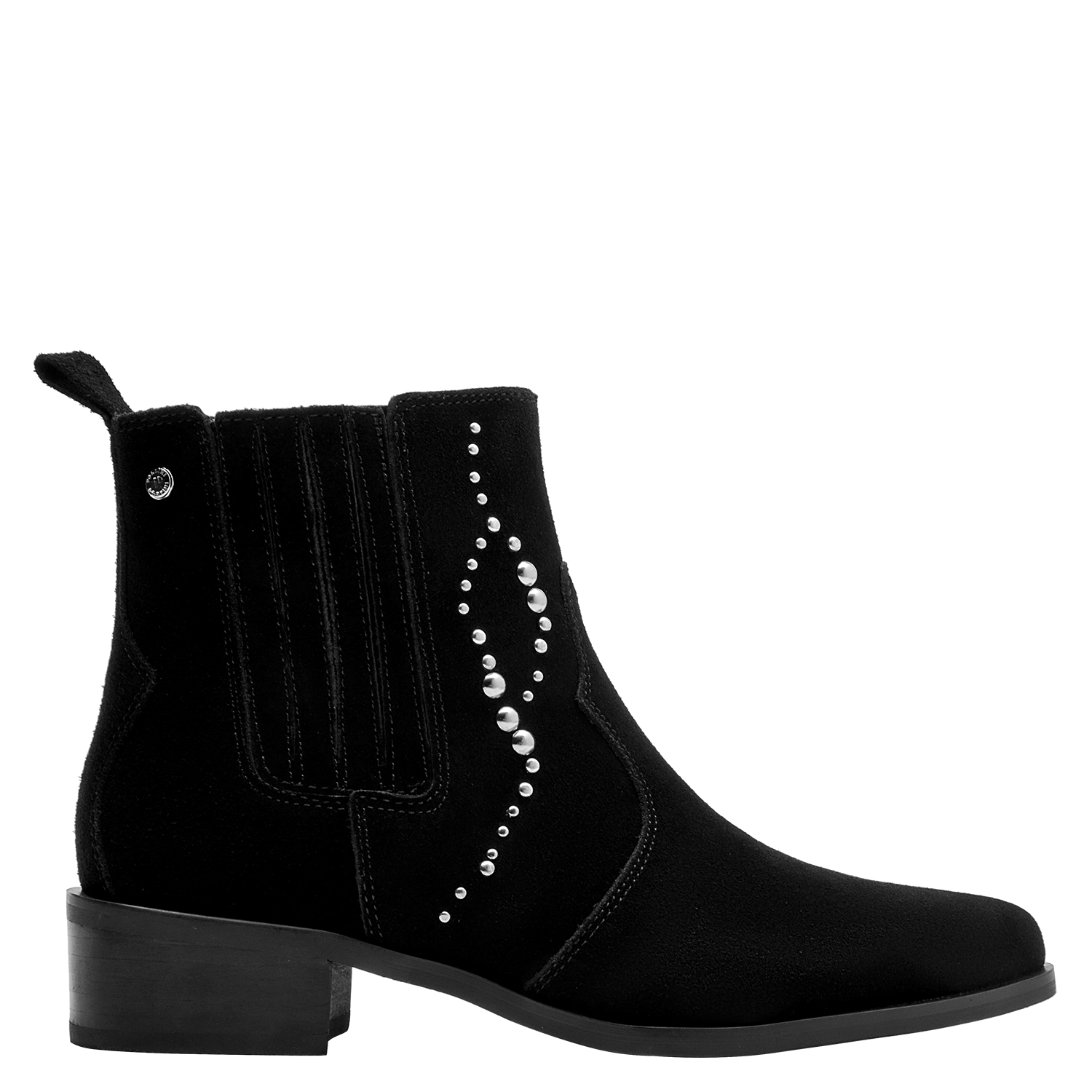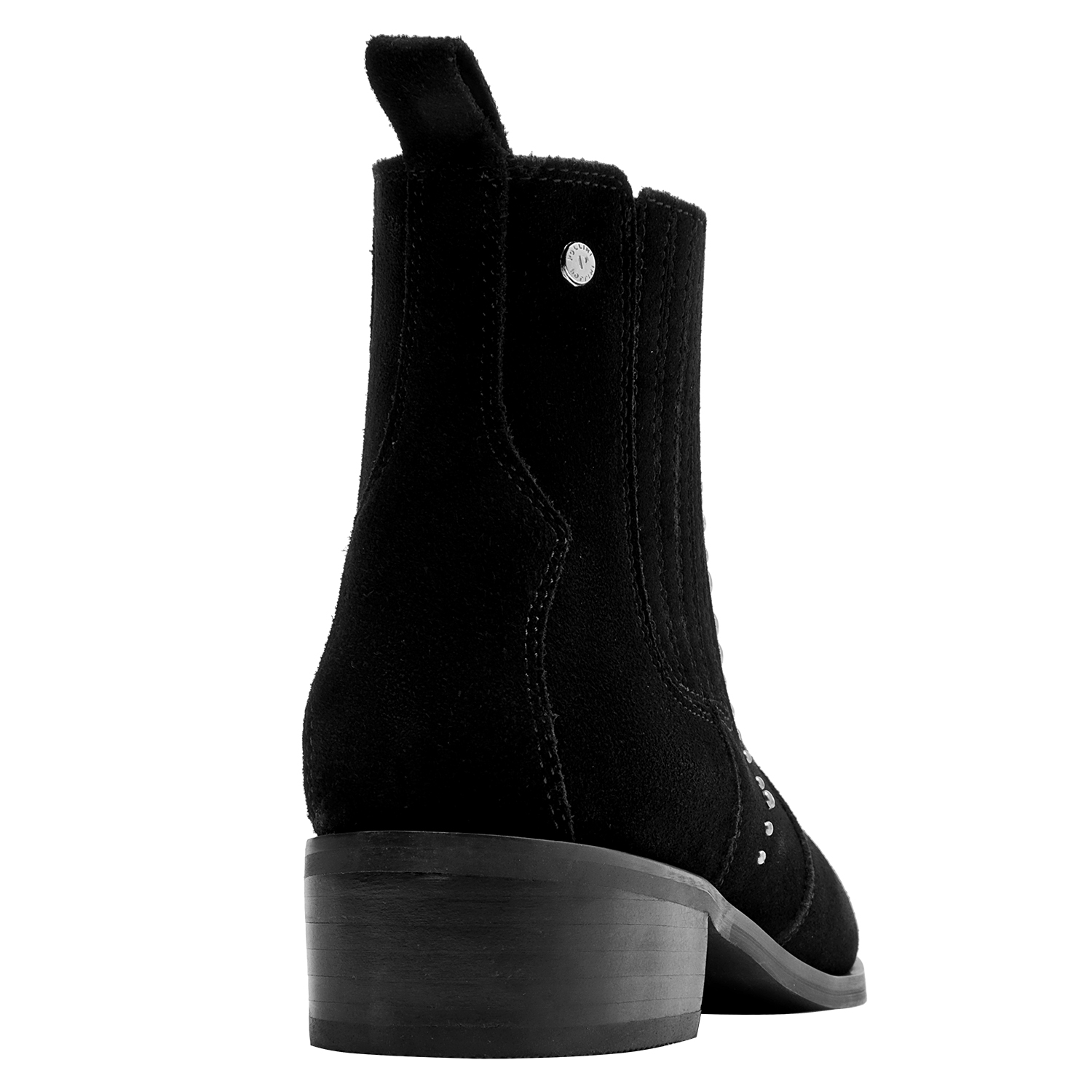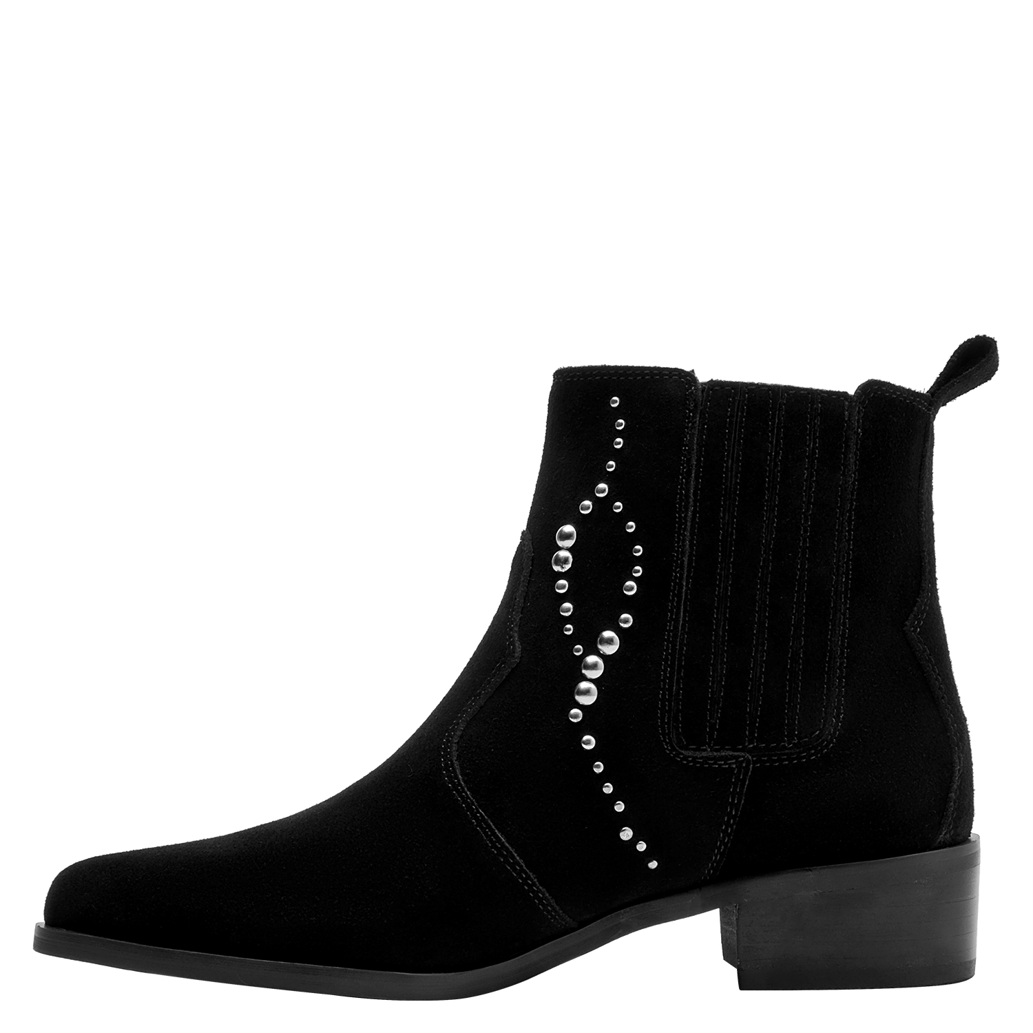 Dale un toque vanguardista a tu look con estos elegantes botines negros. Elaborados en suave cuero de gamuza, su diseño resalta por los detalles de strass que aportan un brillo sutil y sofisticado. Con un tacón de bloque de 4 cm y una punta puntiaguda, son versátiles para transitar desde el día a la noche. Combínalos con un vestido fluido para un estilo chic o con jeans ajustados y una blusa elegante para un toque moderno en tu día a día.