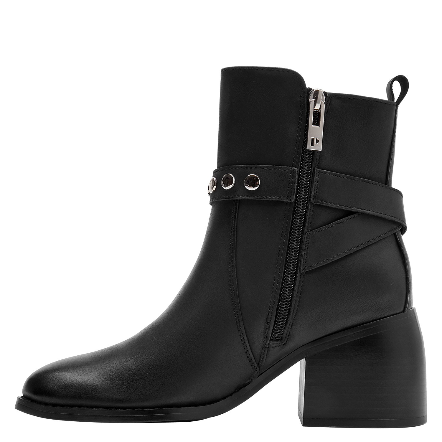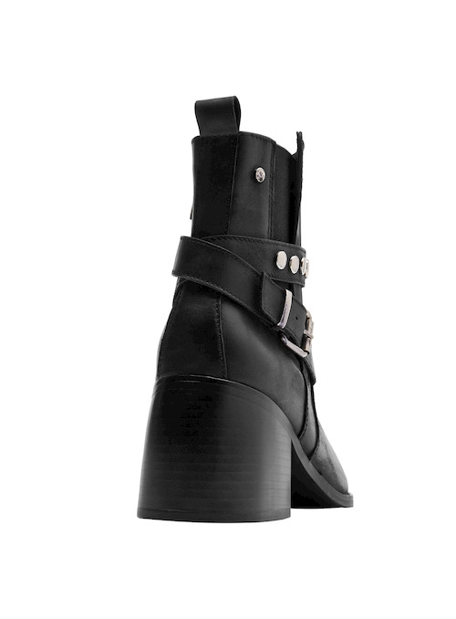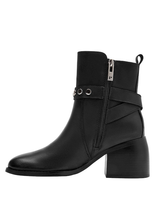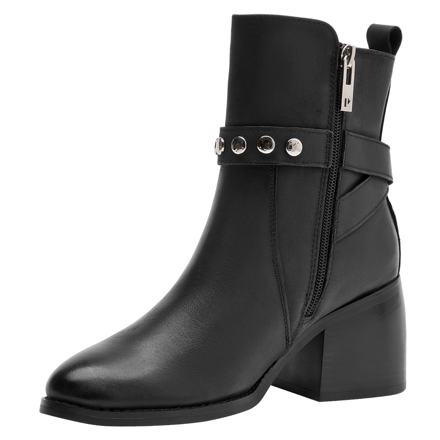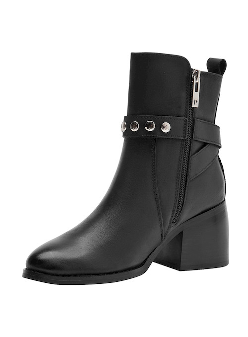Eleva tu estilo con estos sofisticados botines negros de cuero, diseñados para la mujer actual que busca ser la reina de la moda. Con una punta puntiaguda y un taco bloque de 7 cm, ofrecen una silueta estilizada y cómoda. La correa decorativa con detalles metálicos añade un toque vanguardista, perfectos para un look audaz y urbano. Combínalos con un vestido corto para un evento especial o con jeans ajustados para un día casual en la ciudad. ¡Atrévete a brillar!