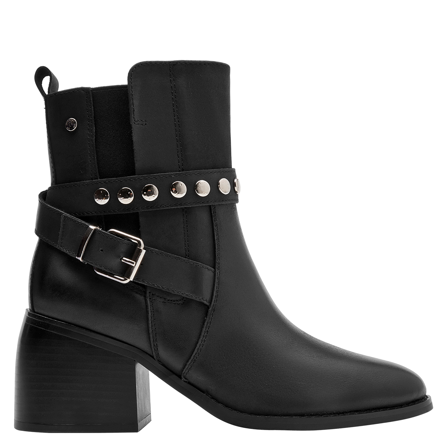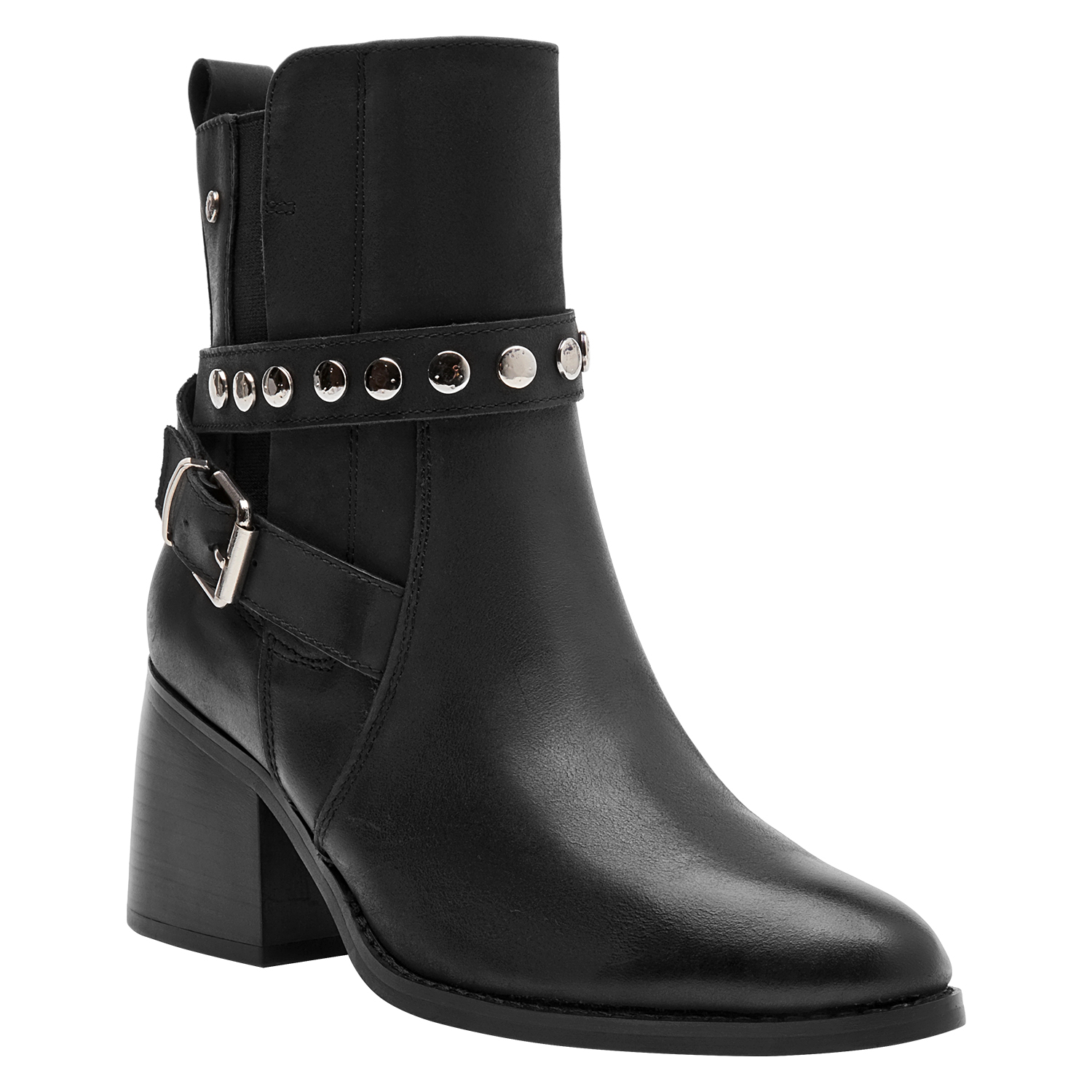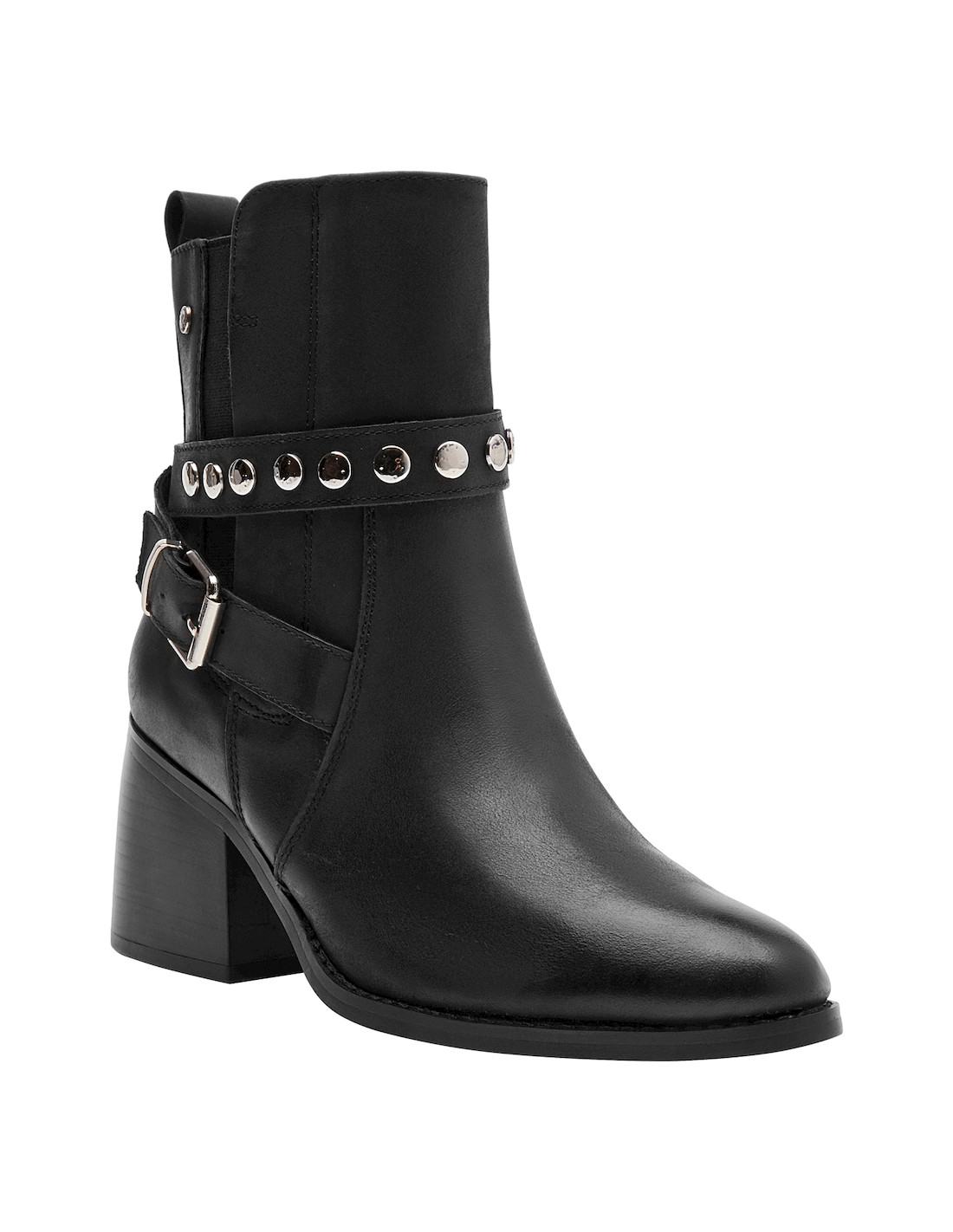Eleva tu estilo con estos sofisticados botines negros de cuero, diseñados para la mujer actual que busca ser la reina de la moda. Con una punta puntiaguda y un taco bloque de 7 cm, ofrecen una silueta estilizada y cómoda. La correa decorativa con detalles metálicos añade un toque vanguardista, perfectos para un look audaz y urbano. Combínalos con un vestido corto para un evento especial o con jeans ajustados para un día casual en la ciudad. ¡Atrévete a brillar!