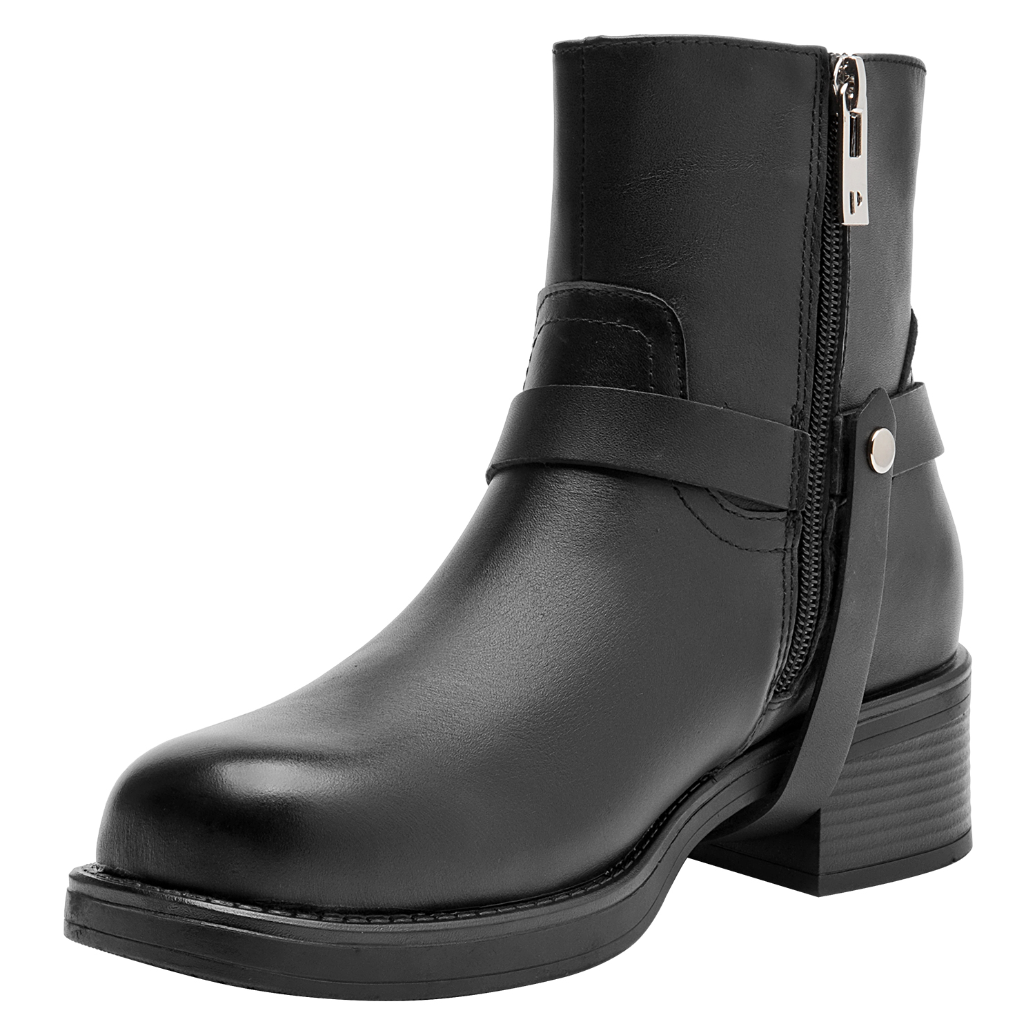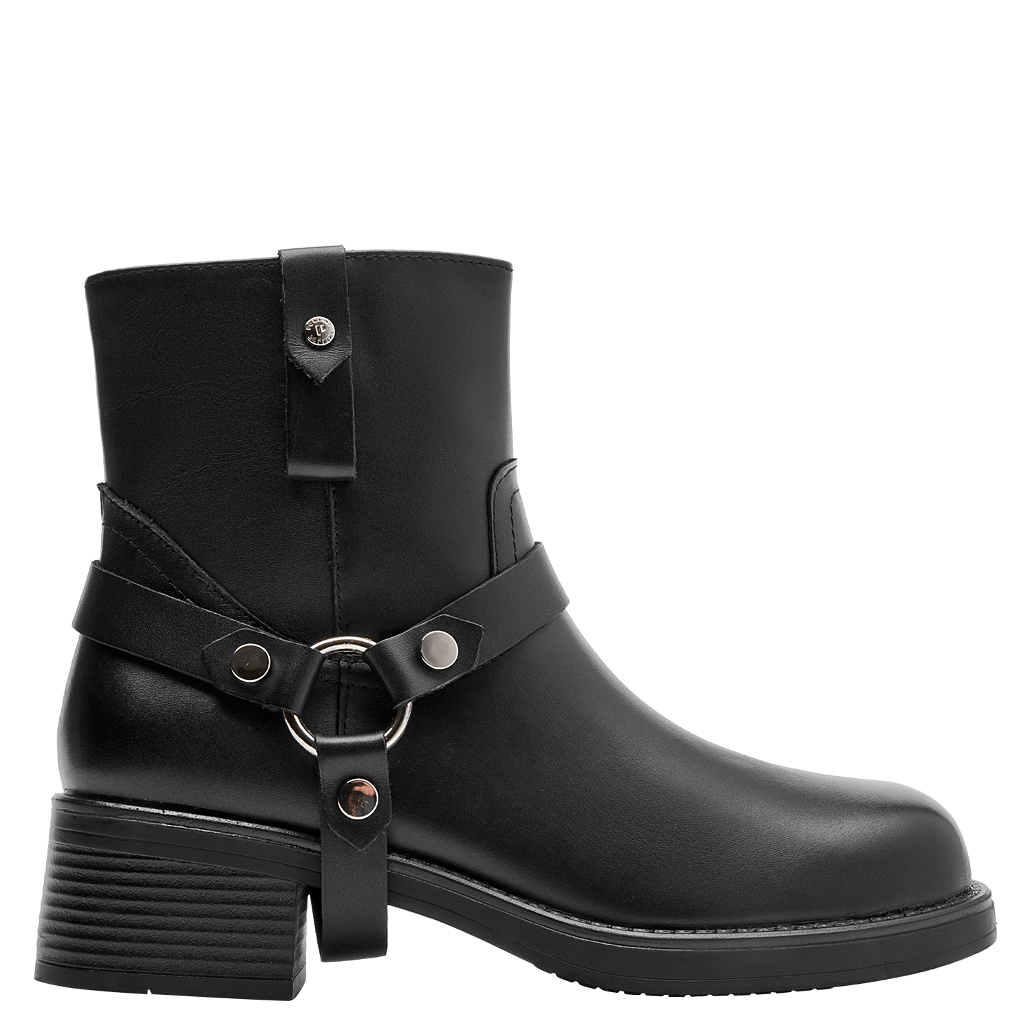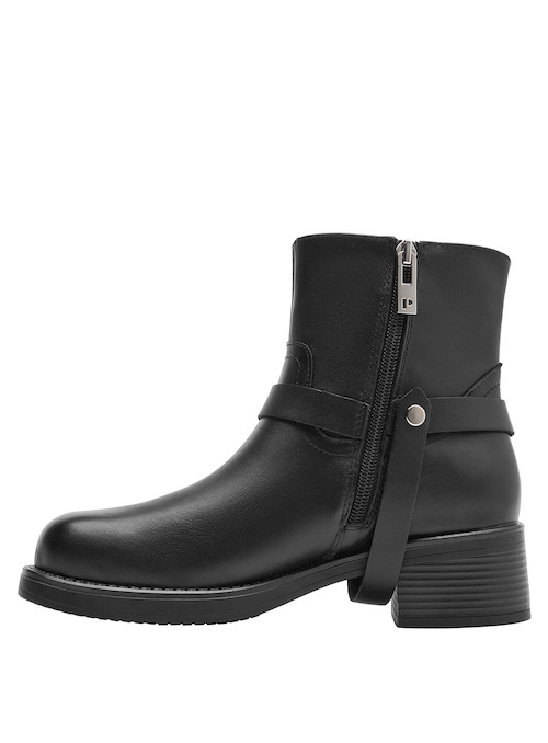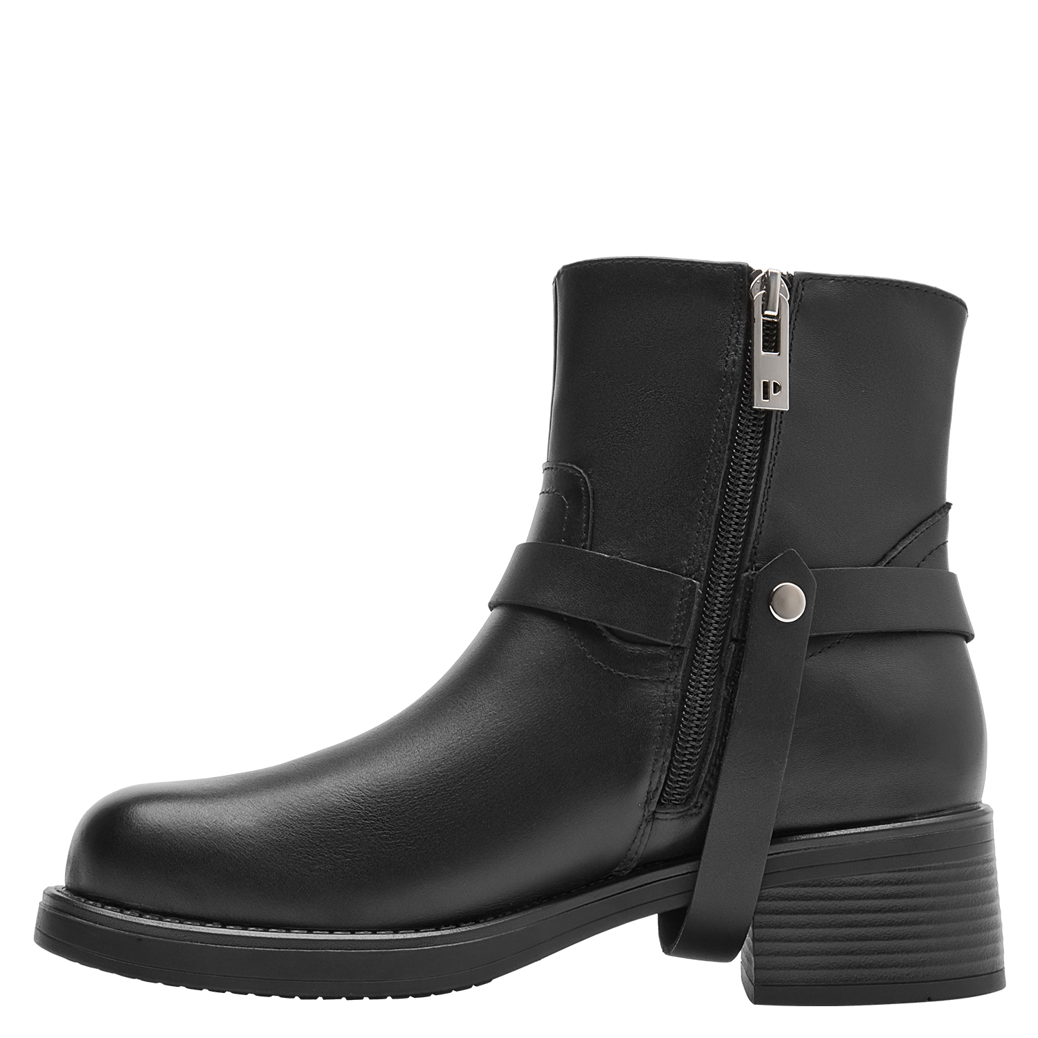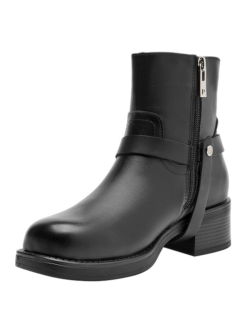 Los botines de cuero negro de Pollini son la elección perfecta para la mujer actual. Con su diseño de punta cuadrada y taco bloque de 5 cm, aportan un estilo vanguardista y sofisticado. El acabado mate resalta la calidad del material, mientras que la correa decorativa añade un toque de personalidad. Estos botines son versátiles, ideales para combinar con un vestido fluido o unos jeans ajustados, garantizando que cada paso te haga sentir segura y atractiva.