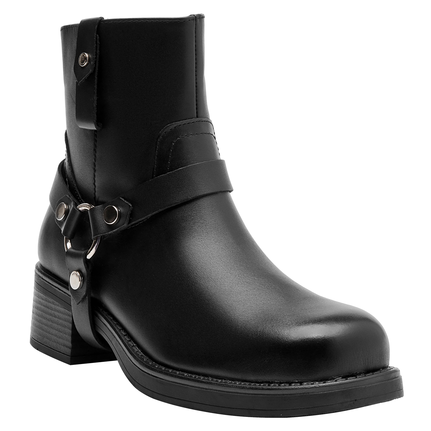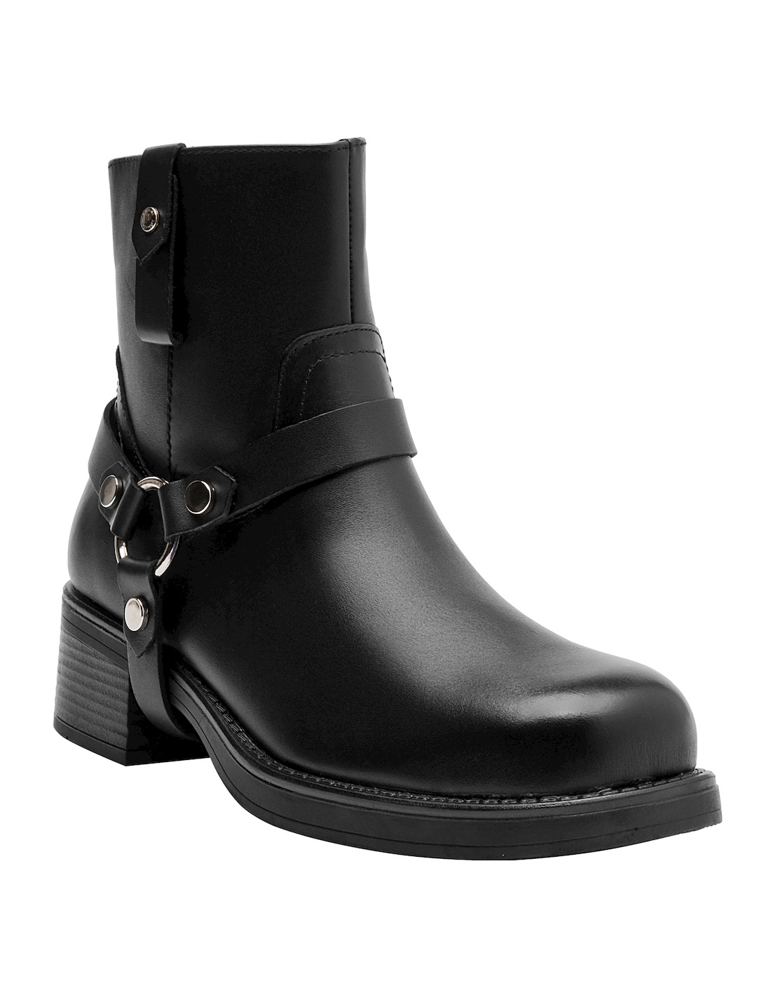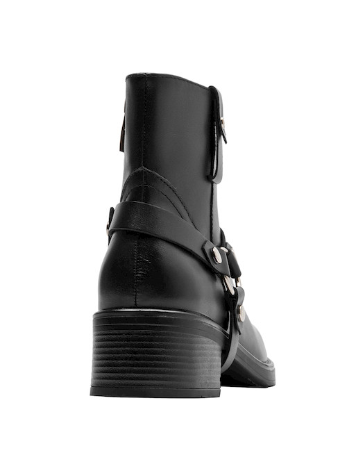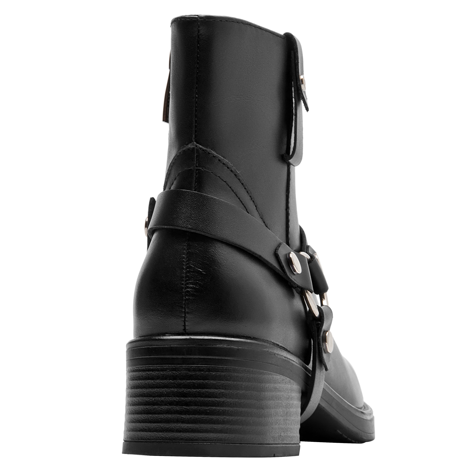 Los botines de cuero negro de Pollini son la elección perfecta para la mujer actual. Con su diseño de punta cuadrada y taco bloque de 5 cm, aportan un estilo vanguardista y sofisticado. El acabado mate resalta la calidad del material, mientras que la correa decorativa añade un toque de personalidad. Estos botines son versátiles, ideales para combinar con un vestido fluido o unos jeans ajustados, garantizando que cada paso te haga sentir segura y atractiva.