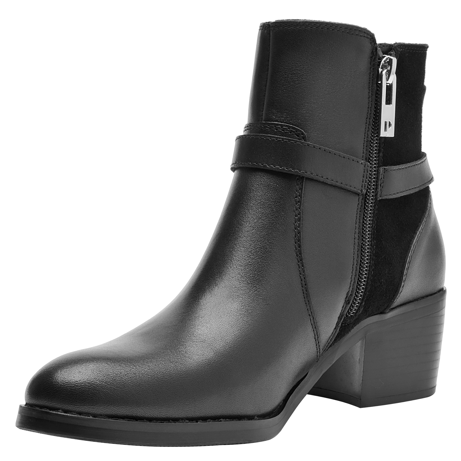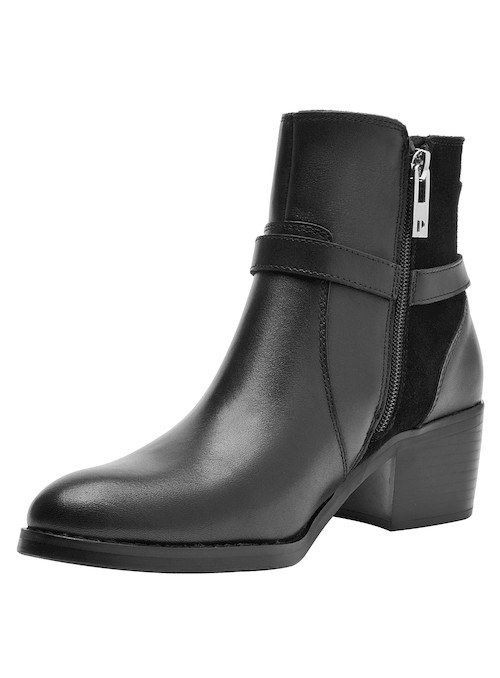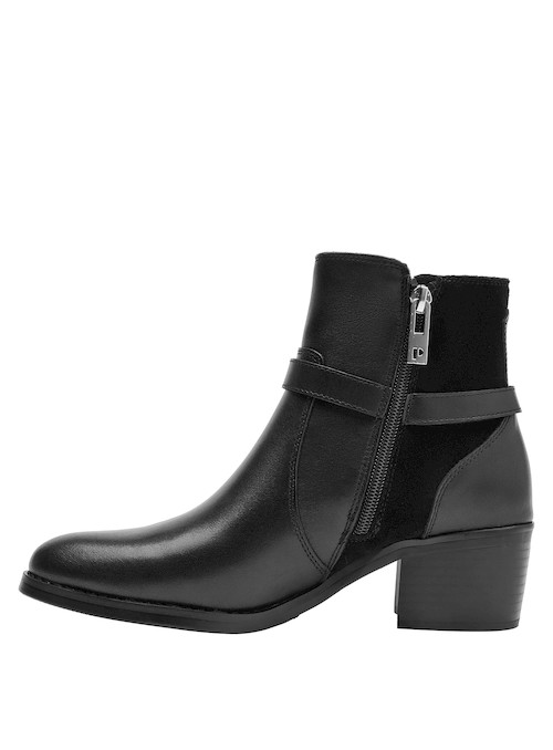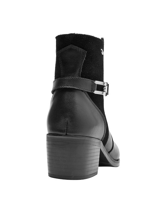 Estos botines negros de Pollini son la definición de versatilidad y estilo. Elaborados en cuero de alta calidad, su acabado suave y brillante destaca por la elegancia de su diseño. La altura del taco bloque de 5 cm aporta comodidad sin sacrificar la feminidad, mientras que la punta redonda ofrece un toque moderno. Combínalos con un vestido midi y una chaqueta de cuero para un look atrevido, o con jeans ajustados y una blusa fluida para un día casual chic.