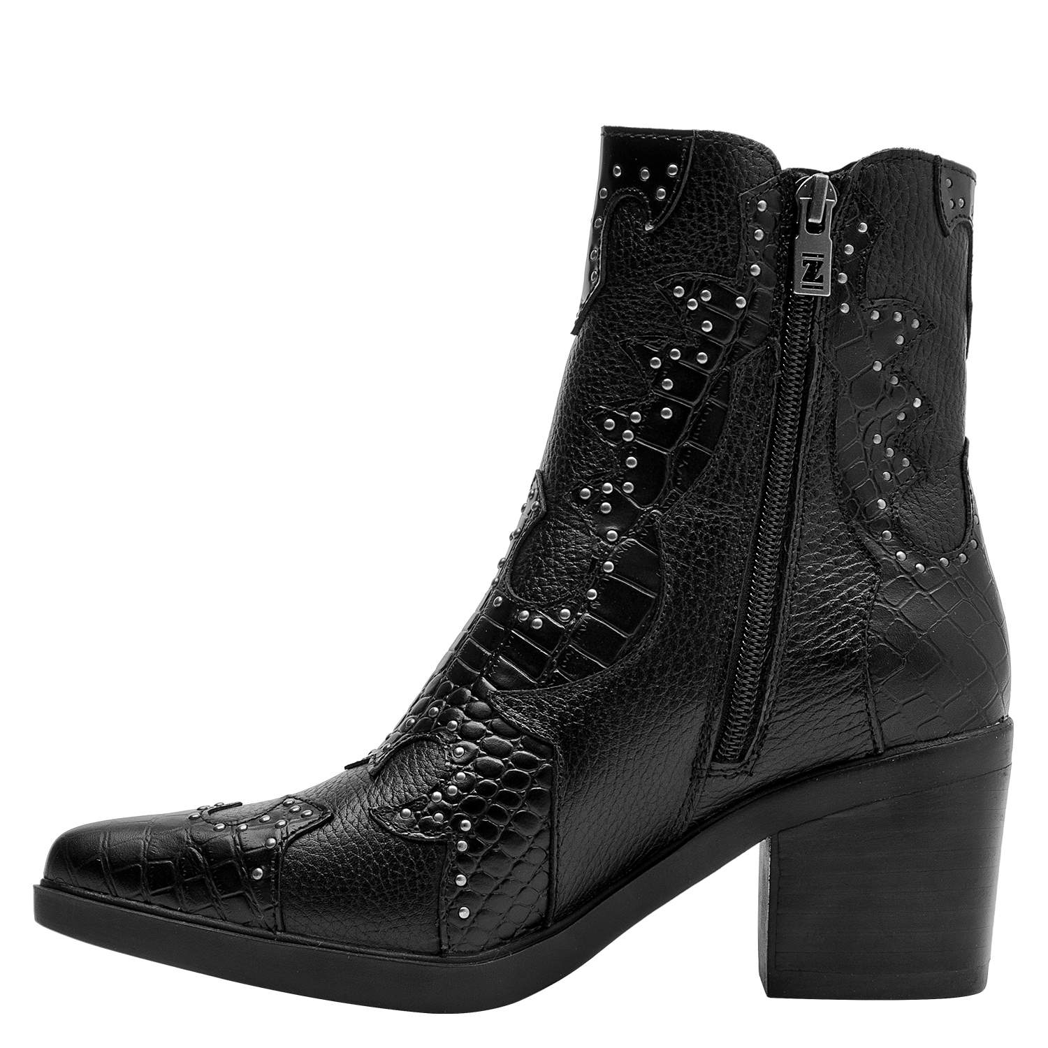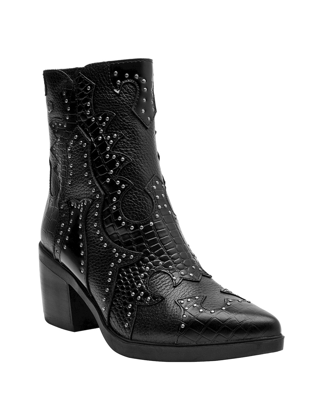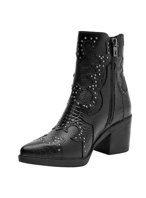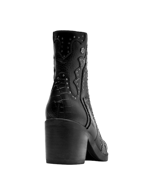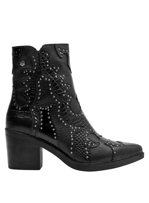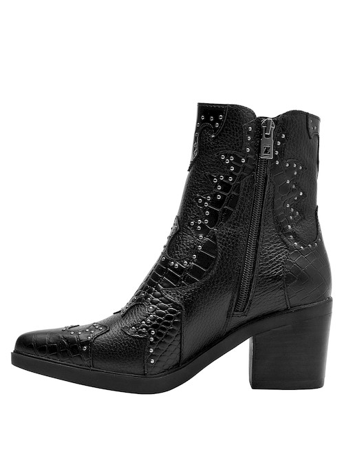 Los botines de cuero negro de Zappa combinan esa actitud vanguardista con un diseño protagónico. Su acabado en textura de cocodrilo y las tachas metálicas aportan un impacto visual impresionante. Con un taco bloque de 7 cm y una punta puntiaguda, son ideales para marcar la diferencia en cada paso. Estos botines se vestirán a la perfección con un vestido ajustado o unos jeans desgastados.