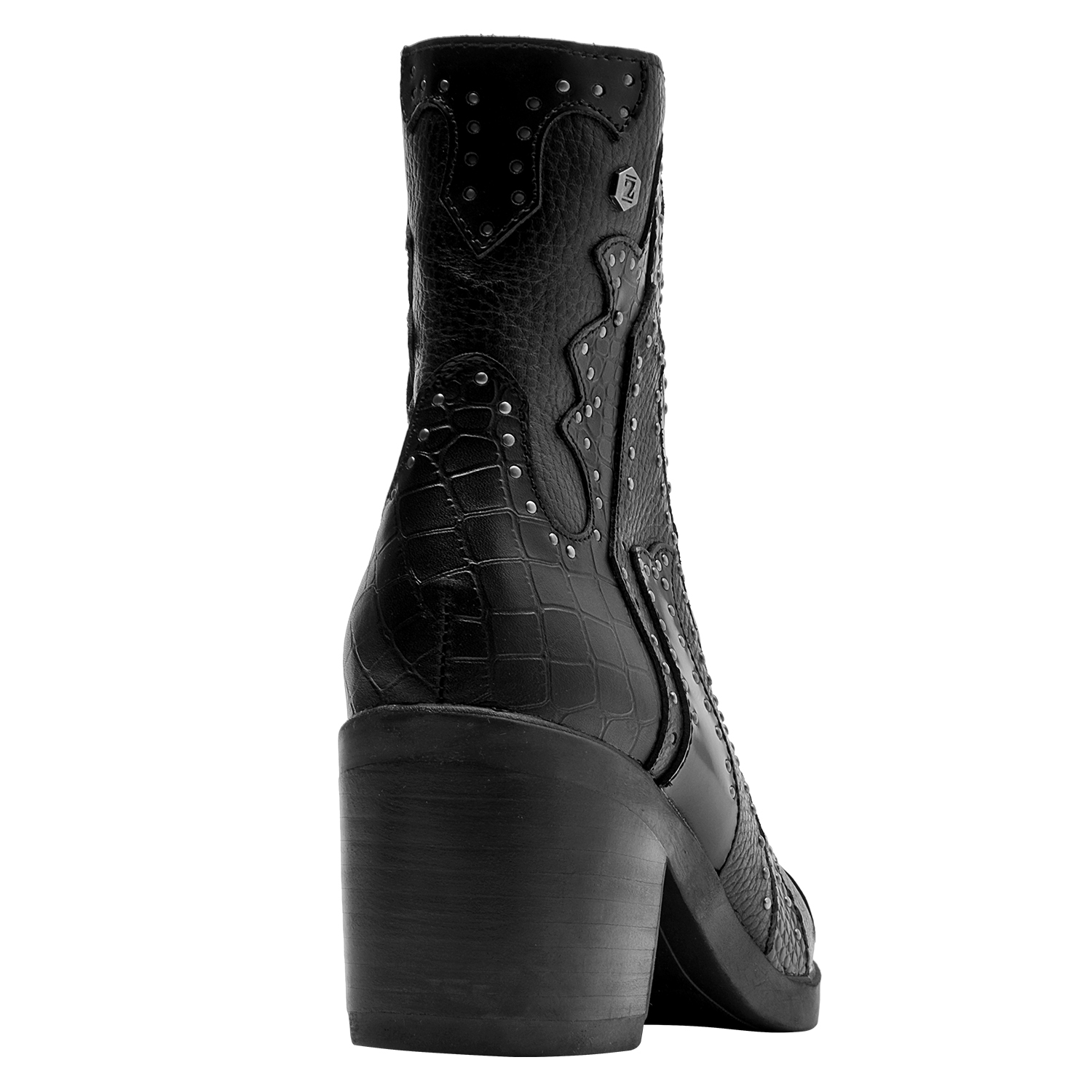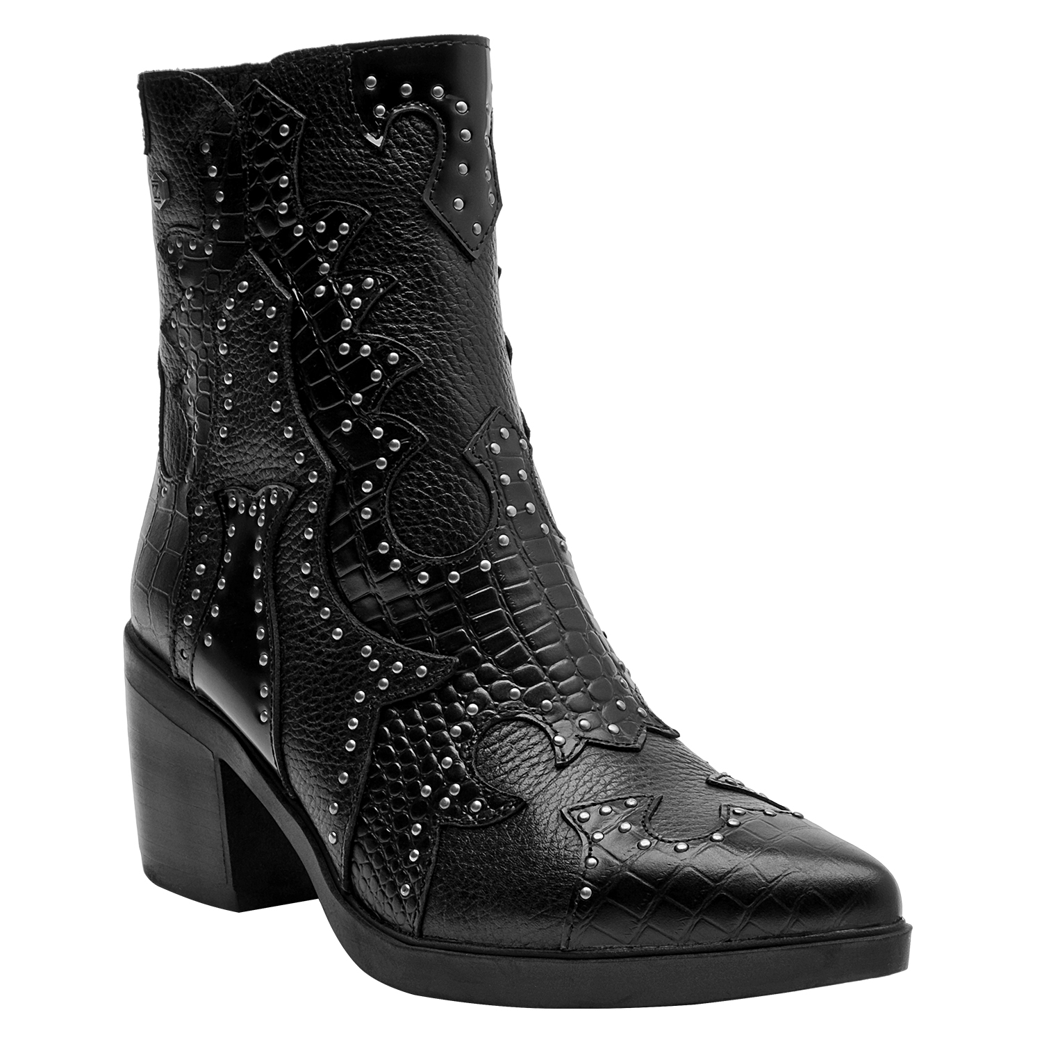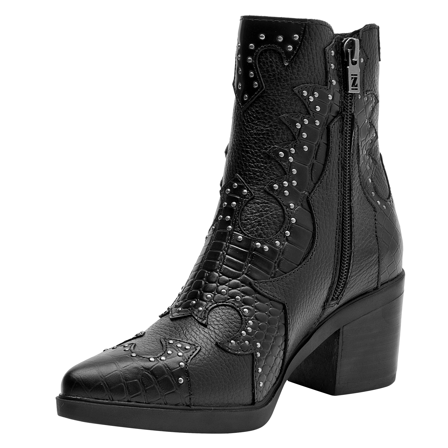Los botines de cuero negro de Zappa combinan esa actitud vanguardista con un diseño protagónico. Su acabado en textura de cocodrilo y las tachas metálicas aportan un impacto visual impresionante. Con un taco bloque de 7 cm y una punta puntiaguda, son ideales para marcar la diferencia en cada paso. Estos botines se vestirán a la perfección con un vestido ajustado o unos jeans desgastados.