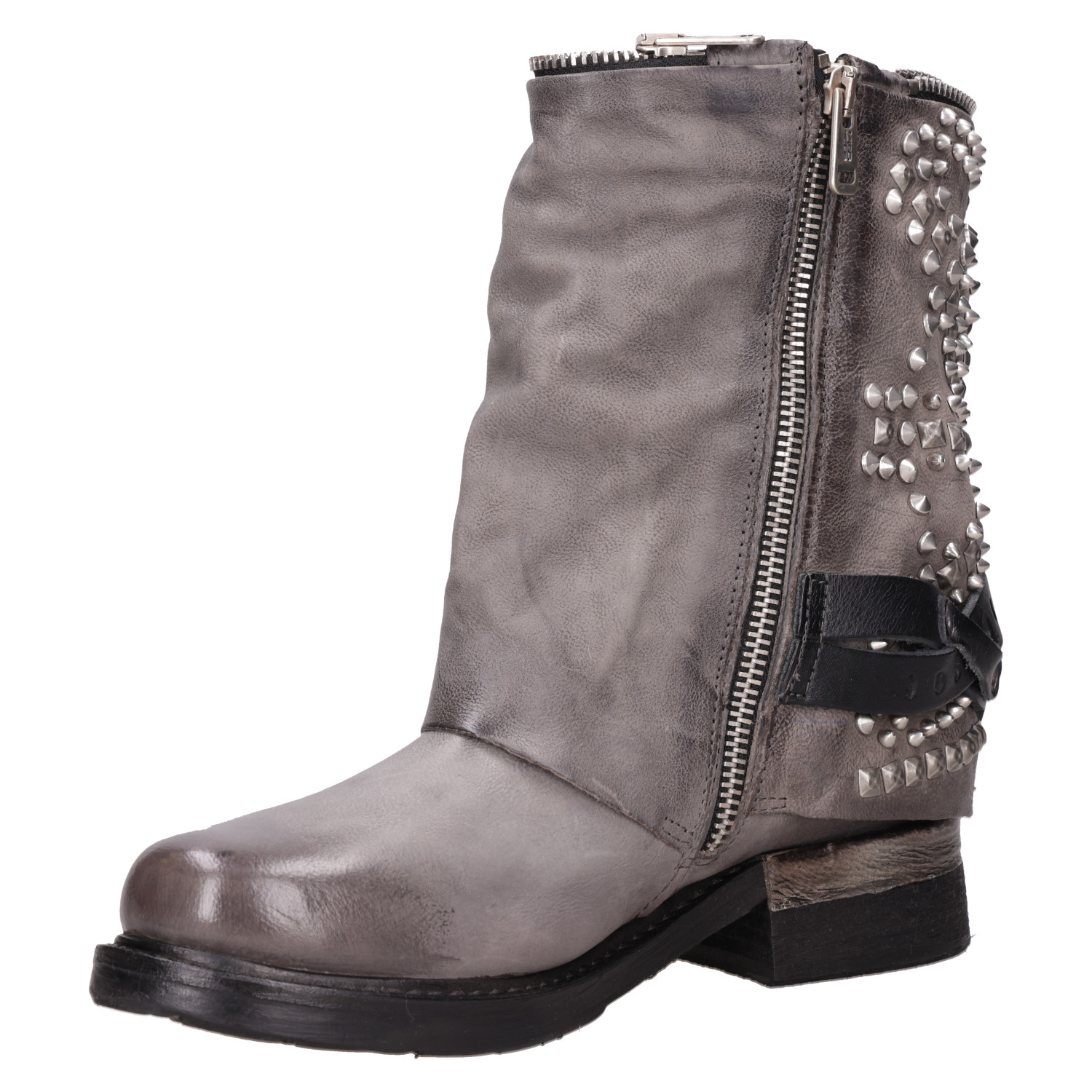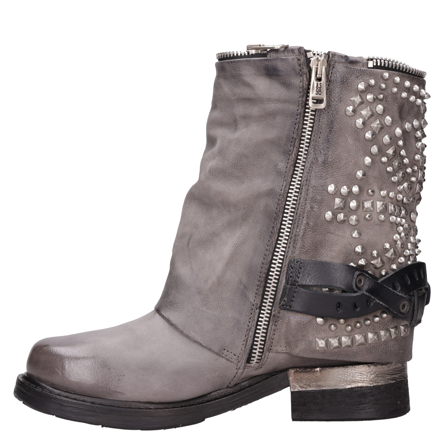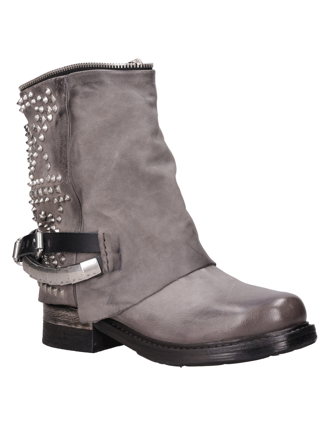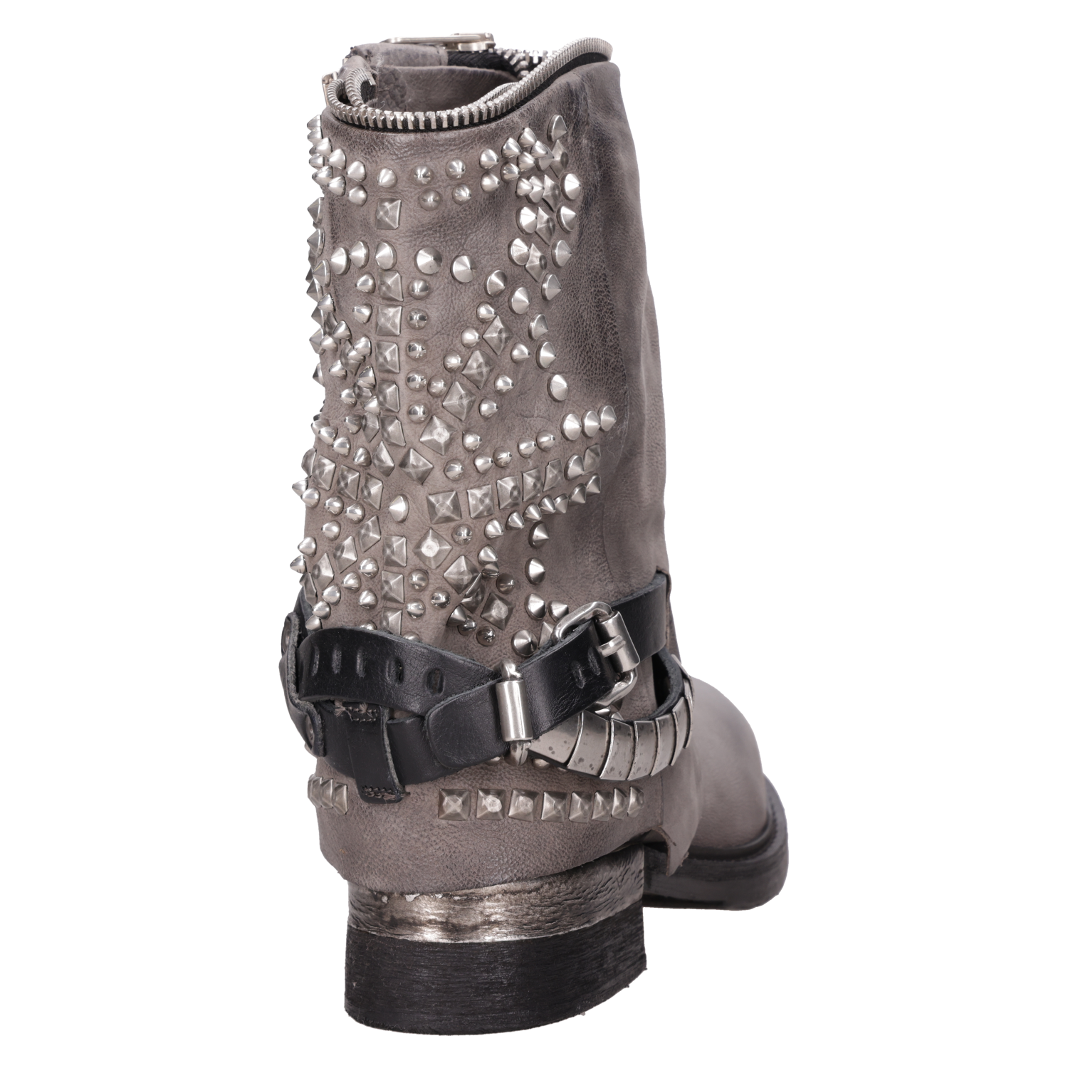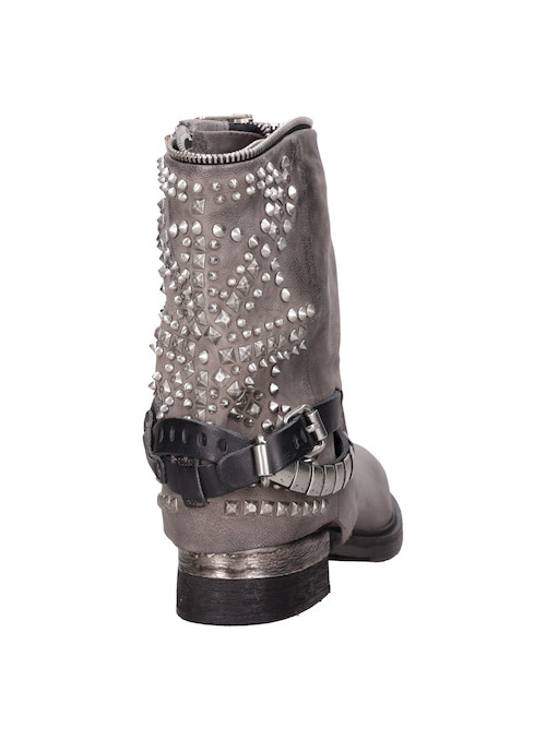 Desata tu espíritu desafiante con el botín mujer AS98 en un audaz gris, confeccionado en suave cuero italiano. Su imponente diseño de punta redonda y taco bloque de 3.5 cm, realzado con detalles metálicos y tachas, promete un look protagonista. La cremallera lateral añade funcionalidad y un toque vanguardista a este modelo contemporáneo, perfecto para quienes buscan marcar tendencias con carácter. Combínalo con un vestido de cuero o unos jeans desgastados para un estilo urbano impactante.