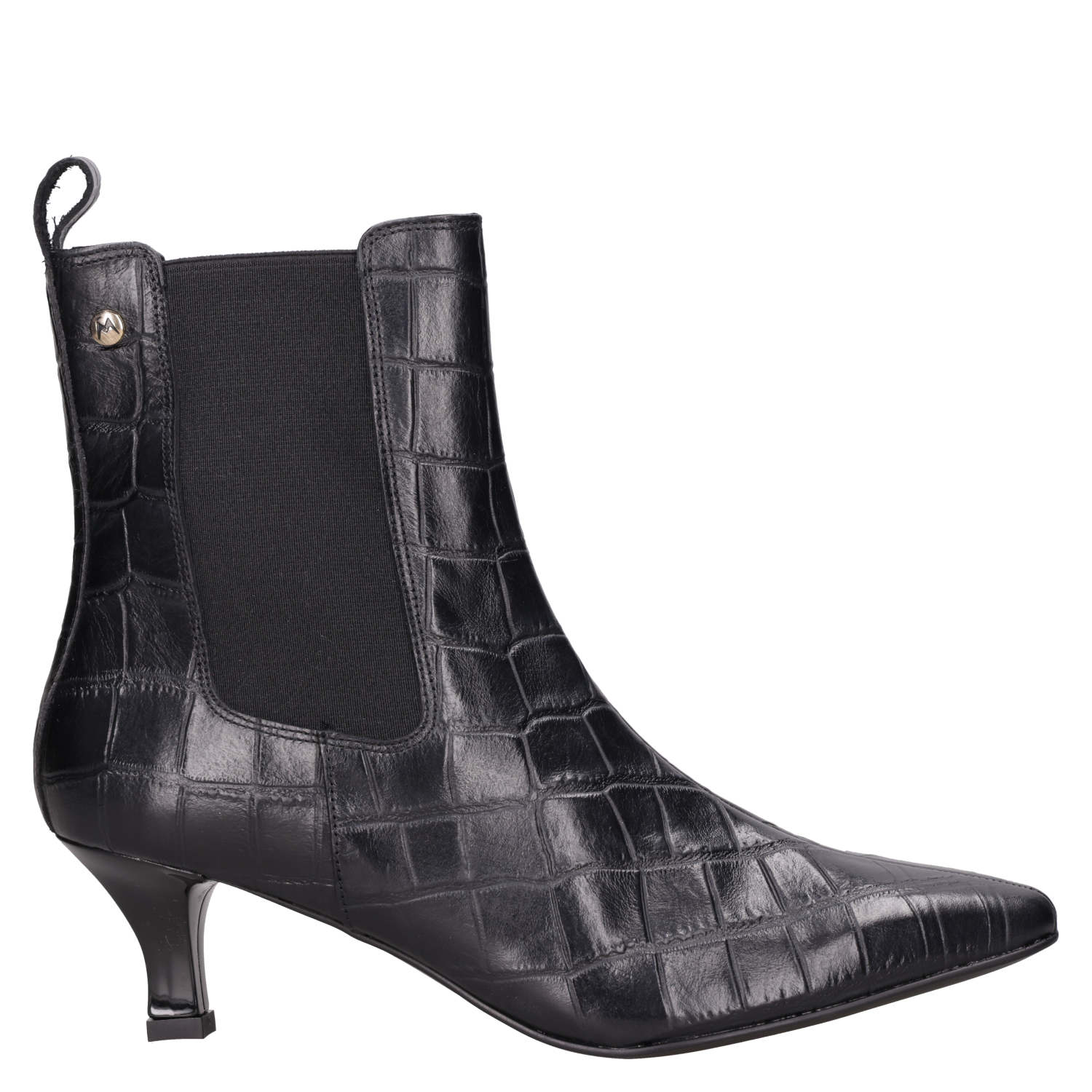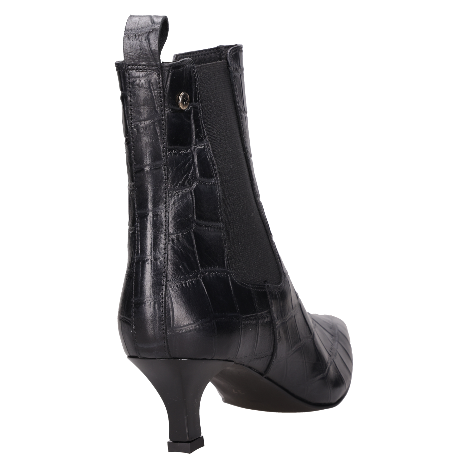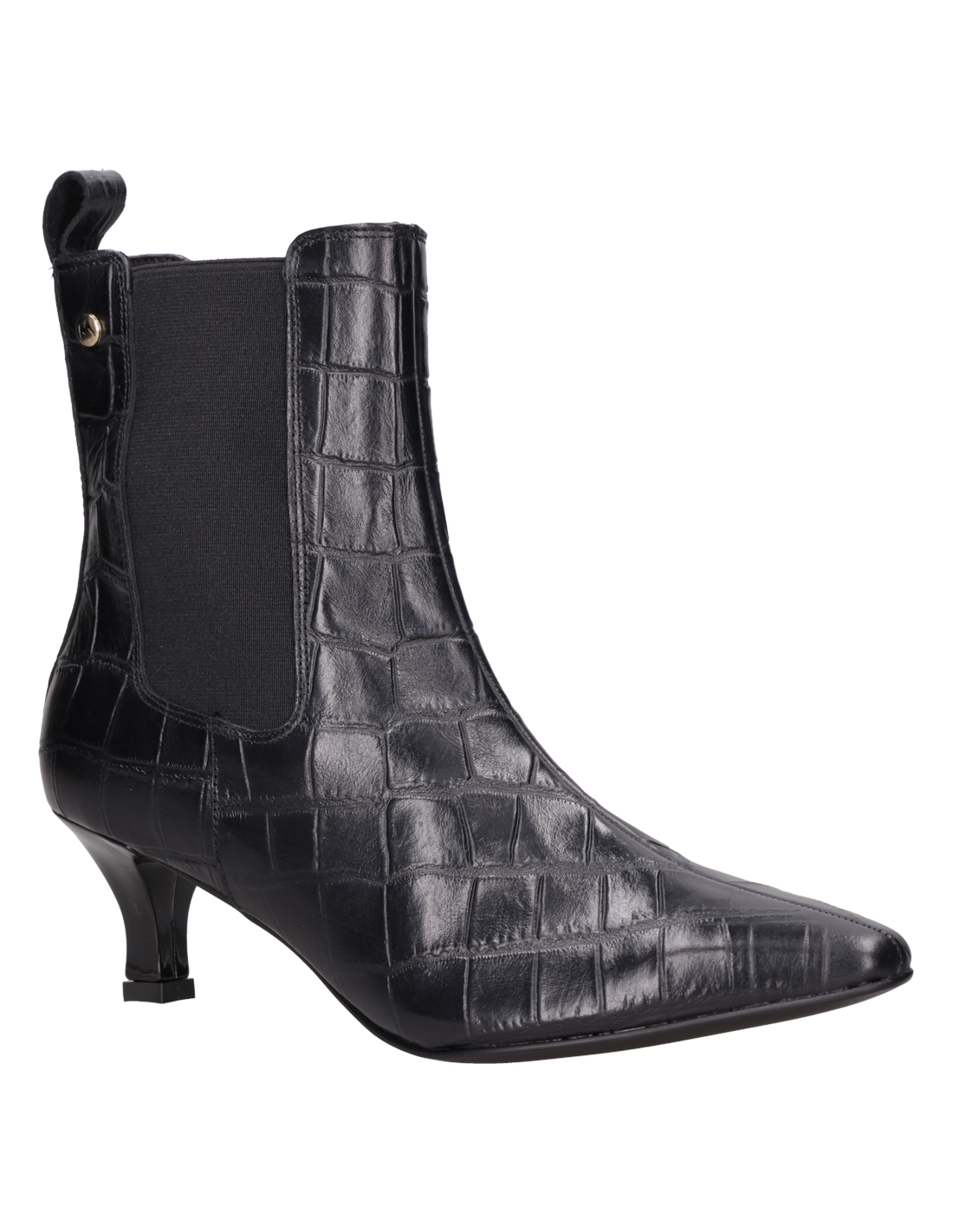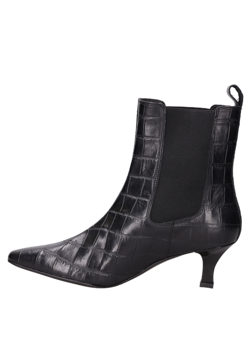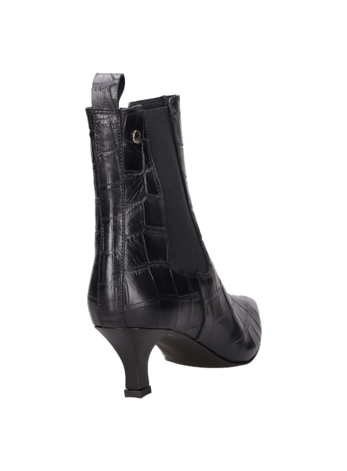 Vista superior del botín negro de cuero, resaltando su diseño fluido y glamour para la mujer contemporánea. Detalle del tirador en el talón del botín negro de cuero, acentuando su elegancia y funcionalidad. "Botín negro tipo Chelsea con punta alargada y tacón ""kitten"", perfecto para un estilo femenino y distintivo. " Vista lateral del botín negro de cuero con panel elástico, diseño sofisticado para un look moderno. Botín negro de cuero grabado efecto piel de cocodrilo, estilo formal para mujer, ideal para ocasiones elegantes.