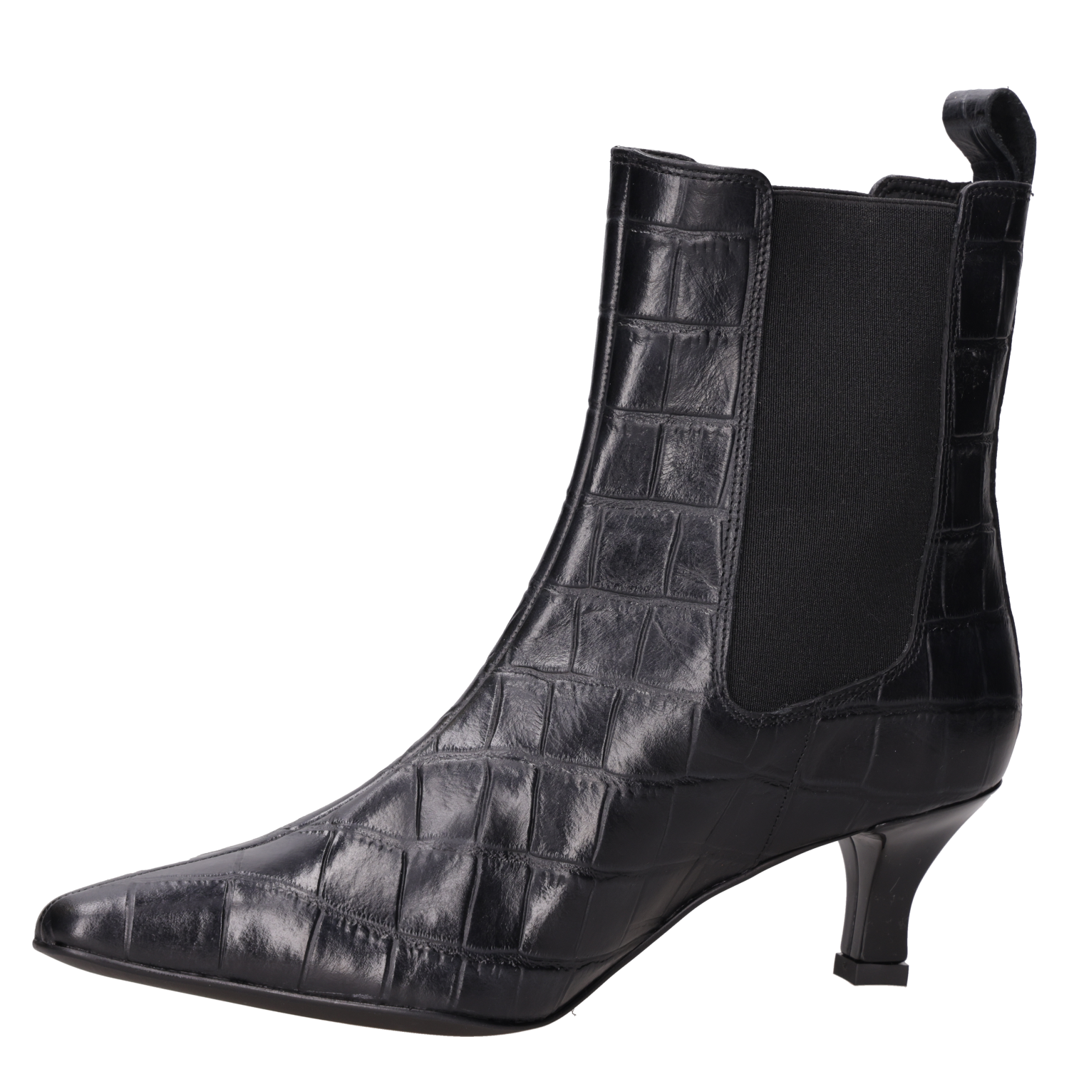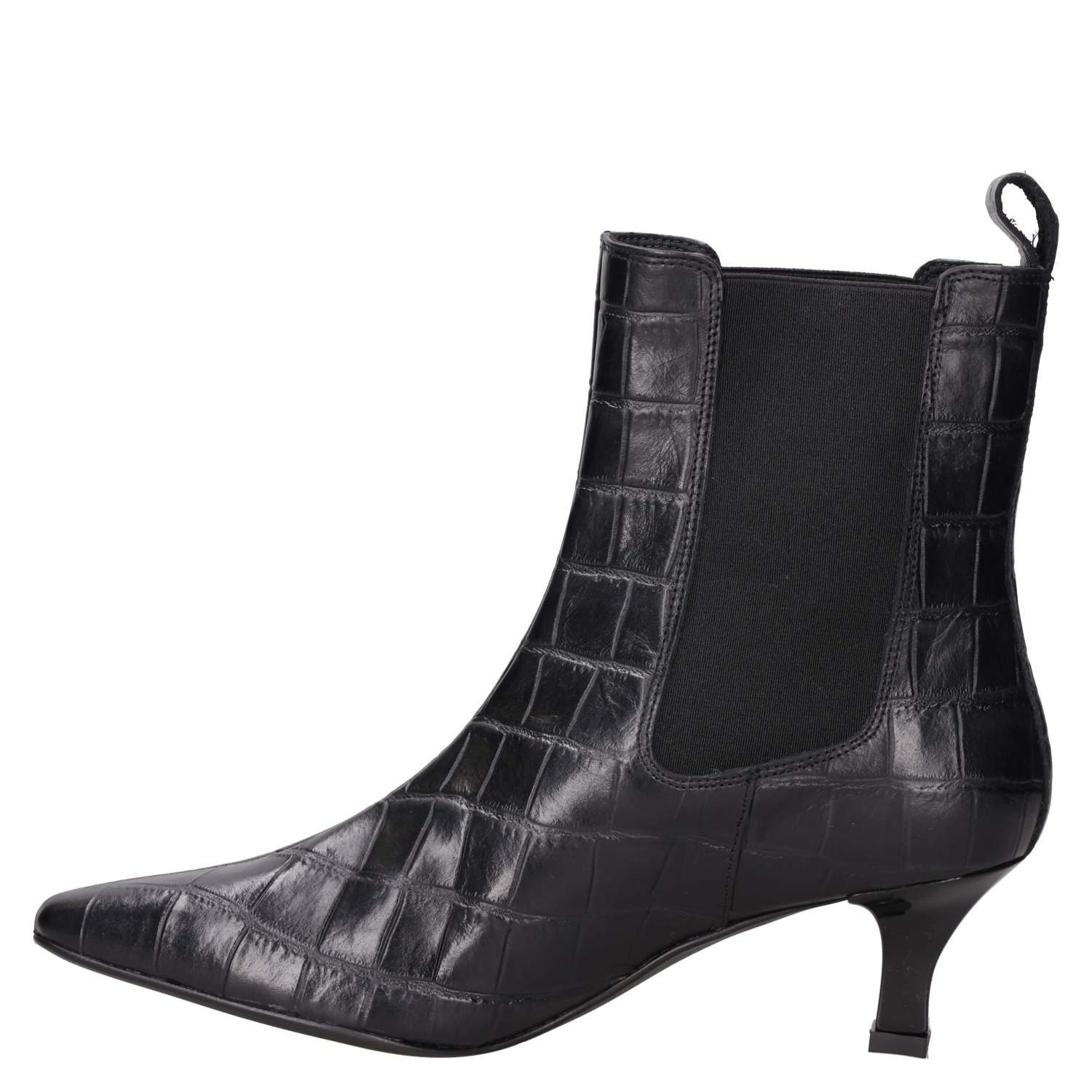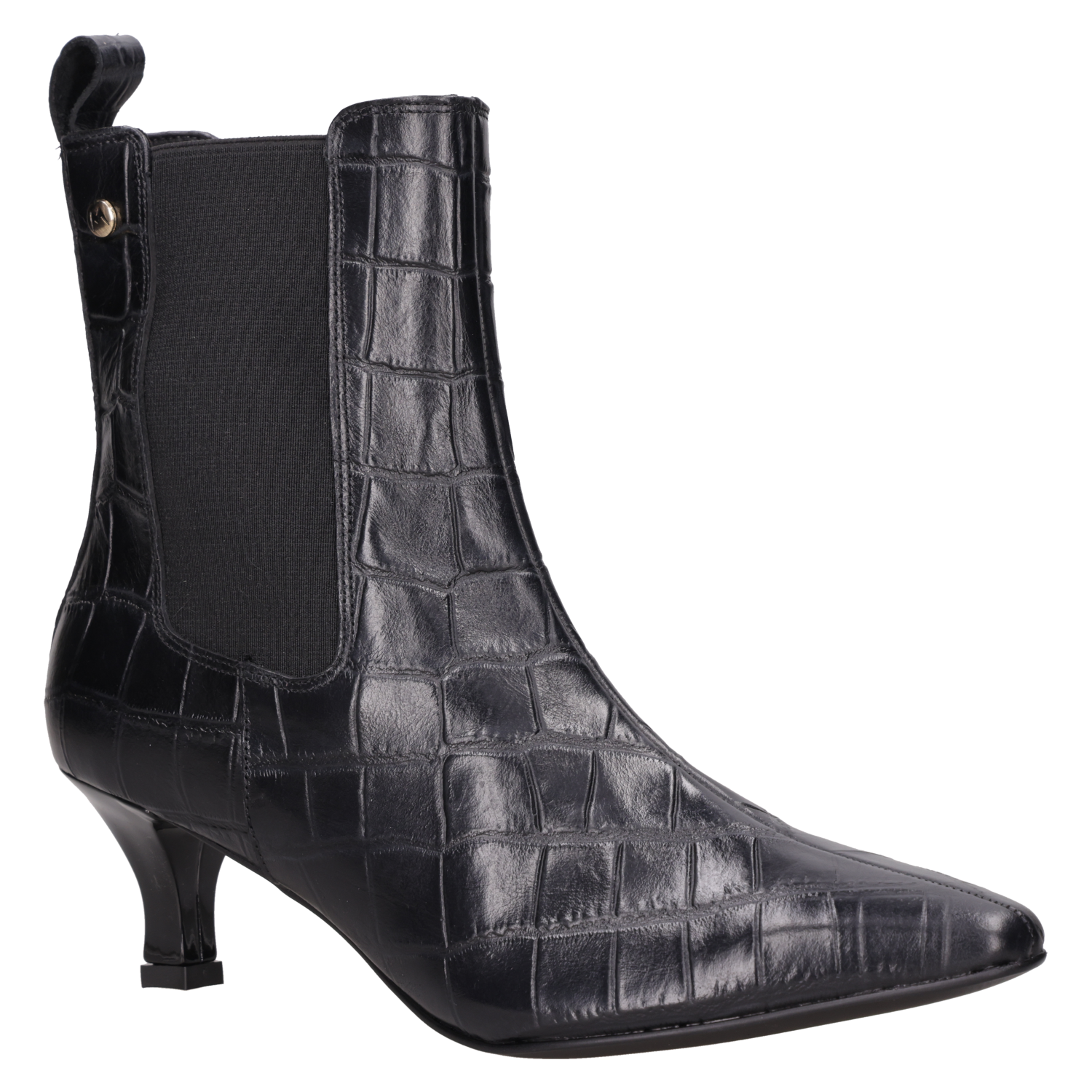 Vista superior del botín negro de cuero, resaltando su diseño fluido y glamour para la mujer contemporánea. Detalle del tirador en el talón del botín negro de cuero, acentuando su elegancia y funcionalidad. "Botín negro tipo Chelsea con punta alargada y tacón ""kitten"", perfecto para un estilo femenino y distintivo. " Vista lateral del botín negro de cuero con panel elástico, diseño sofisticado para un look moderno. Botín negro de cuero grabado efecto piel de cocodrilo, estilo formal para mujer, ideal para ocasiones elegantes.