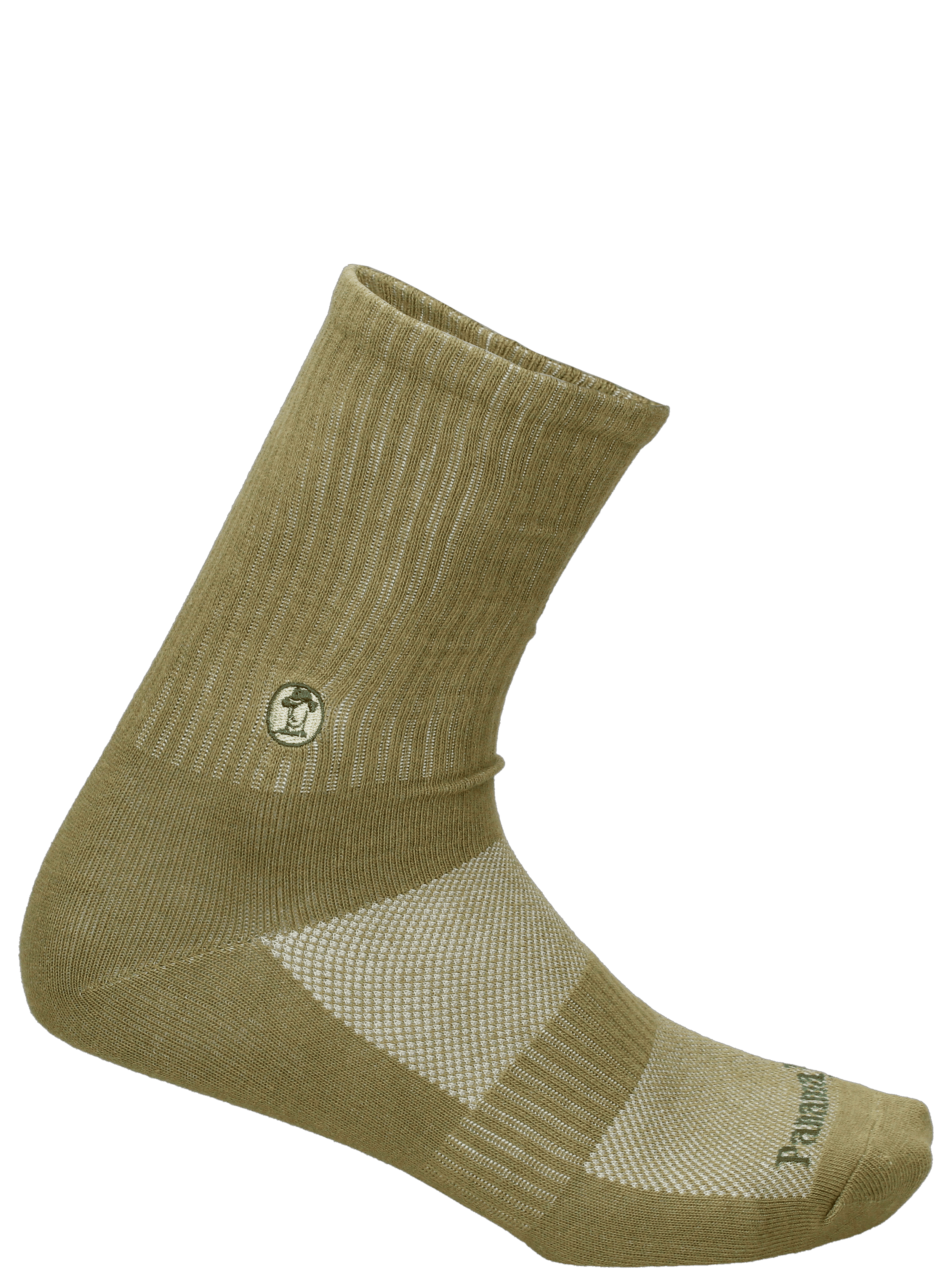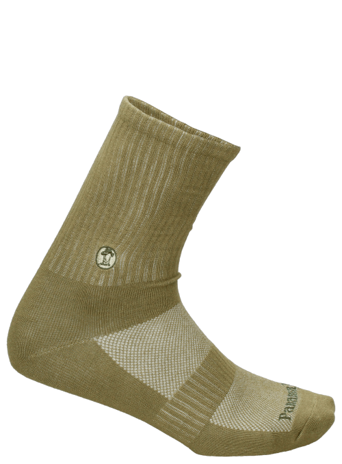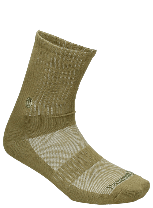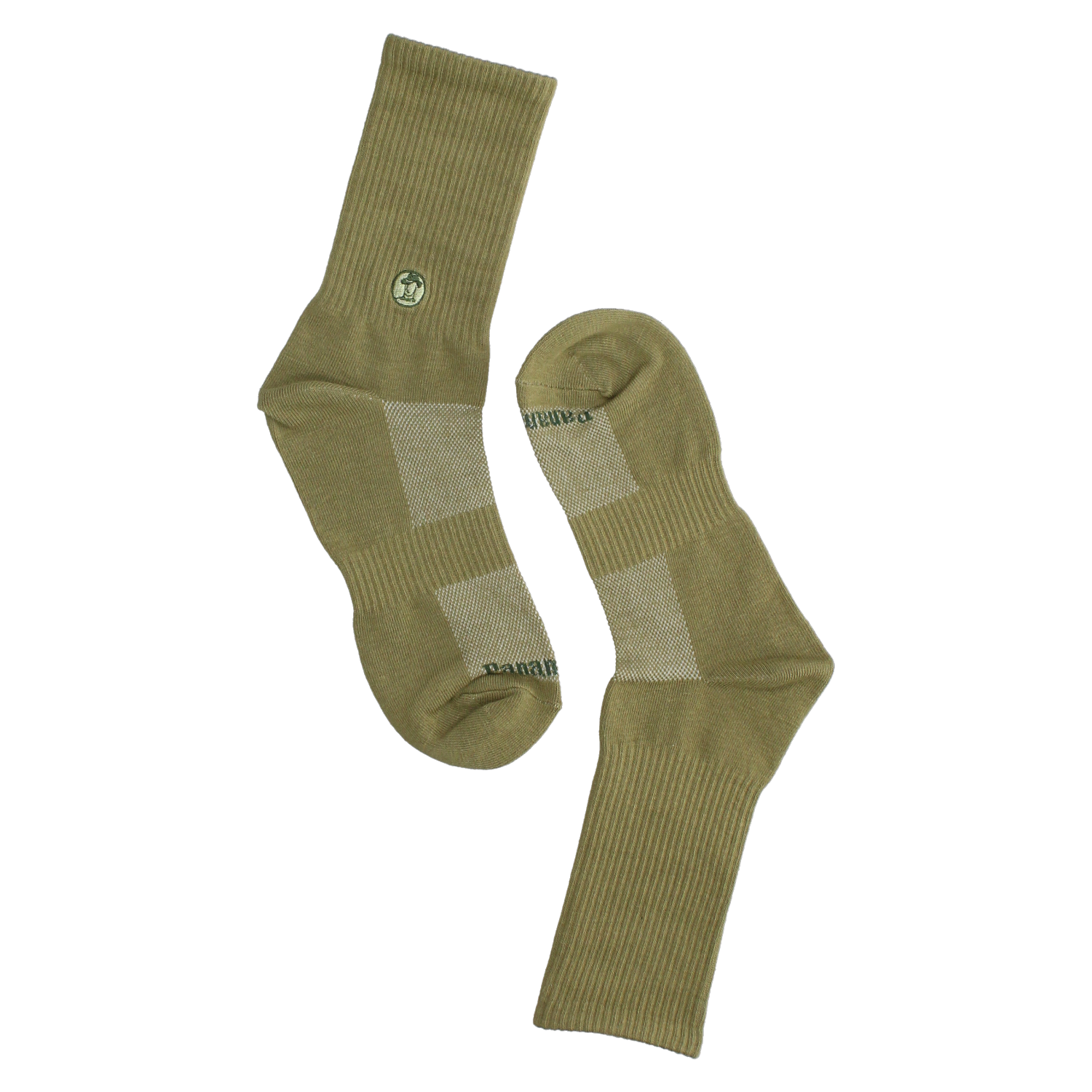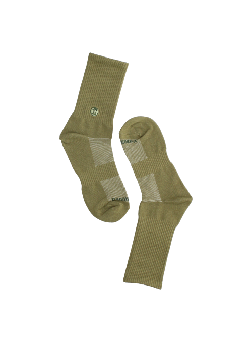 Calcetines unisex de caña media en color oliva, confeccionados en 72% algodón, 25% poliéster y 3% elastano para una sensación suave y un ajuste flexible.