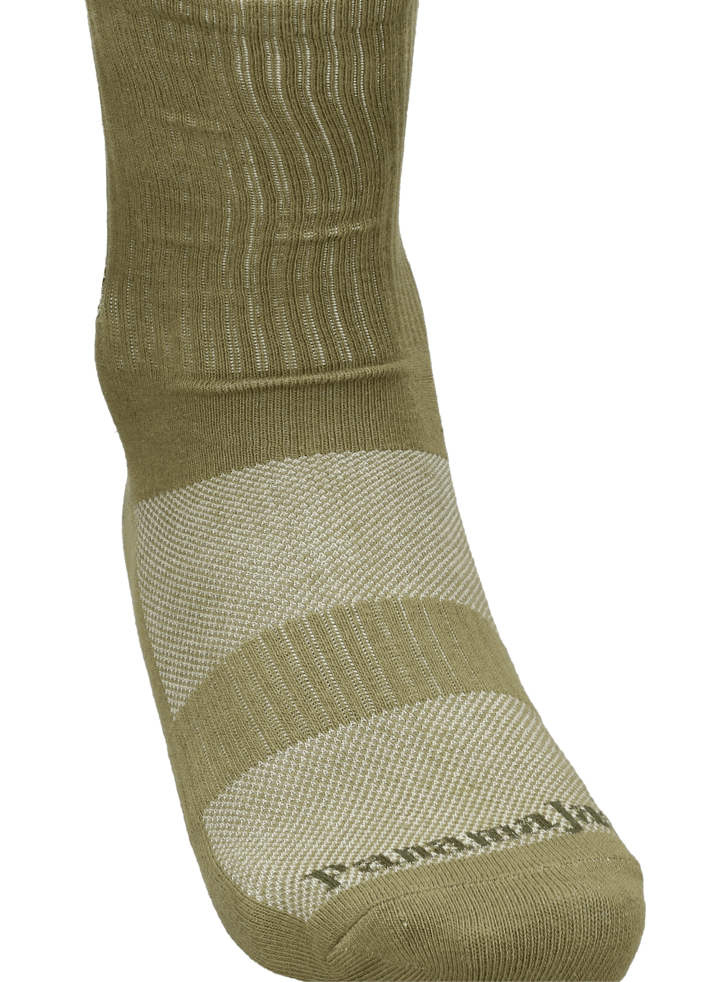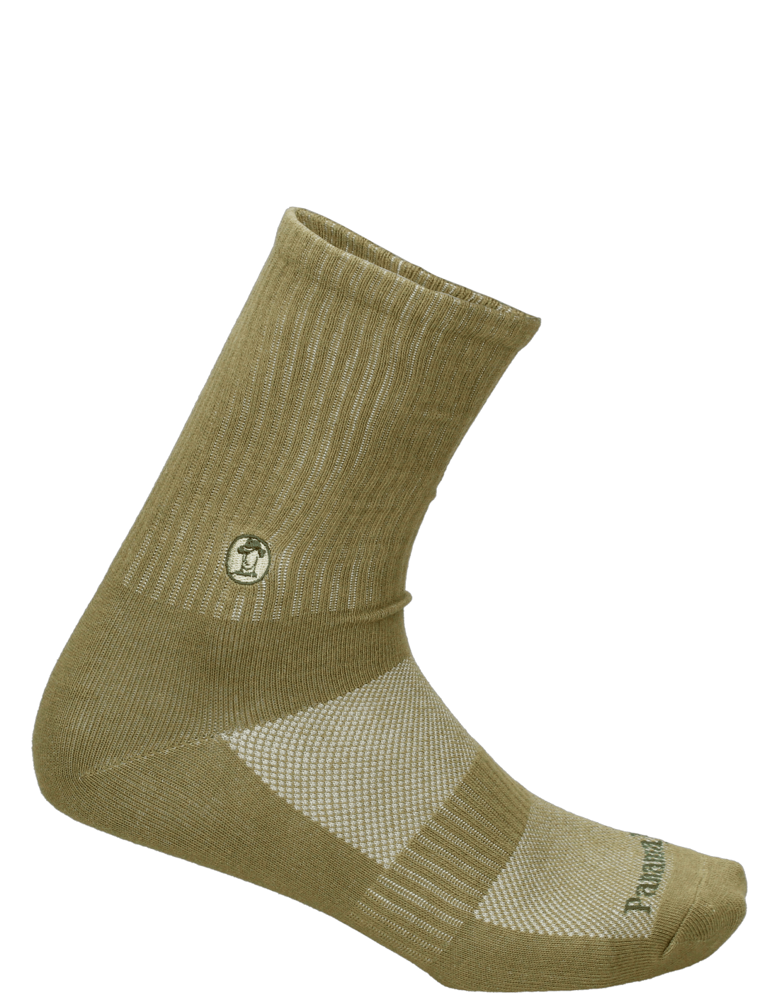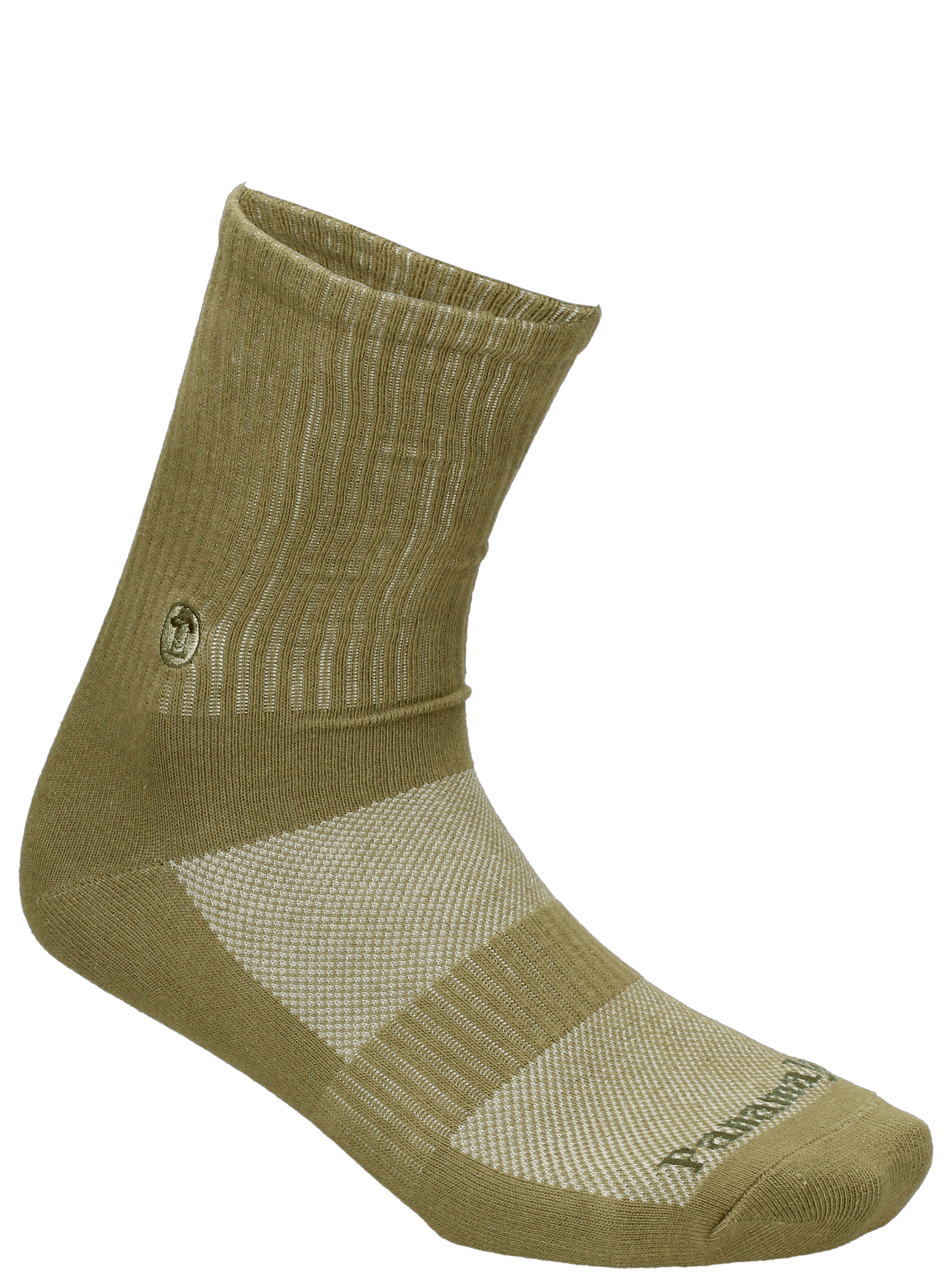 Calcetines unisex de caña media en color oliva, confeccionados en 72% algodón, 25% poliéster y 3% elastano para una sensación suave y un ajuste flexible.