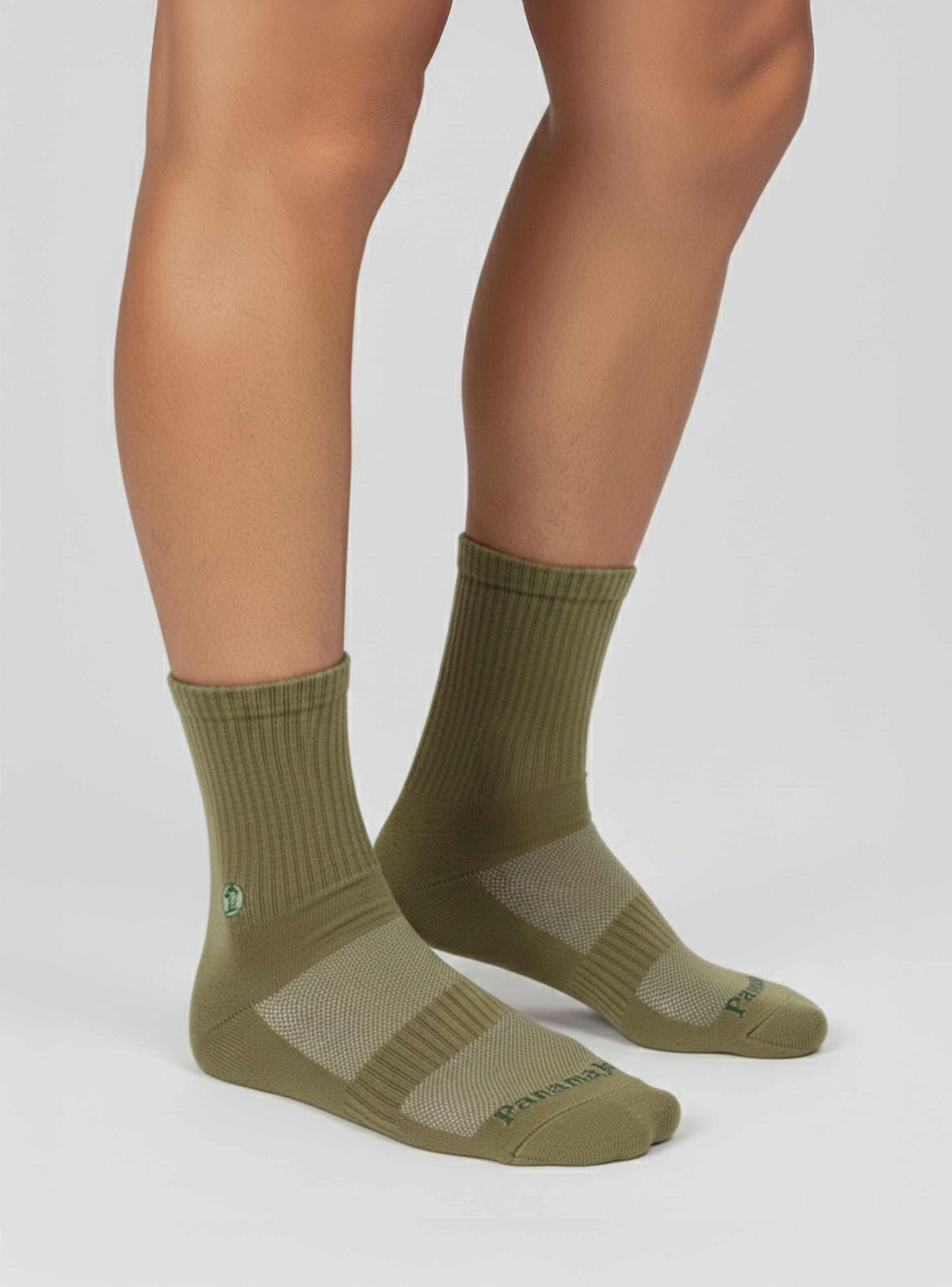 Calcetines unisex de caña media en color oliva, confeccionados en 72% algodón, 25% poliéster y 3% elastano para una sensación suave y un ajuste flexible.
