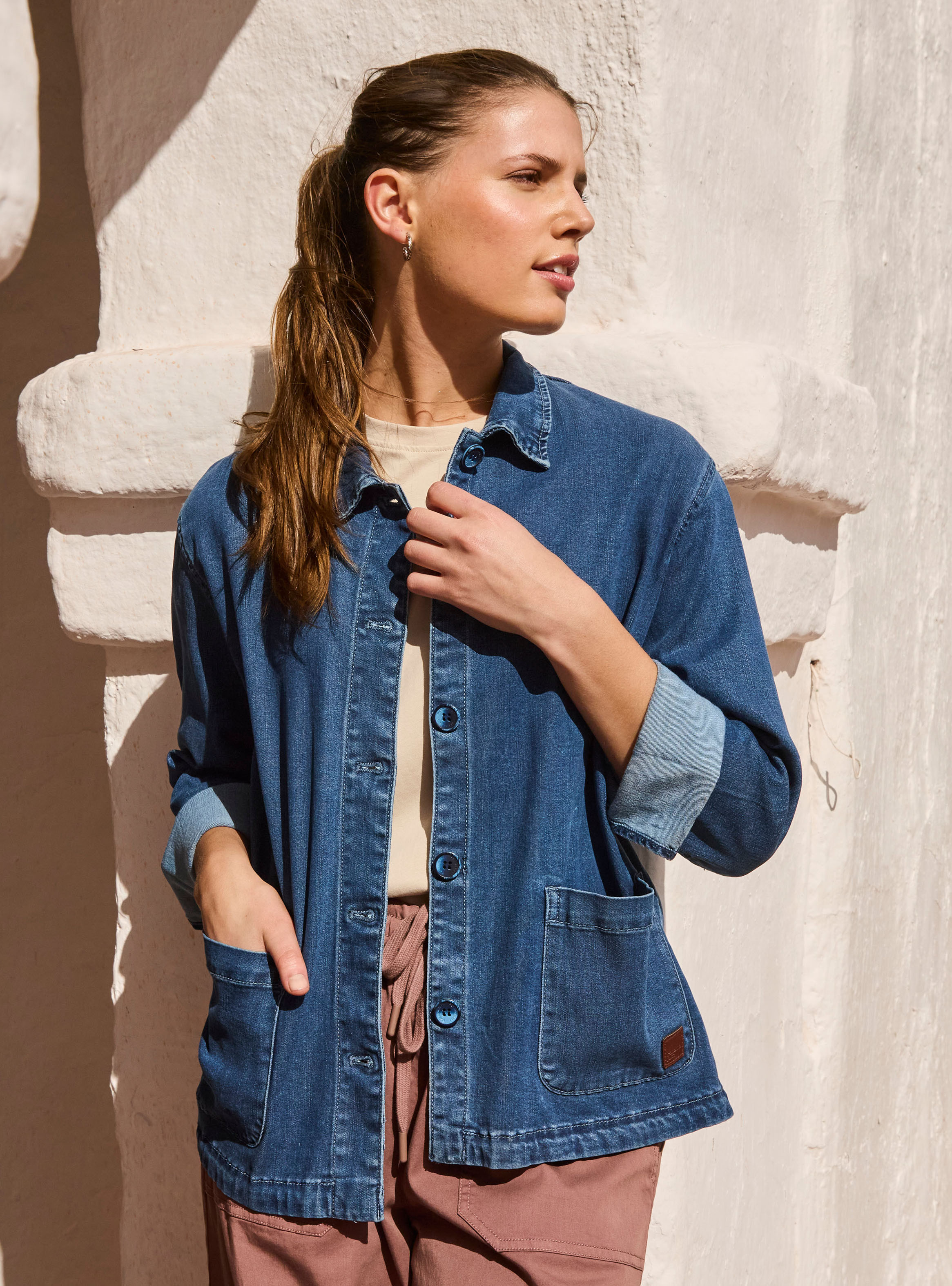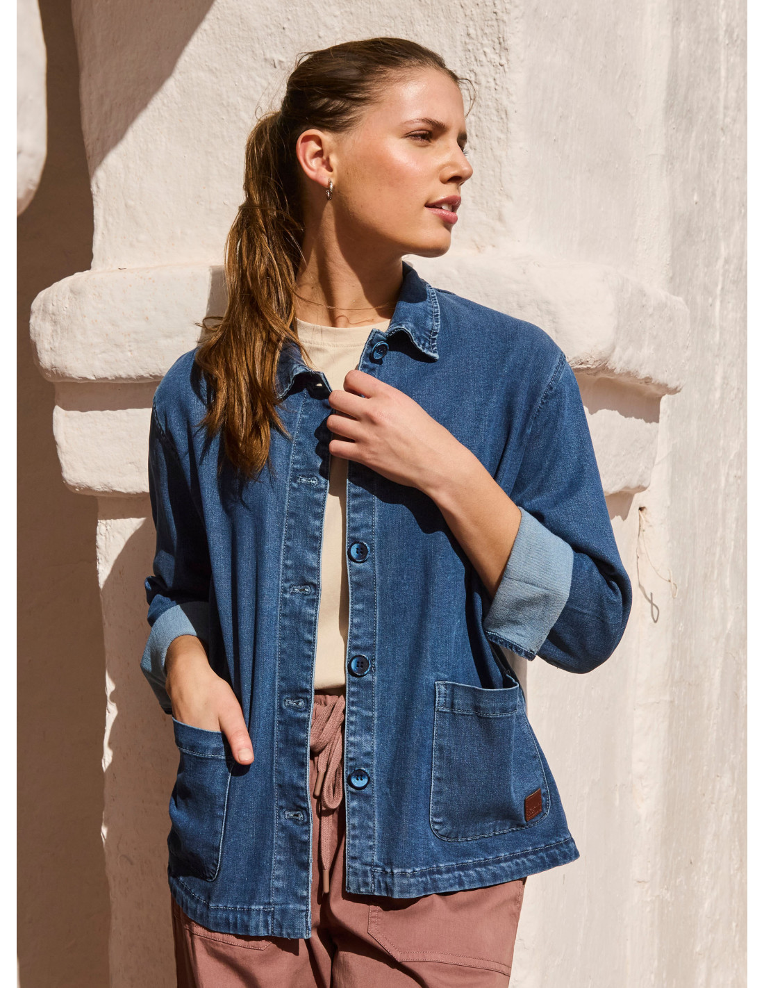 Chaqueta de mujer en color azul, confeccionada en un suave blend de 65% Tencel, 27% poliéster, 7% viscosa y 1% elastano. Su textura fluida y leve elasticidad aportan comodidad y una caída natural, perfecta para un look pulido sin perder movilidad. Un básico contemporáneo para transitar entre estaciones y elevar conjuntos casuales o de oficina.