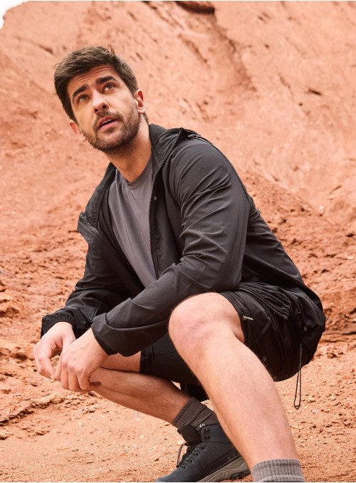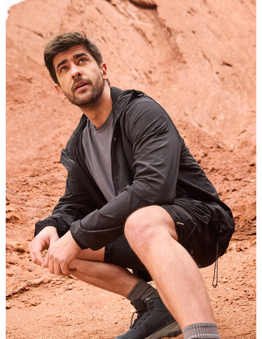 Cortaviento para hombre de estilo minimalista en color negro, con manga larga y corte limpio. Confeccionado en 90% poliamida y 10% elastano, se siente ligero, suave y flexible, acompañando el movimiento y funcionando como capa versátil para el uso diario o salidas urbanas cuando corre brisa.