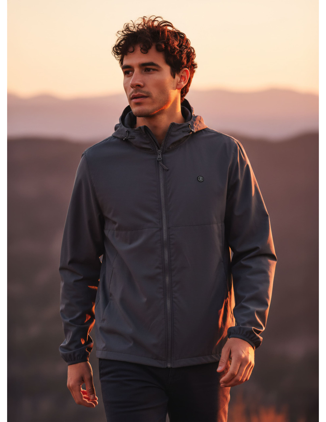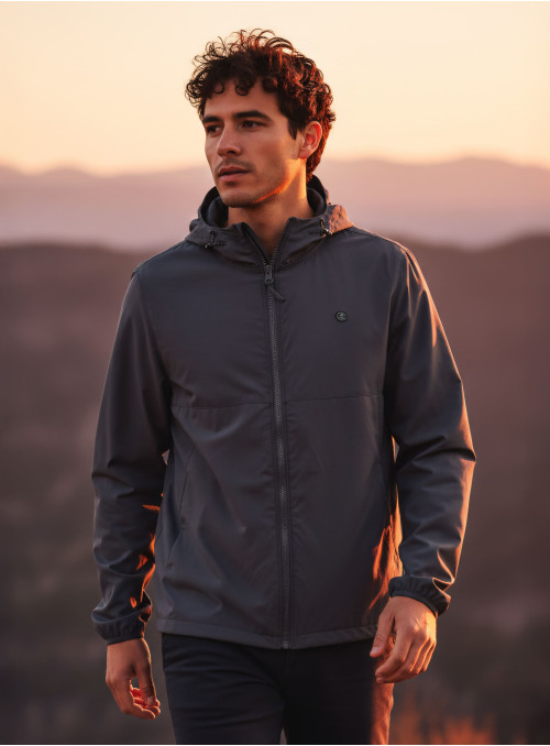 Este cortaviento para hombre en color gris está confeccionado en un tejido liviano y flexible (90% poliamida, 10% elastano) que facilita el movimiento. De diseño limpio y urbano, es una capa versátil para enfrentar el viento y complementar tus looks diarios o salidas al aire libre.