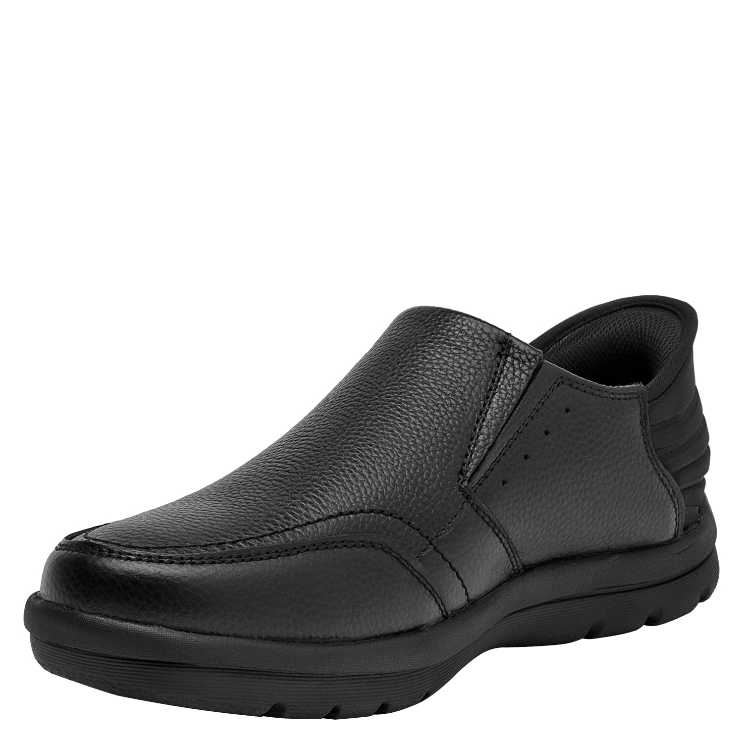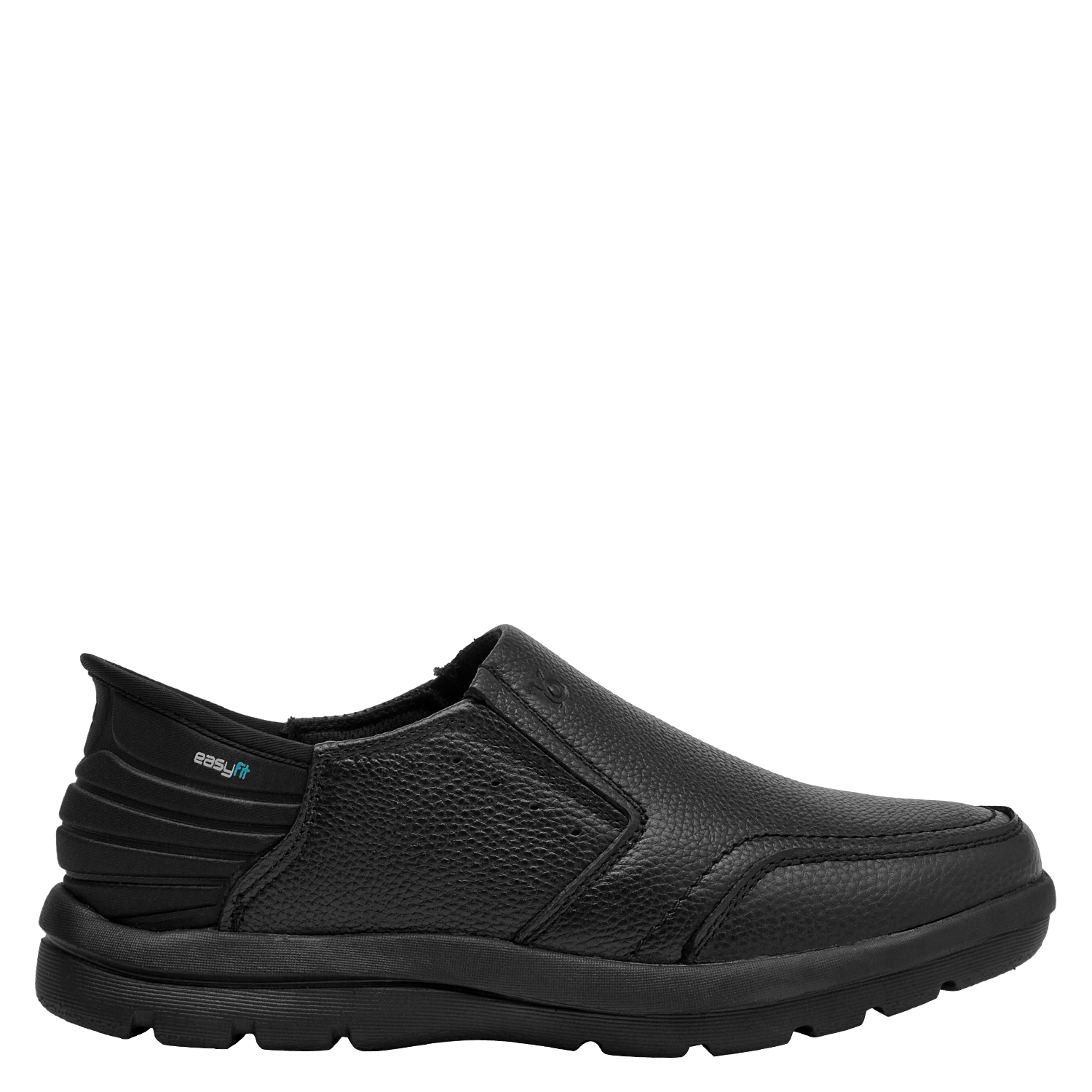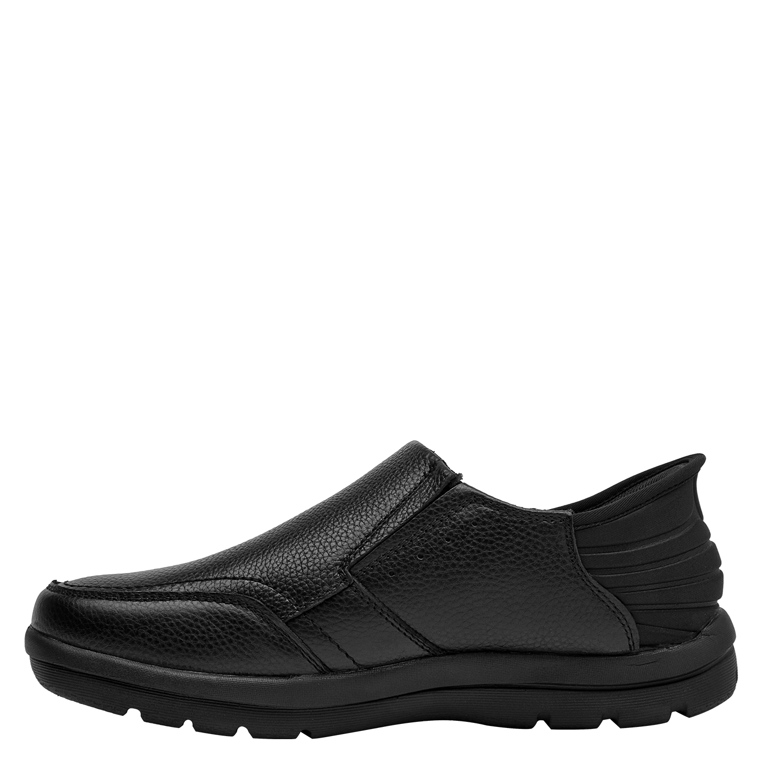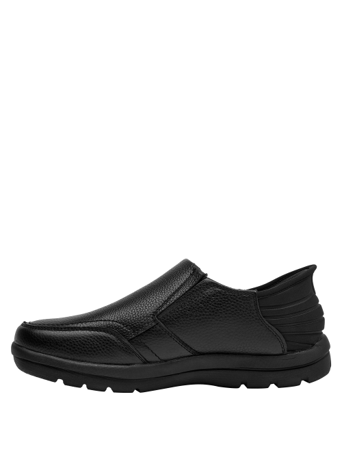 Zapato casual de cuero para hombre en color negro, de punta redonda y taco plano de 3 cm. Su capellada de cuero aporta un look pulcro y versátil, mientras el forro de mesh suma ligereza interna. De silueta atemporal y acabado minimalista, es una opción práctica para el día a día y ocasiones informales donde buscas discreción y comodidad sin complicaciones.